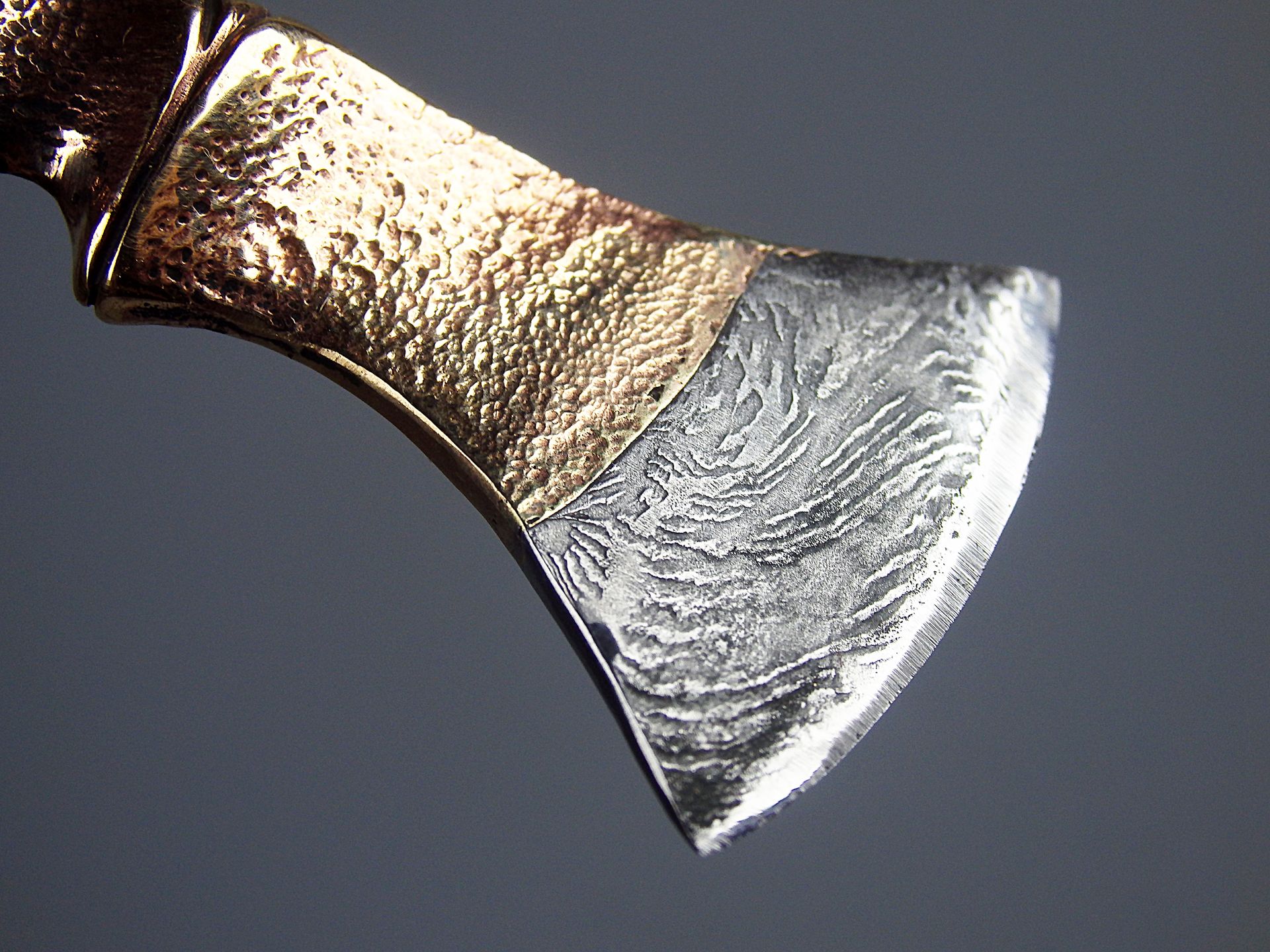 Small bronze pipe in the form of a medieval ax with a Ukrainian trident on the lid. The ax blade is made of Damascus steel and therefore requires careful handling (sharp edge). The stand is made of wood (birch burl). The mouthpiece is made of copper (with copper wire), it is screwed on, can have a length (from 7 to 20 cm) at the request of the buyer. The pipe is working, not decorative, the model is tested by the master.