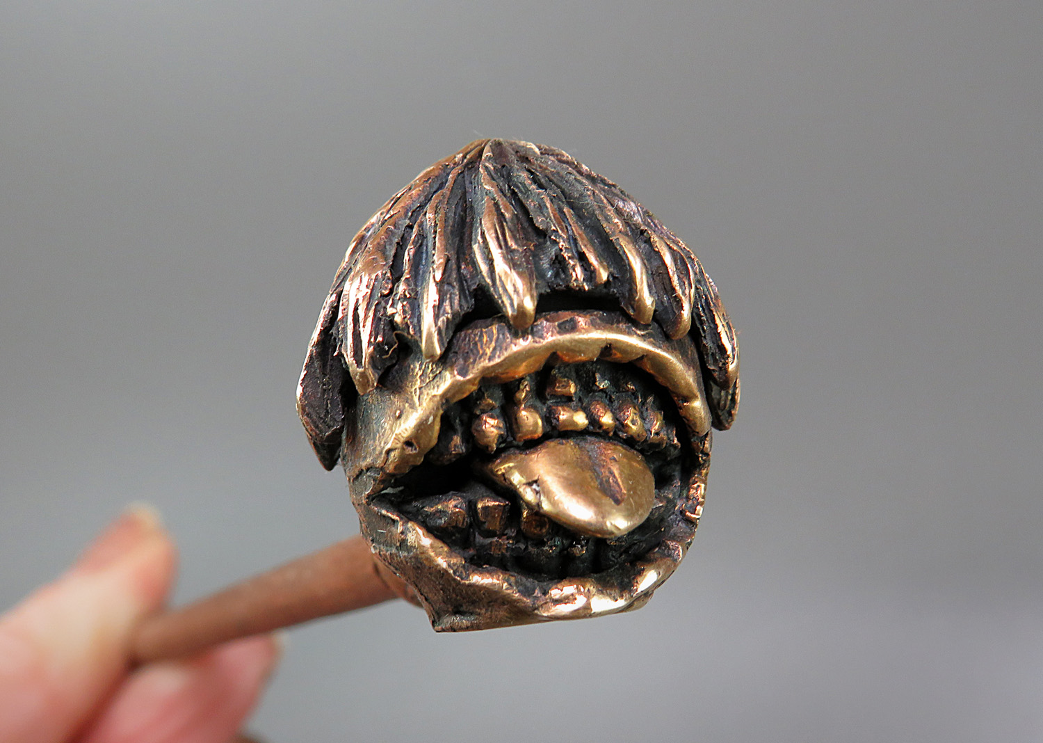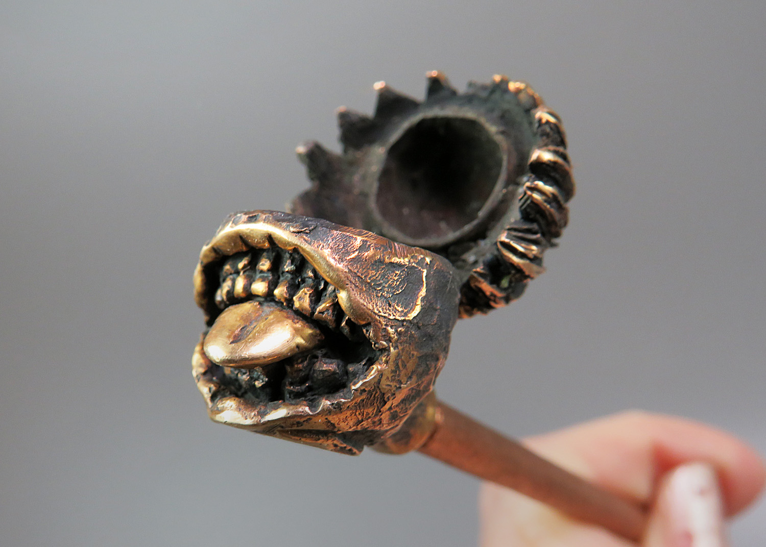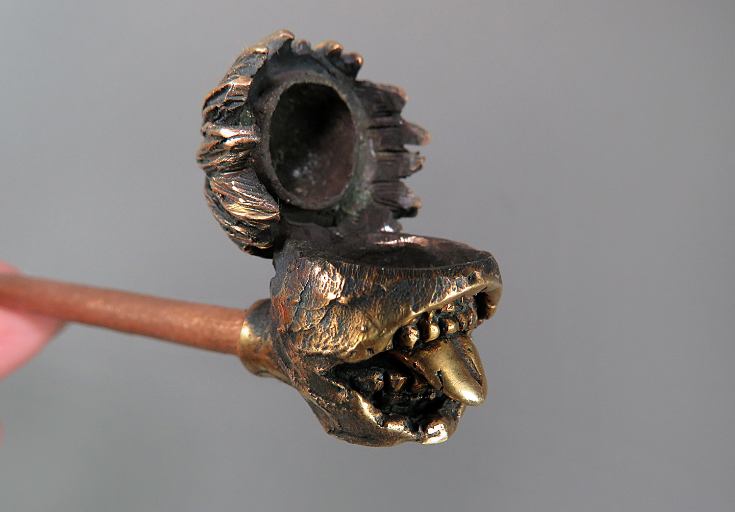 Bronze pipe in the form of a strange and slightly creepy urban dark fantasy character. He has no face, but has a huge toothy mouth with a long tongue, and he will obviously appeal to connoisseurs of werewolf monsters, mysticism, and modern Japanese mythology.