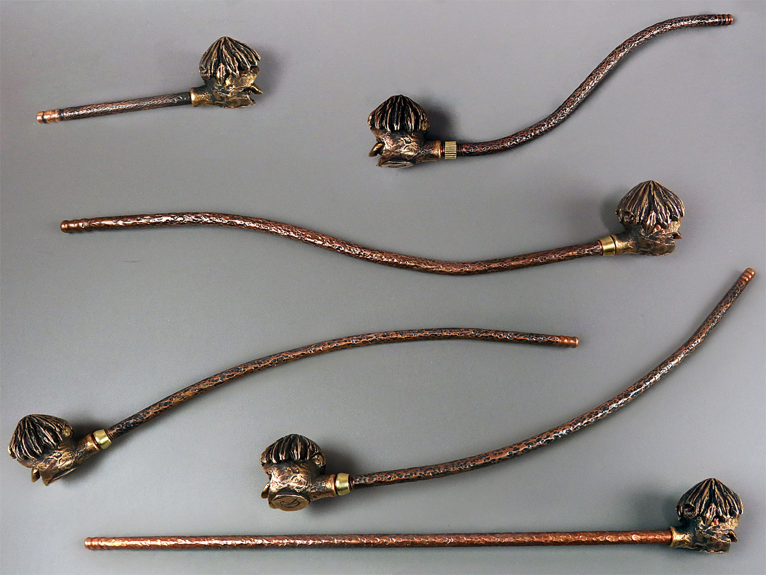 The mouthpiece is made of copper, it is screwed on, can have a length (from 3 to 30 cm) and a shape at the request of the buyer. The pipe is working, not decorative, the model is tested by the master.