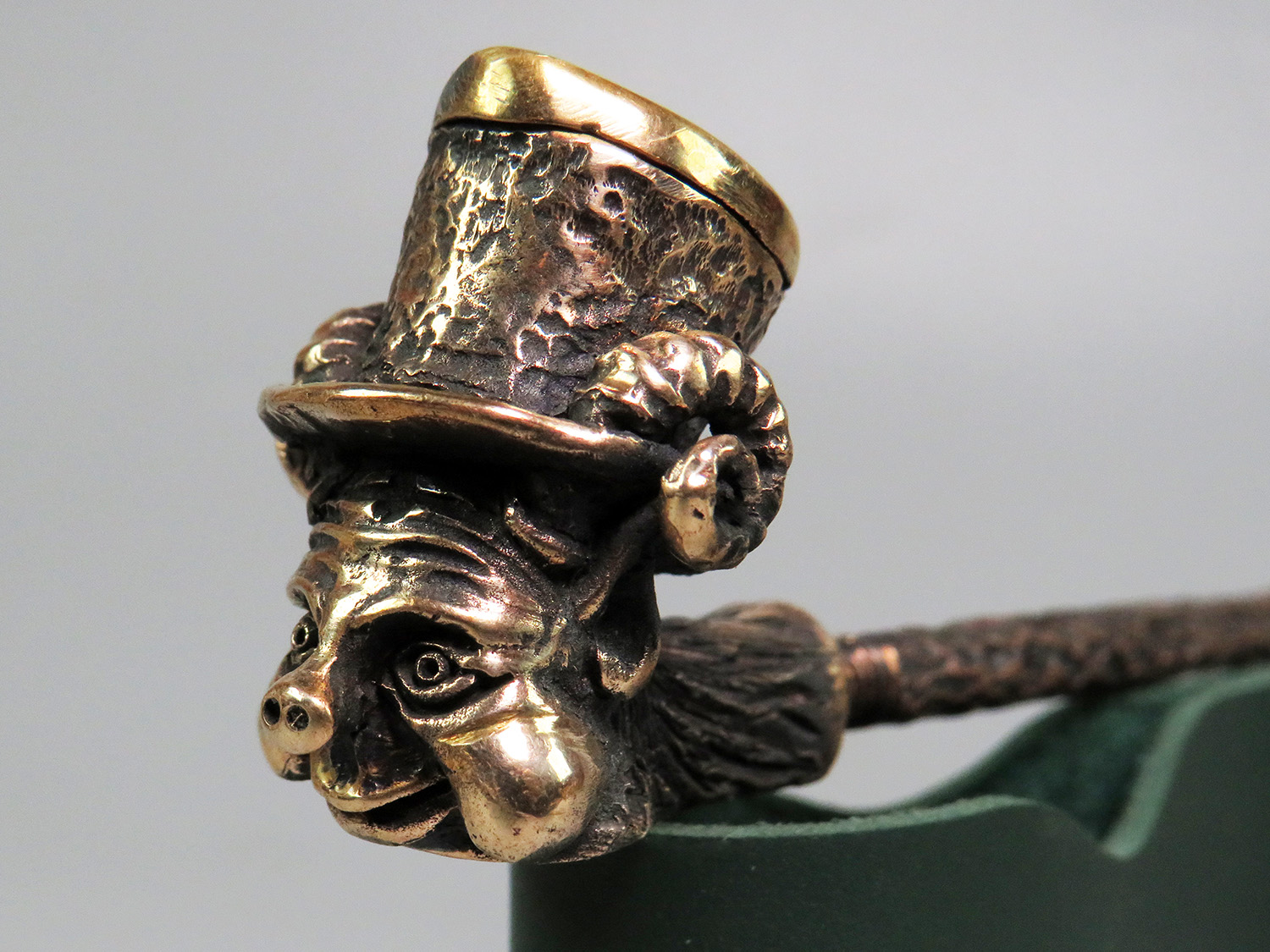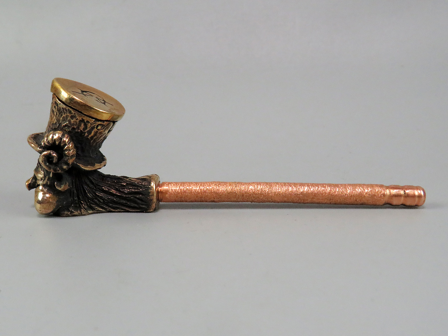 Bronze smoking pipe featuring a smiling Kobold — a character from German and Scandinavian mythology. This urbanized imp has donned a top hat and fled the rural backcountry for the industrial city, yet he never misses a chance to play tricks on unsuspecting folk.