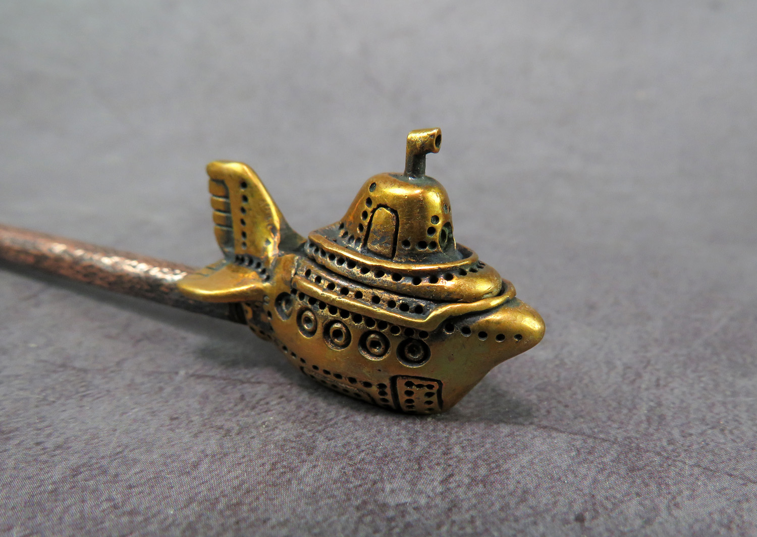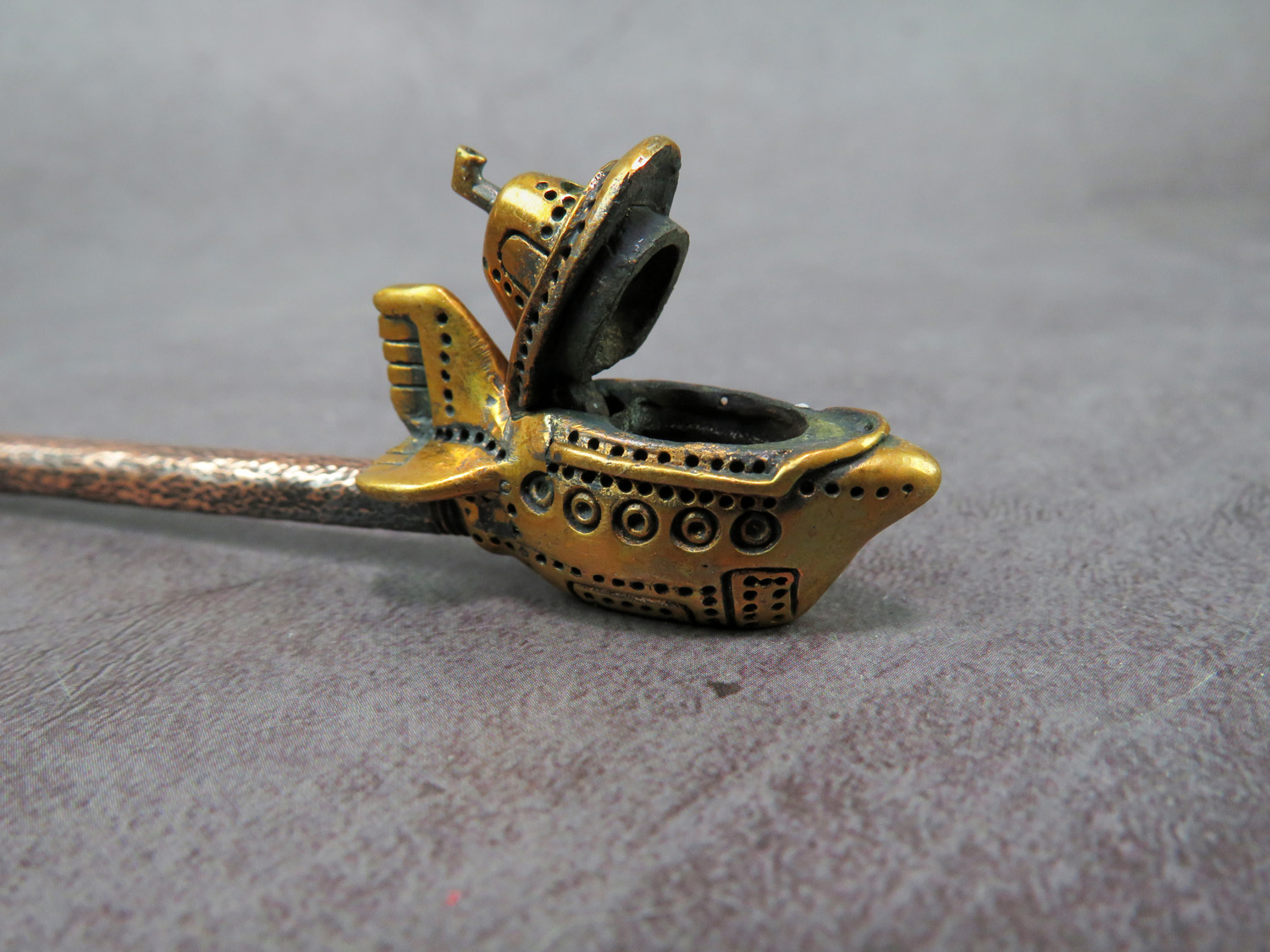 This cute little bronze pipe shaped like a submarine will make a great gift for hippies, flower children, baby boomers, and fans of 60s rock music. The mouthpiece is made of copper, it is screwed on, can have a length (from 3 to 30 cm) and a shape at the request of the buyer. Note! When choosing a mouthpiece, keep in mind that this pipe can stand on a plane only with straight mouthpiece.