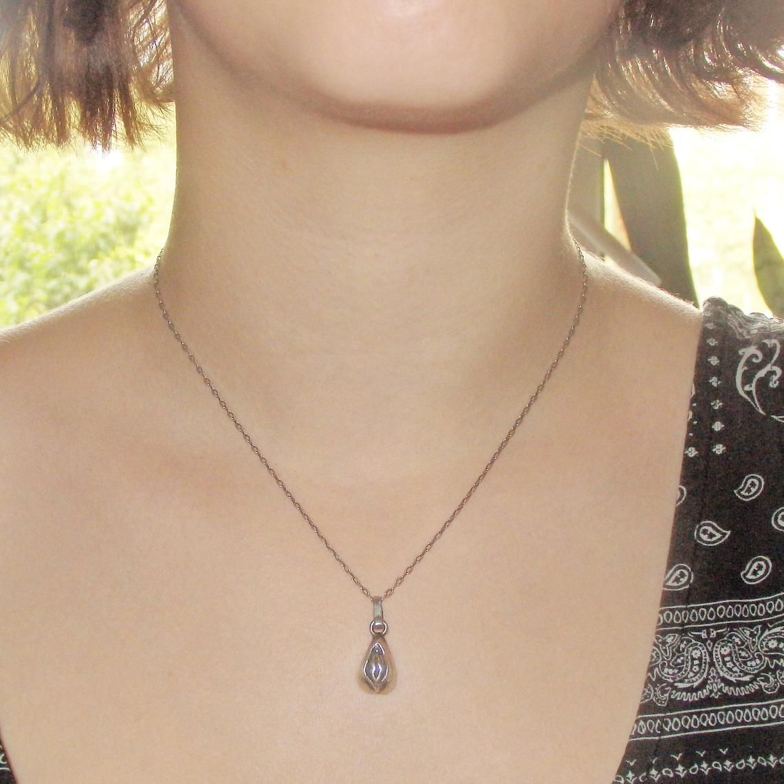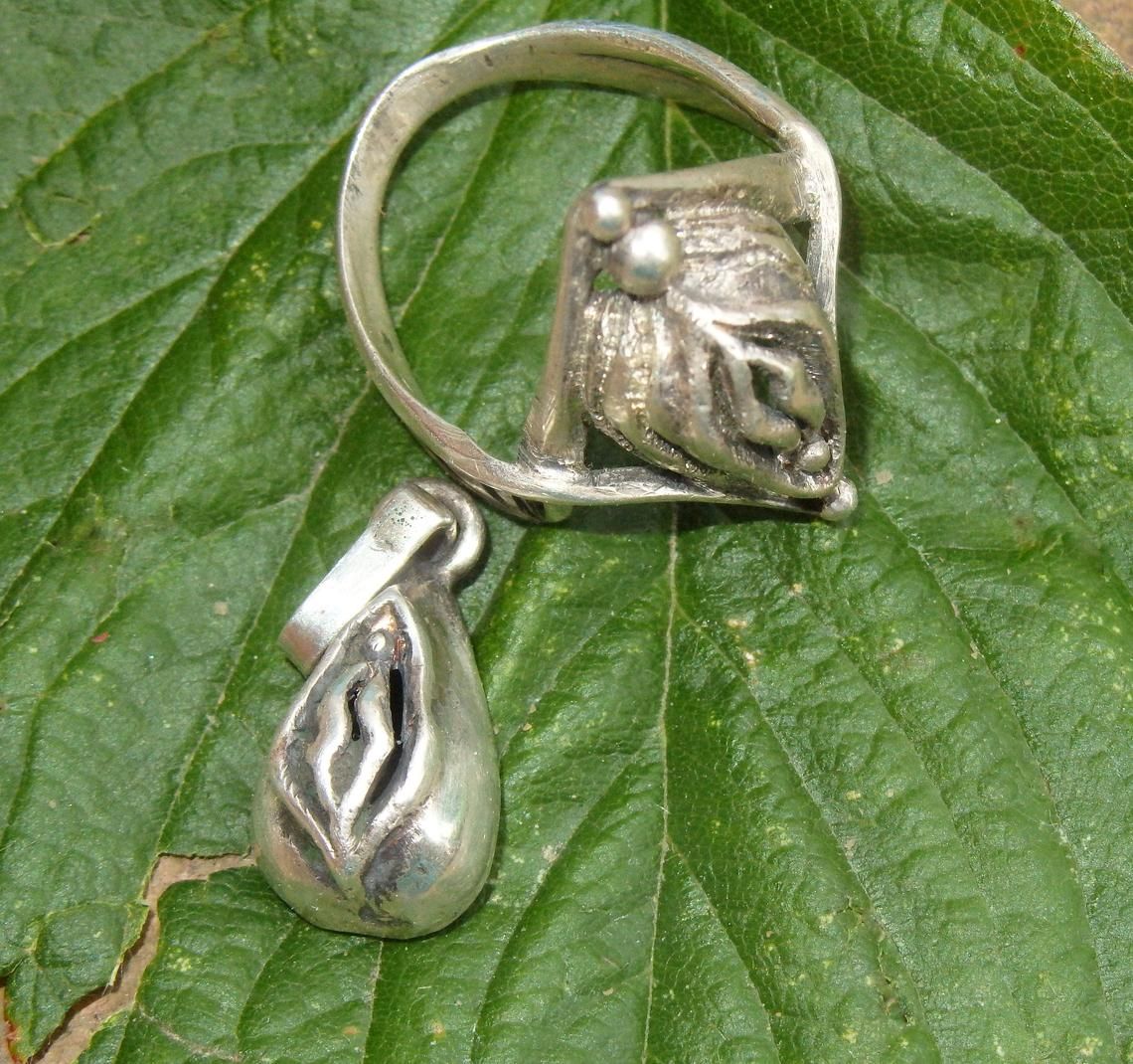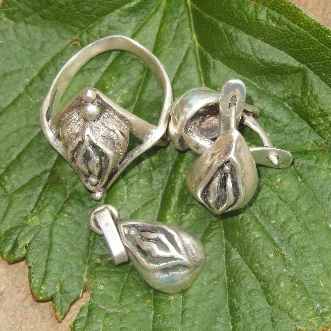 Silver set (earrings, ring and pendant) in the shape of a vagina.