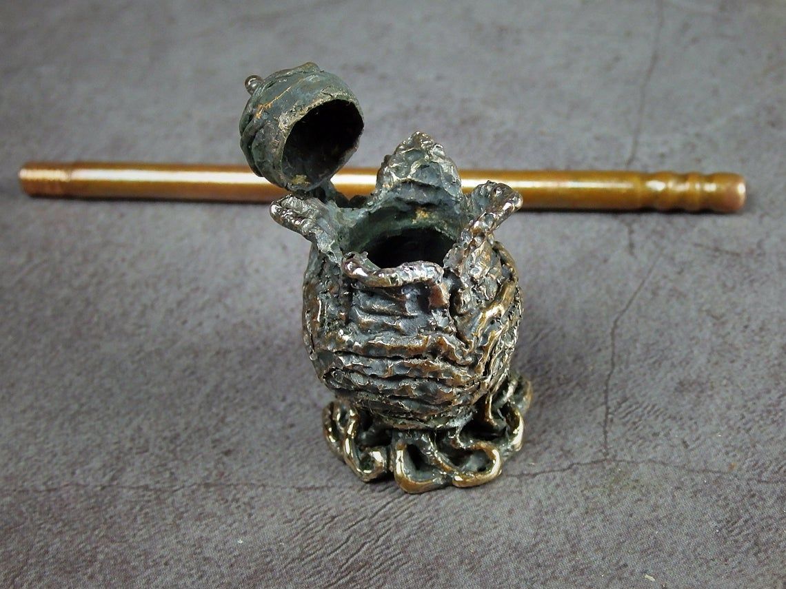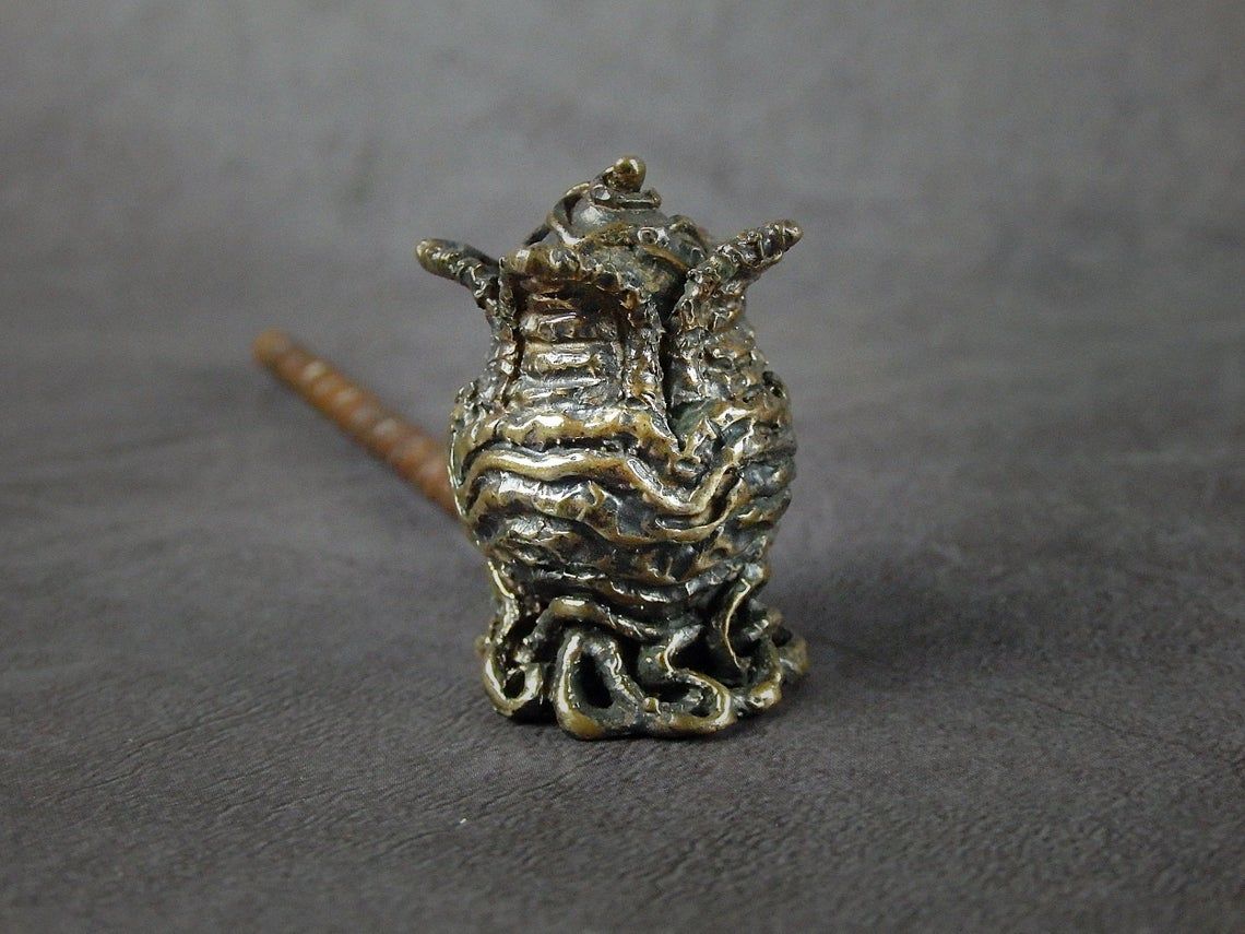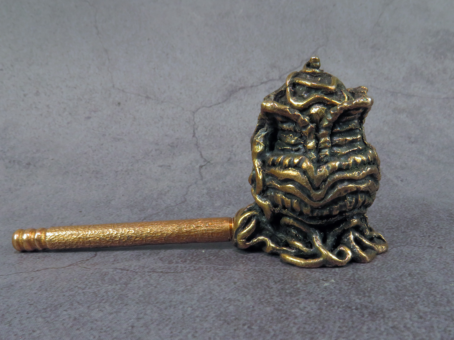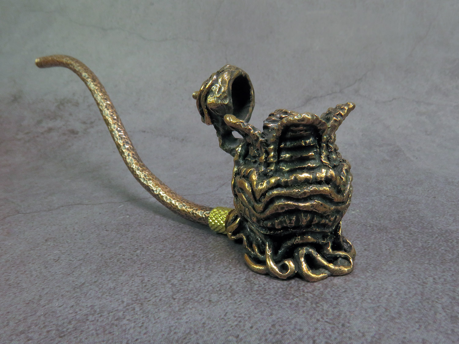 Giger style bronze smoking pipe with bowl in the shape of an Alien's egg. The egg has an opening lid and this is not only a smoking accessory, but also a wonderful souvenir. The mouthpiece is made of copper, it is screwed on, can have a length (from 3 to 30 cm) and a shape at the request of the buyer. The pipe is working, not decorative, the model is tested by the master.