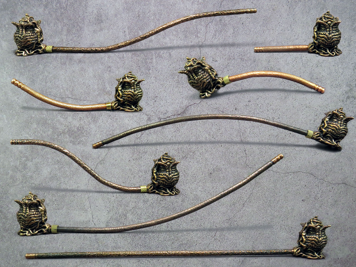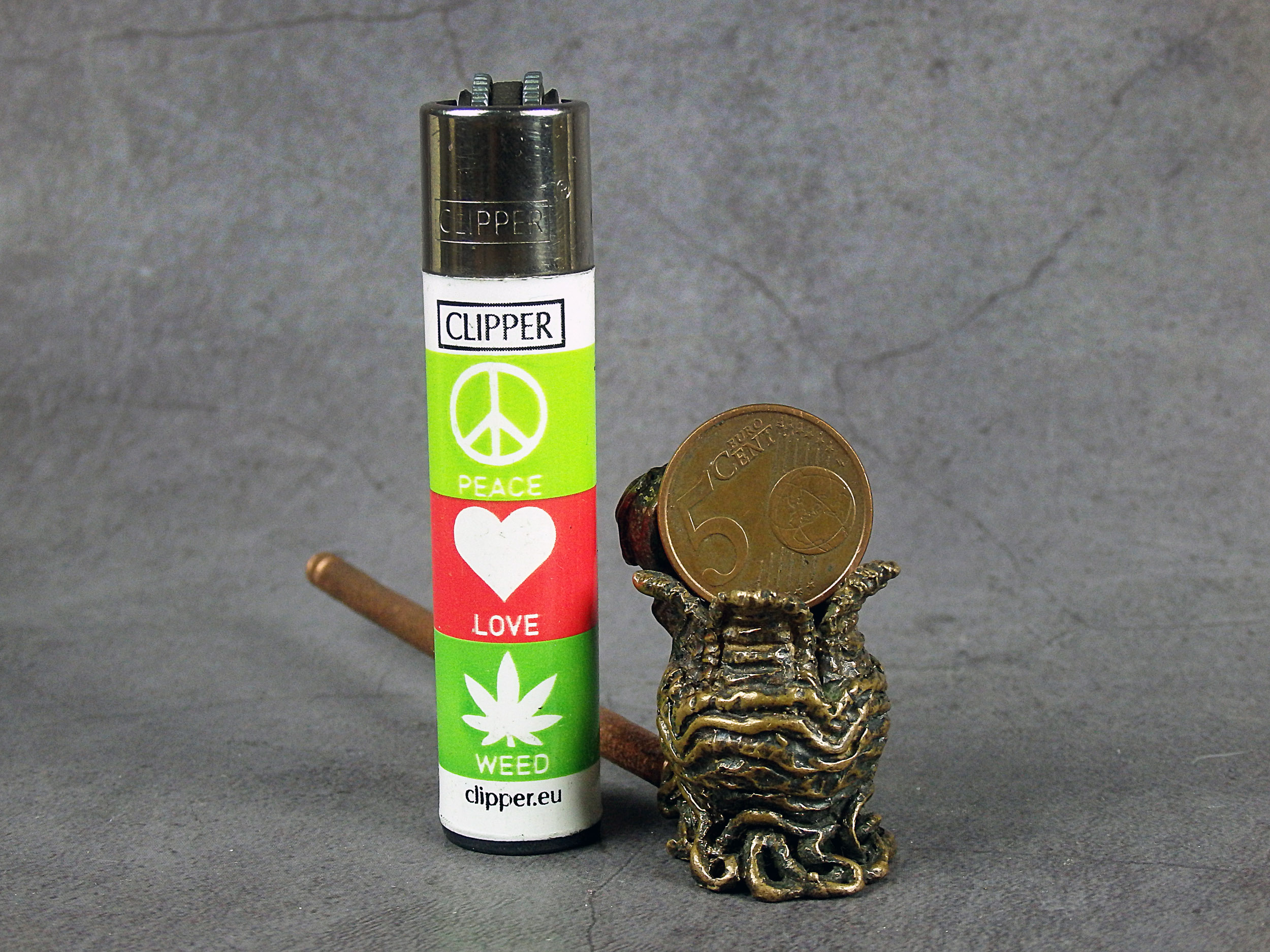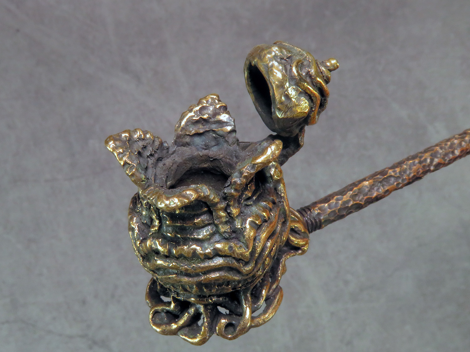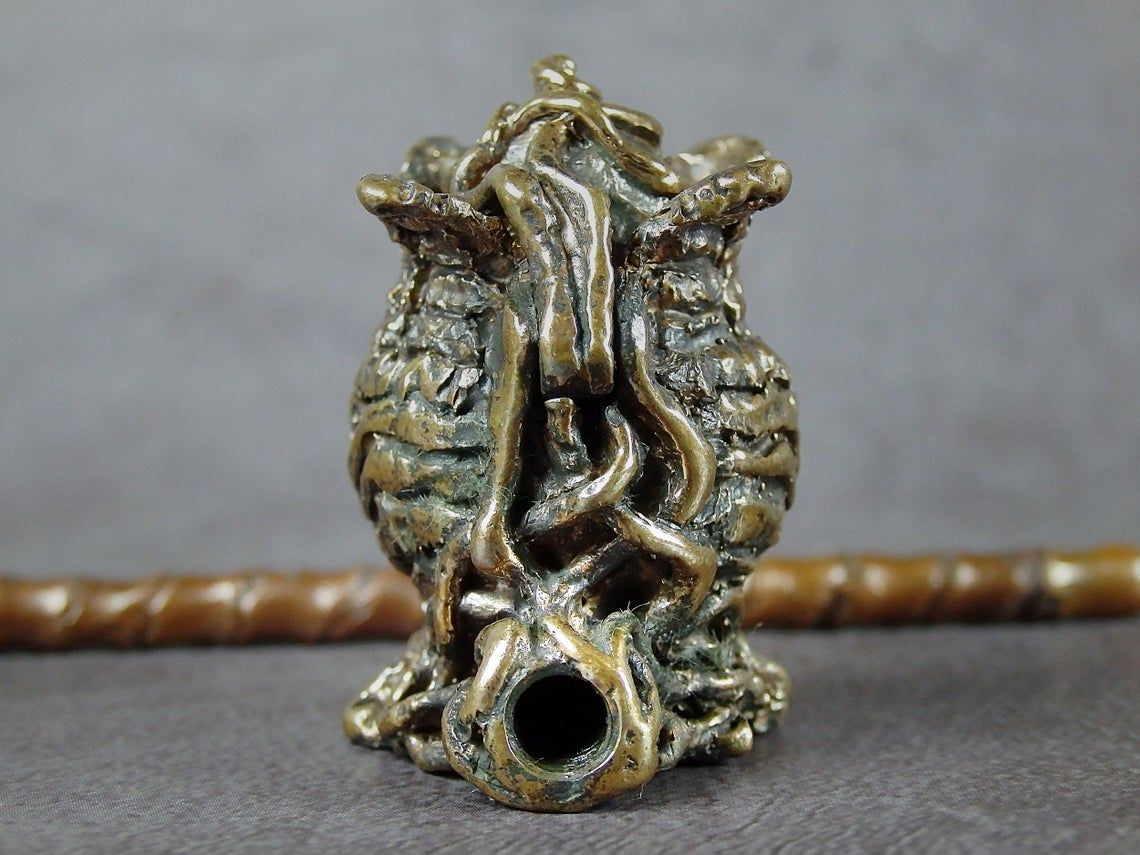 Giger style bronze smoking pipe with bowl in the shape of an Alien's egg. The egg has an opening lid and this is not only a smoking accessory, but also a wonderful souvenir. The mouthpiece is made of copper, it is screwed on, can have a length (from 3 to 30 cm) and a shape at the request of the buyer. The pipe is working, not decorative, the model is tested by the master.