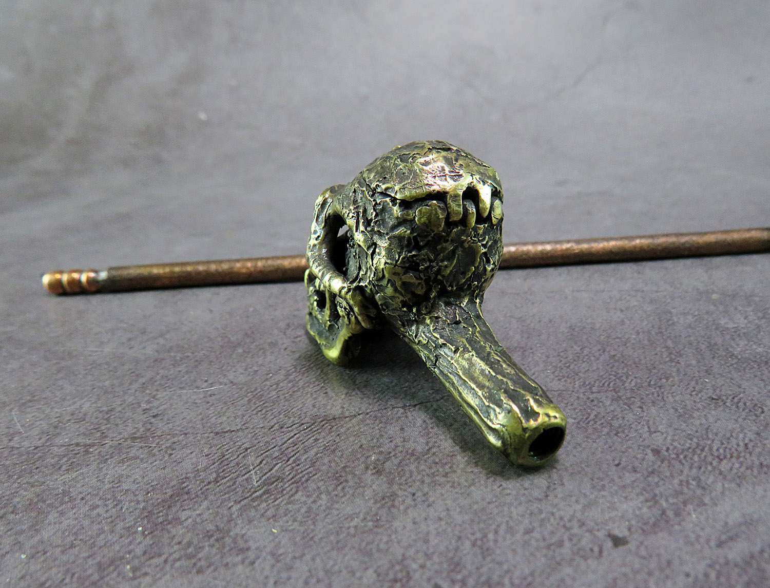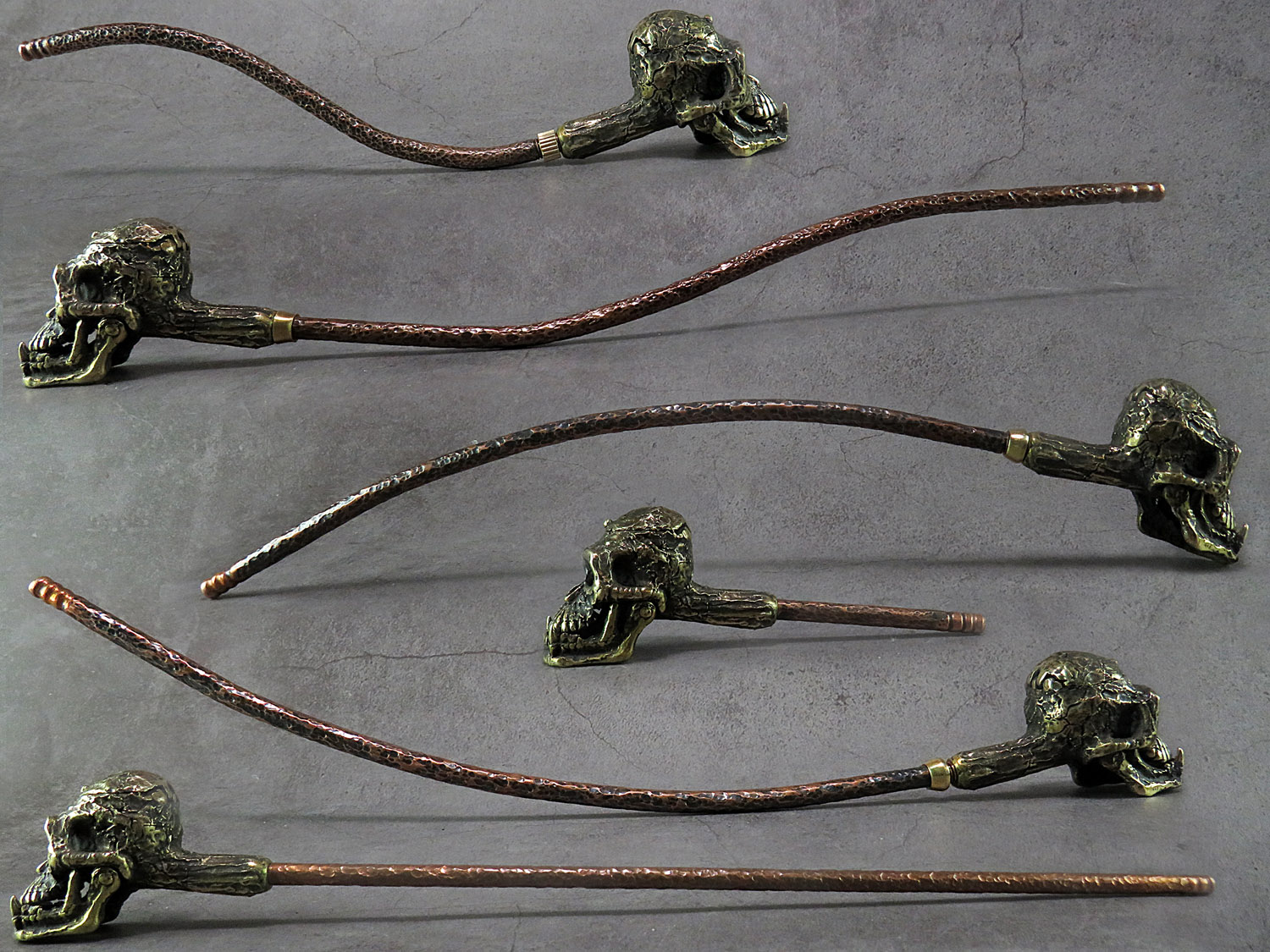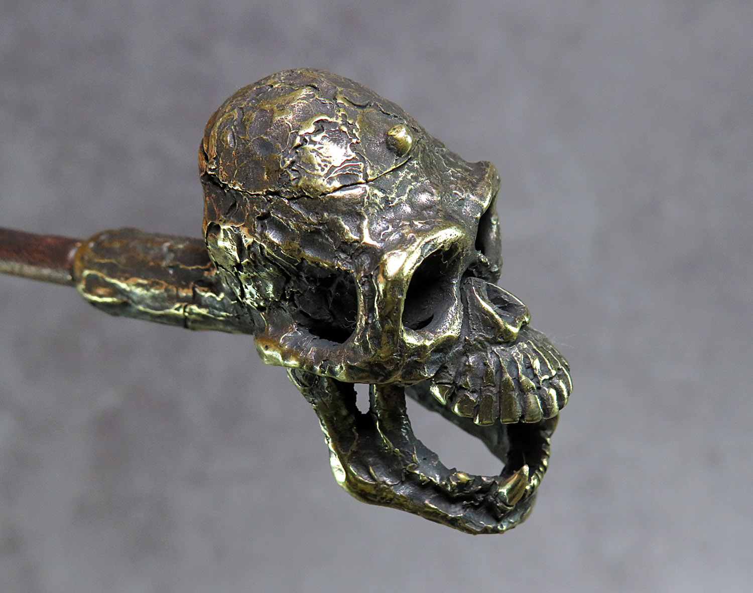 Bronze smoking pipe with a bowl in the form of a skull of a non-existent ancient man, a missing link in evolution. The skull has an opening lid and a movable lower jaw, so this is not only a smoking accessory, but also a wonderful souvenir. The mouthpiece is made of copper, it is screwed on, can have a length (from 3 to 30 cm) and a shape at the request of the buyer. The pipe is working, not decorative, the model is tested by the master.