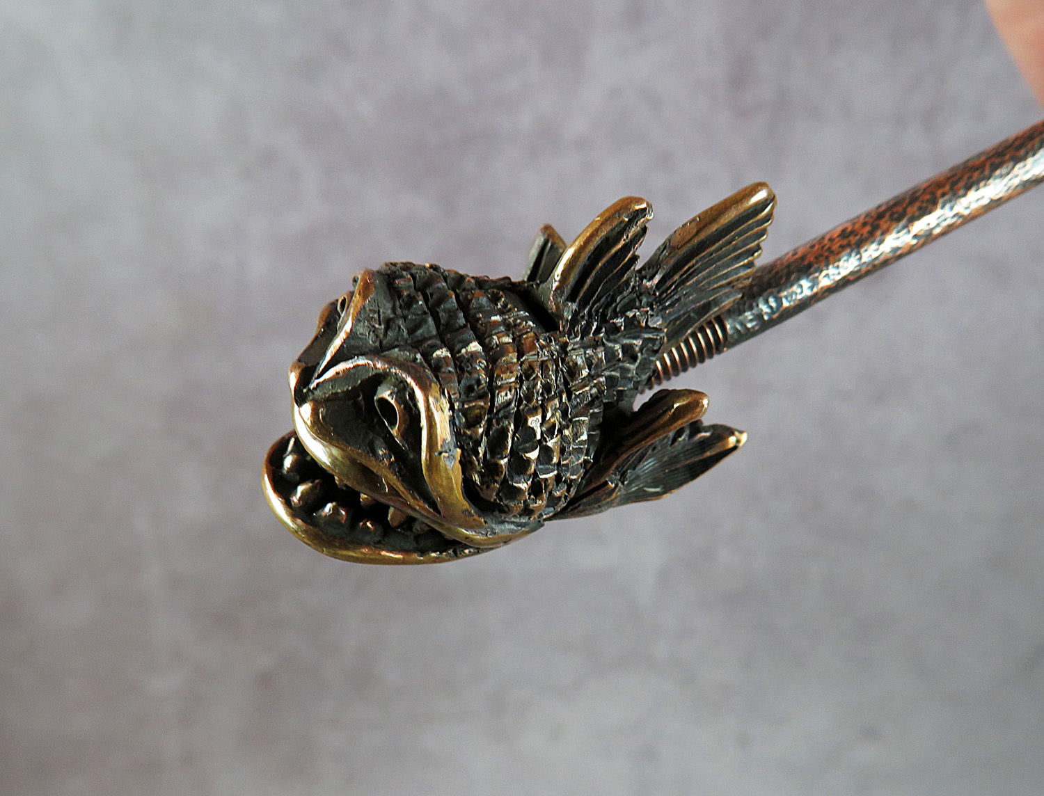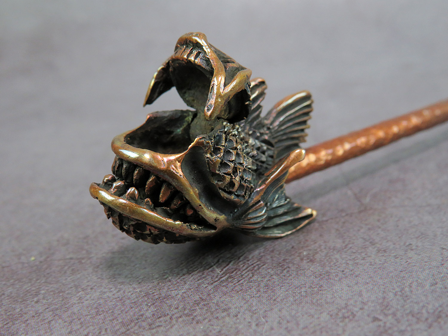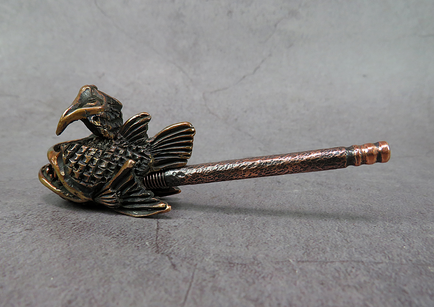 A handmade smoking pipe in the form of an evil toothy sea creature. The mouthpiece is made of copper, it is screwed on, can have a length (from 3 to 30 cm) and a shape at the request of the buyer.