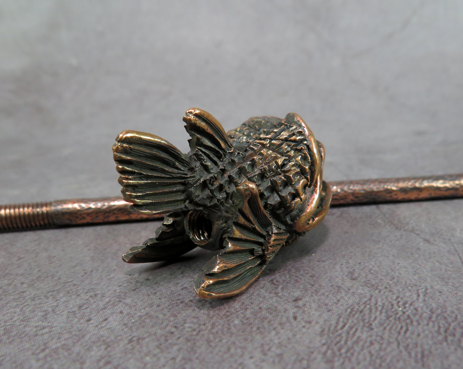 To make this item, a wax model was cut out by hand. Then, using the lost wax method, bronze parts were cast.