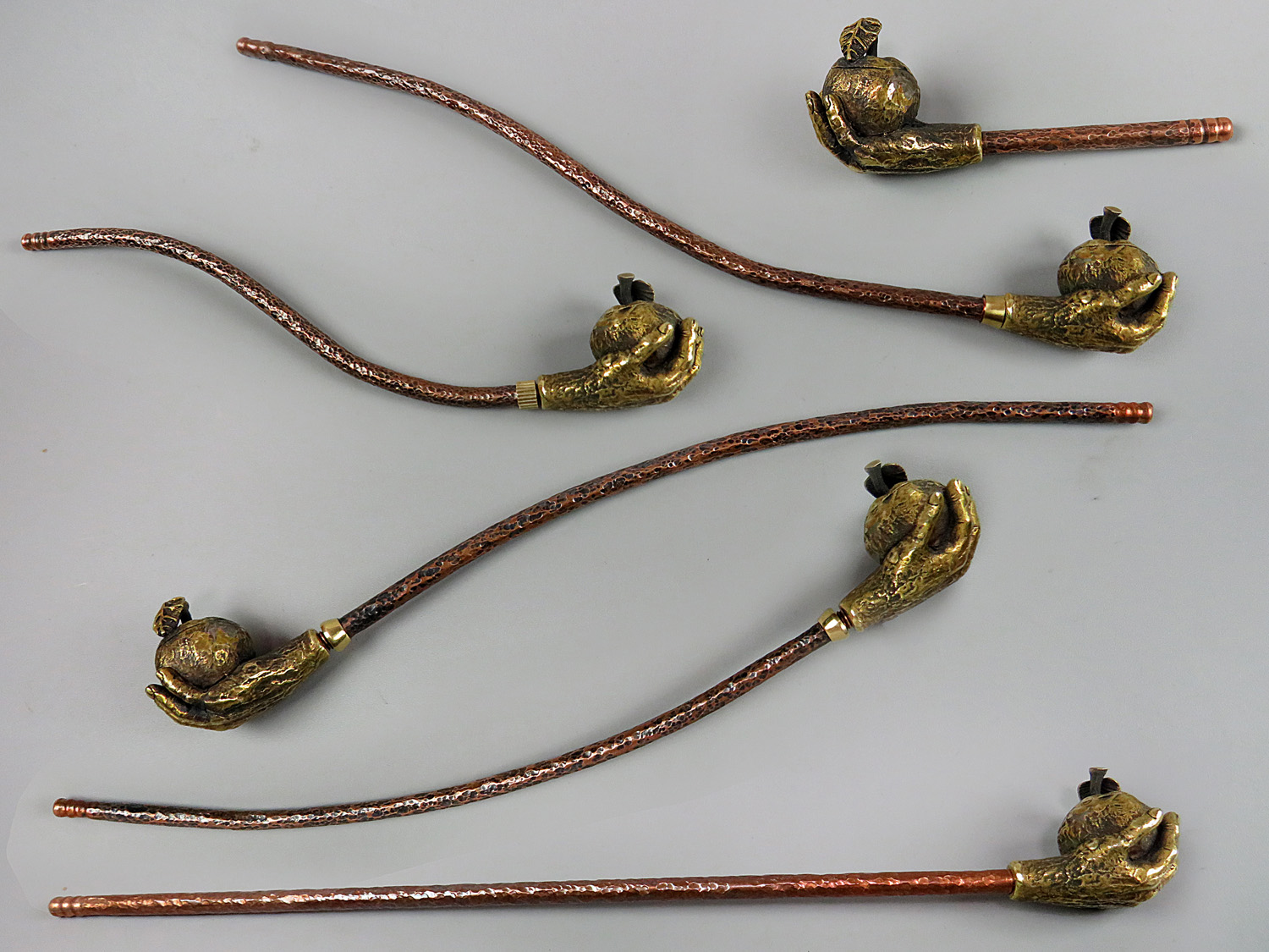 The mouthpiece is made of copper, it is screwed on, can have a length (from 3 to 30 cm) and a shape at the request of the buyer. The pipe is working, not decorative, the model is tested by the master.