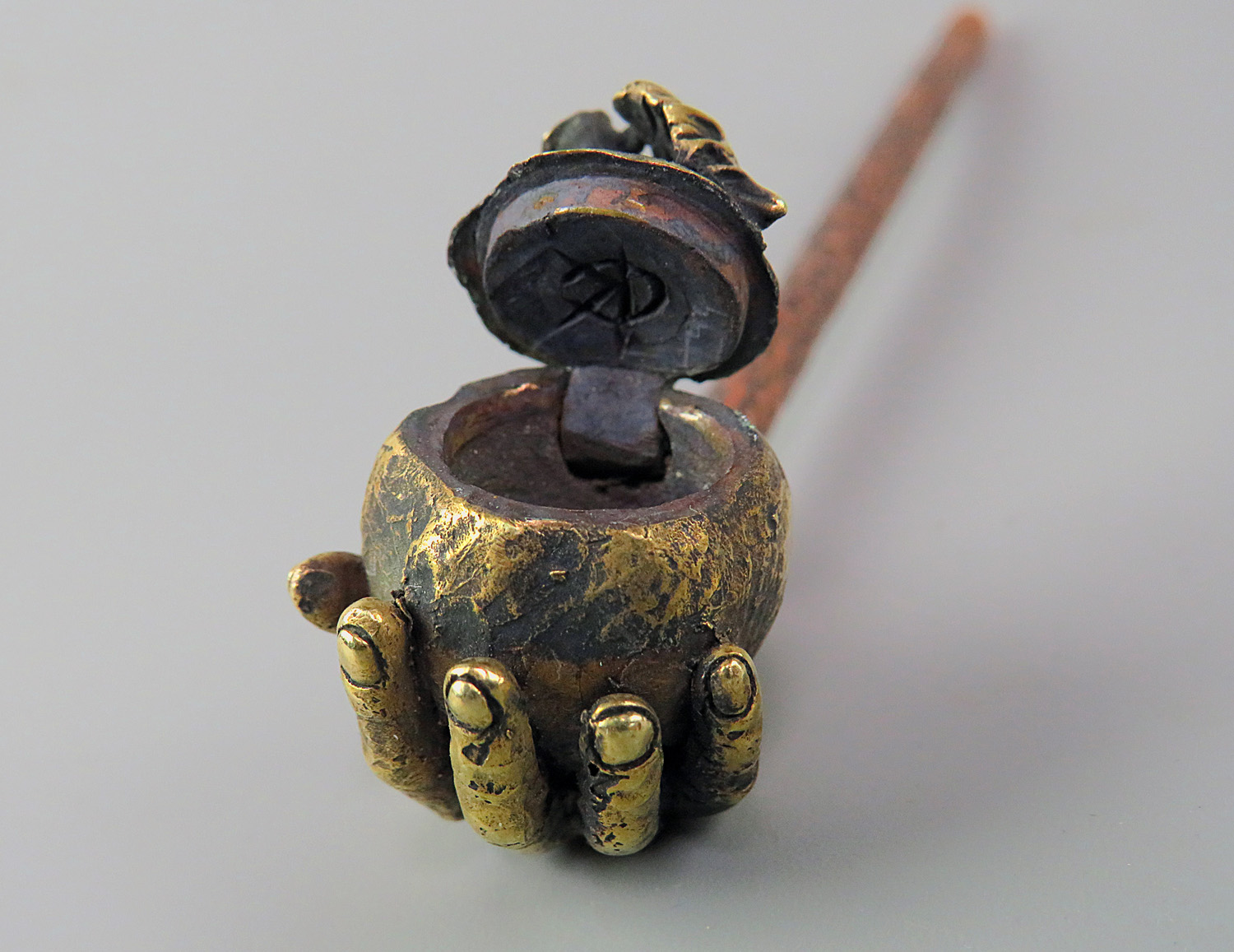 To make this item, a wax model was cut out by hand. Then, using the lost wax method, bronze parts were cast.