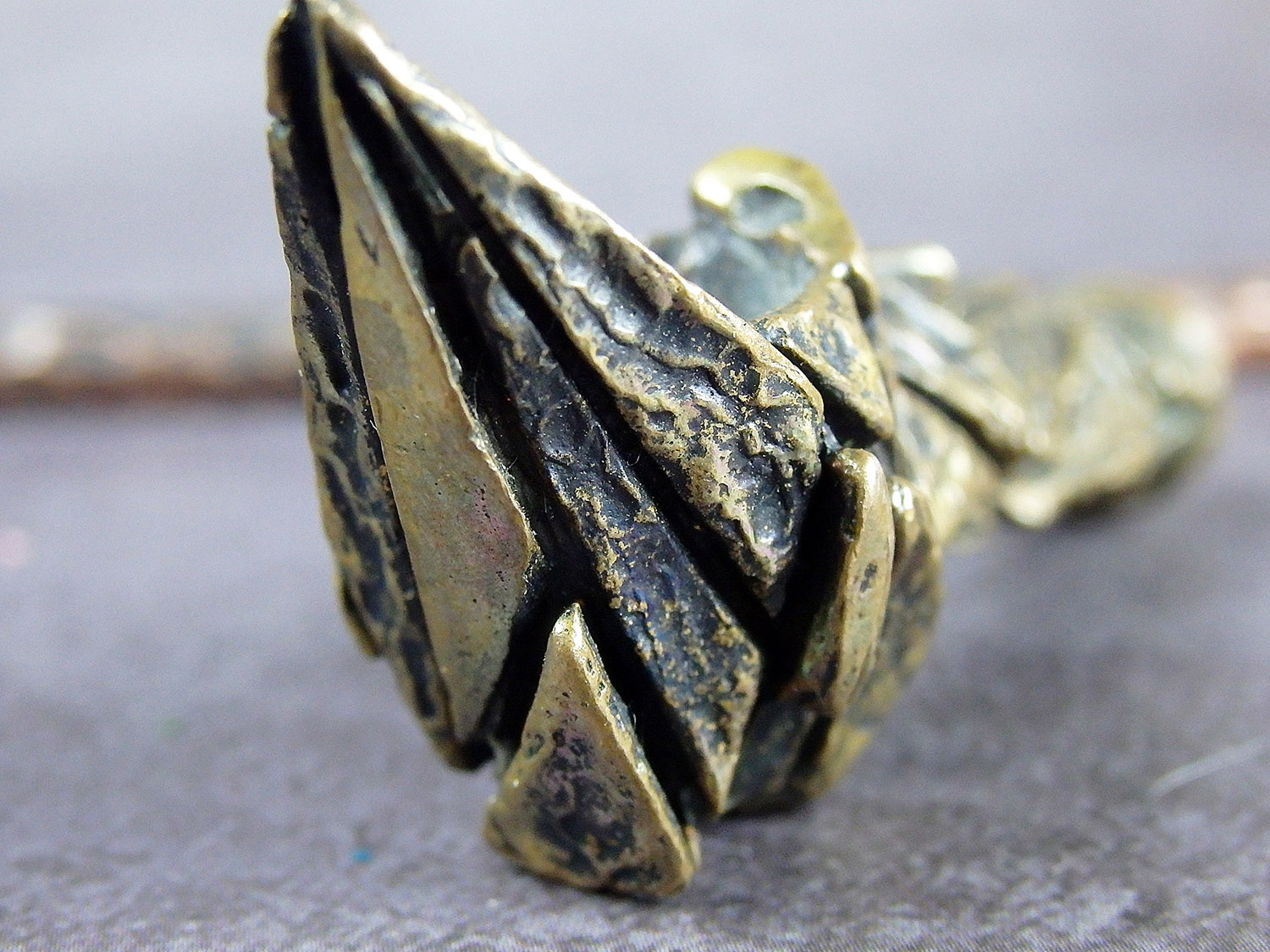 To make this item, a wax model was cut out by hand. Then, using the lost wax method, bronze parts were cast.