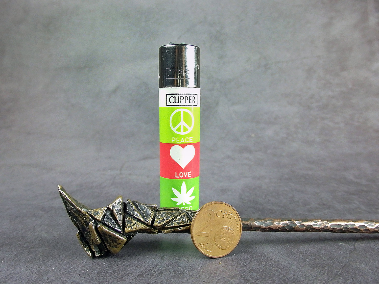 Bronze smoking pipe with a relief bowl, as if covered with armor in warhammer style. The mouthpiece is made of copper, it is screwed on, can have a length (from 3 to 30 cm) and a shape at the request of the buyer. The pipe is working, not decorative, the model is tested by the master.