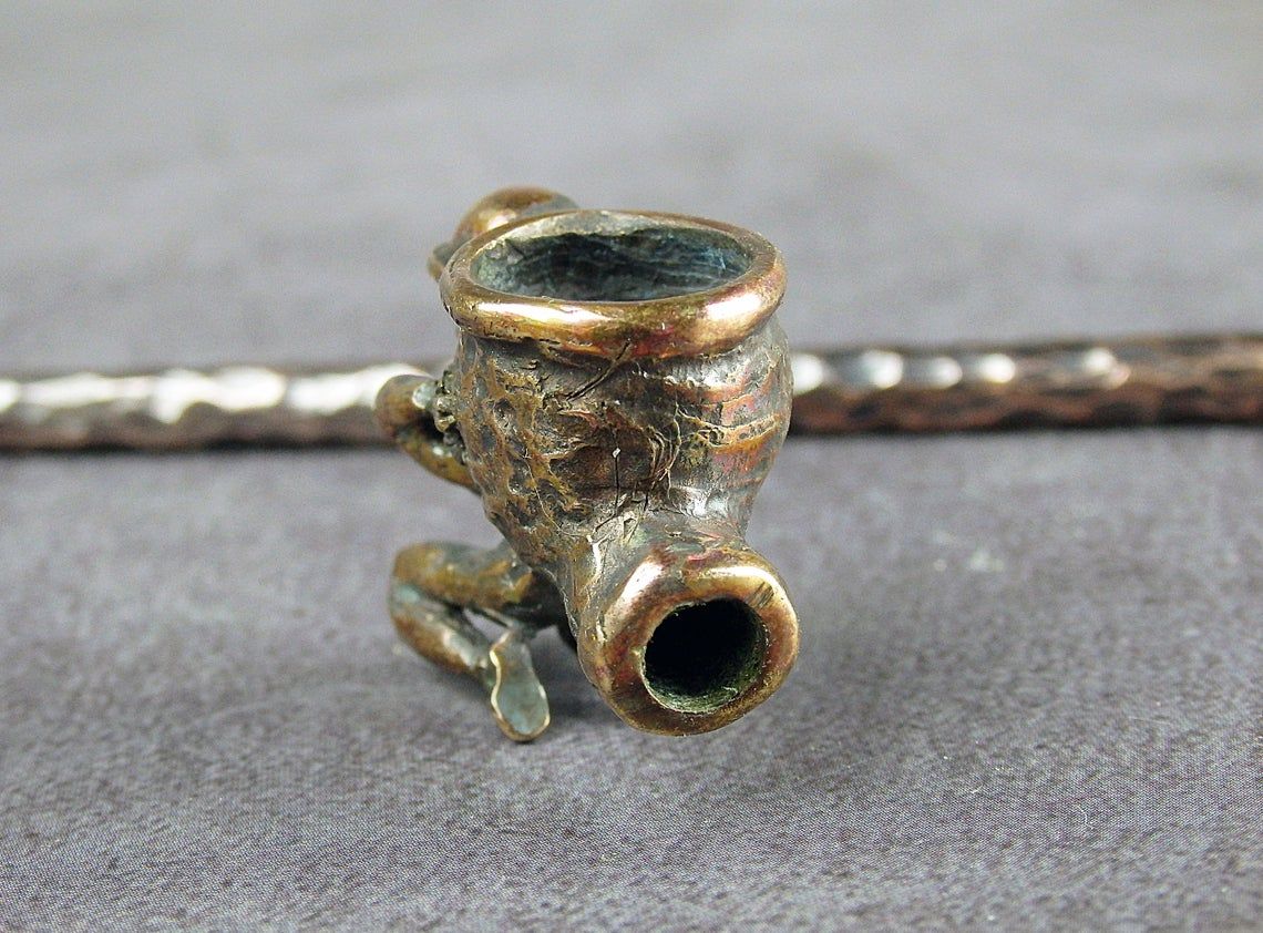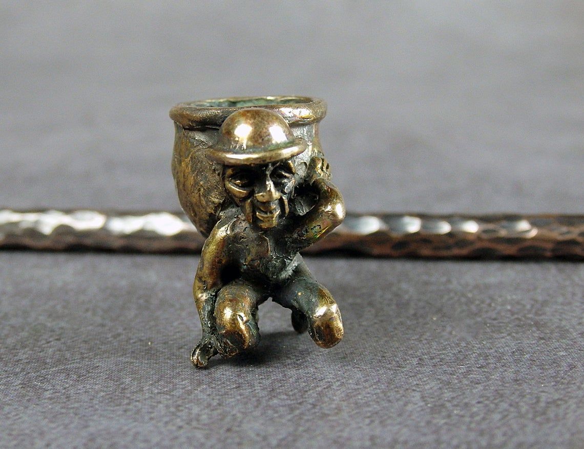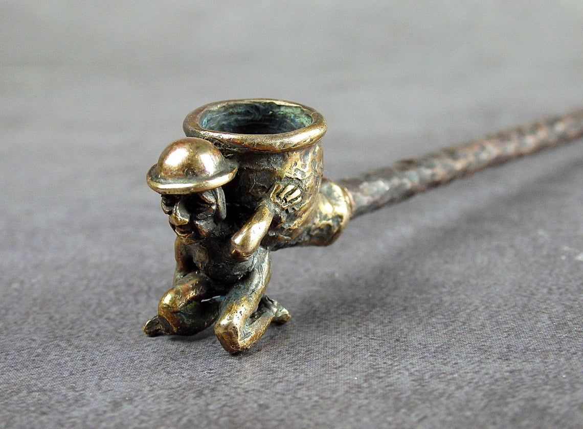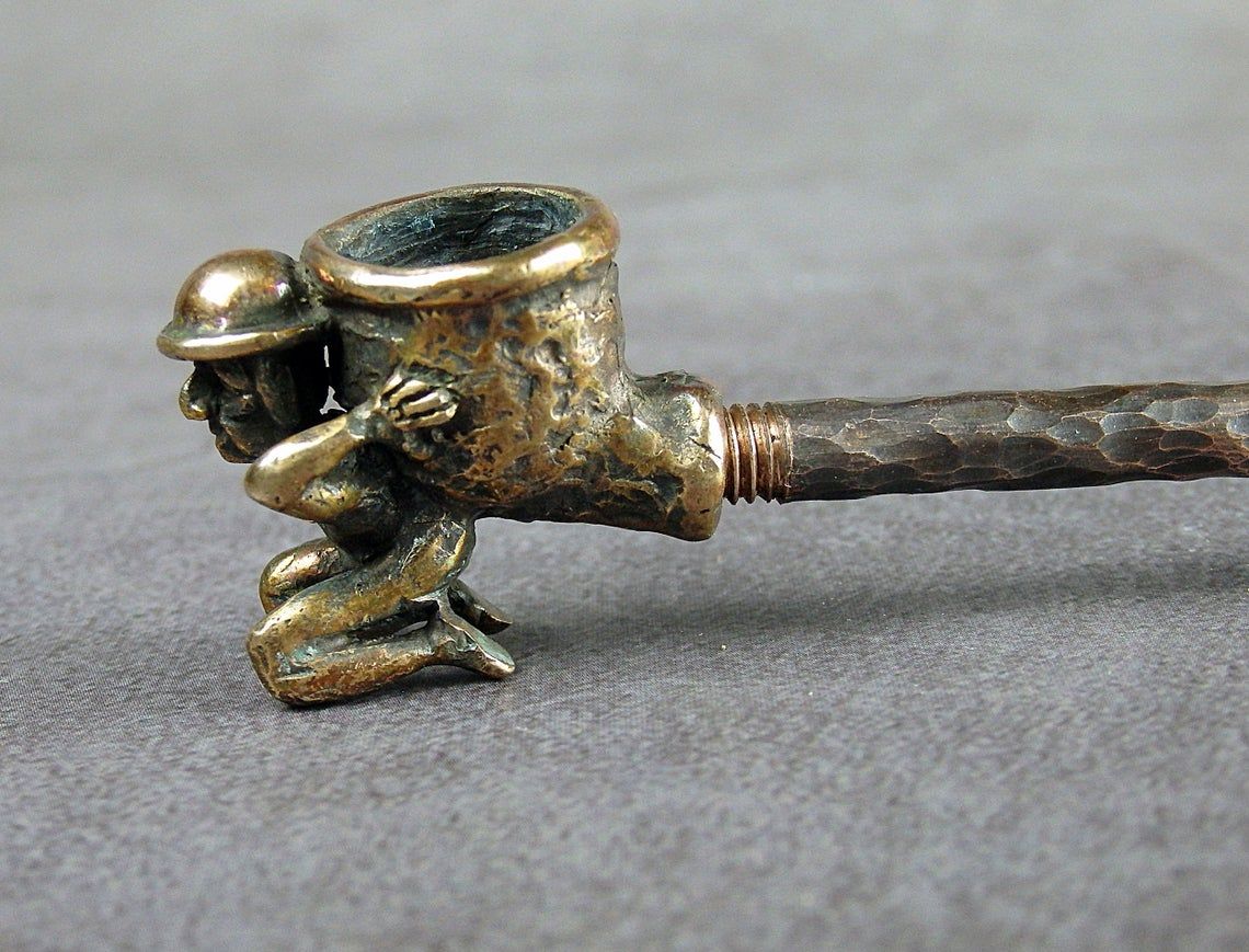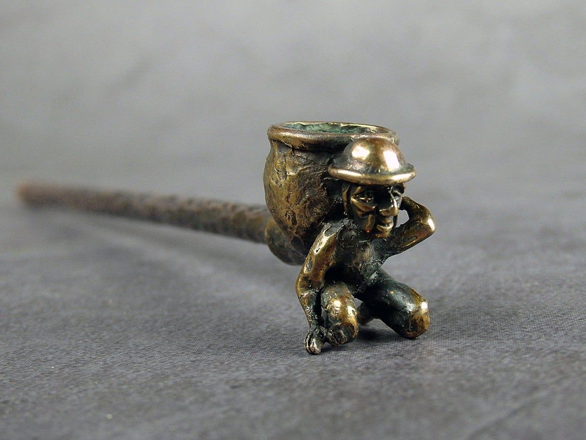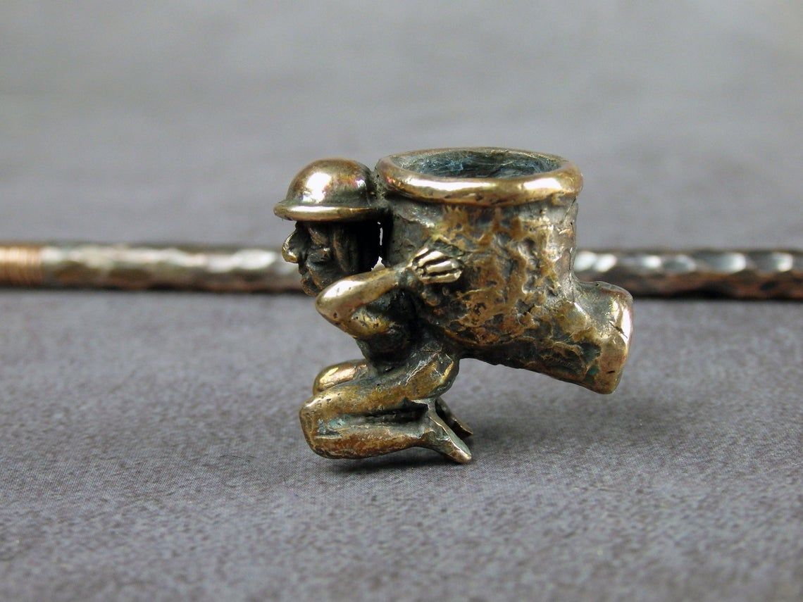 Small bronze smoking pipe with bowl in the shape of a porter carrying a pot-bowl. The mouthpiece is made of copper, it is screwed on, can have a length (from 3 to 30 cm) and a shape at the request of the buyer. The pipe is working, not decorative, the model is tested by the master.