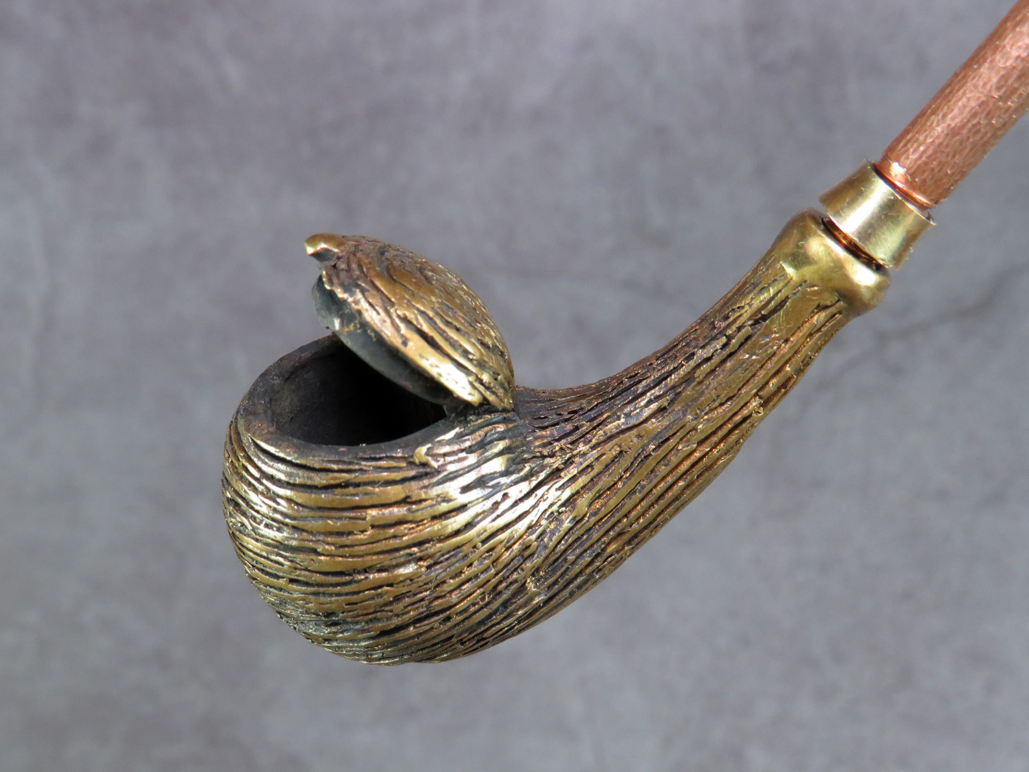 To make this item, a wax model was cut out by hand. Then, using the lost wax method, bronze parts were cast.