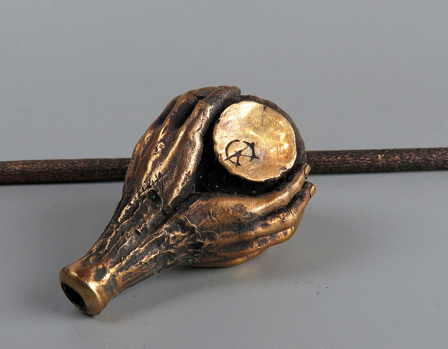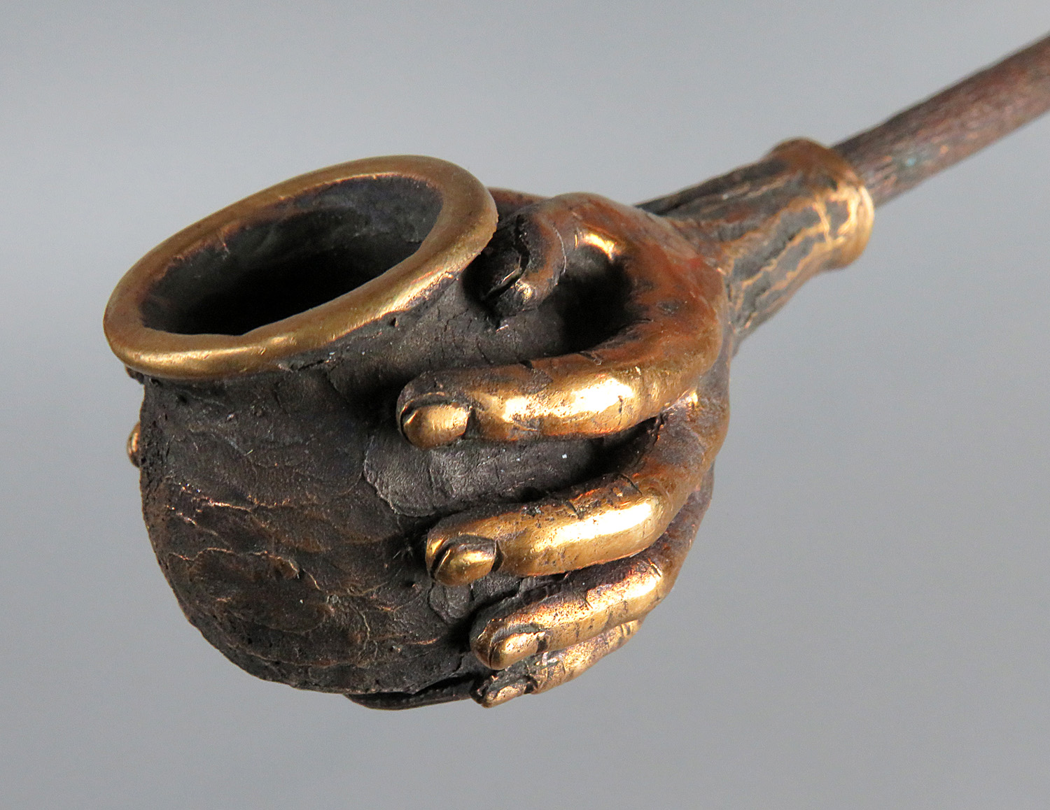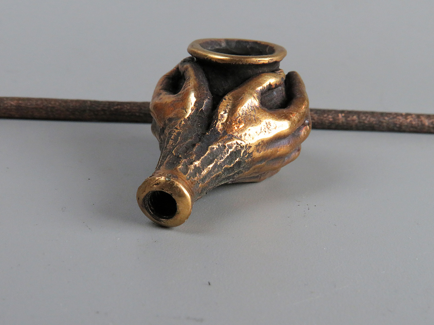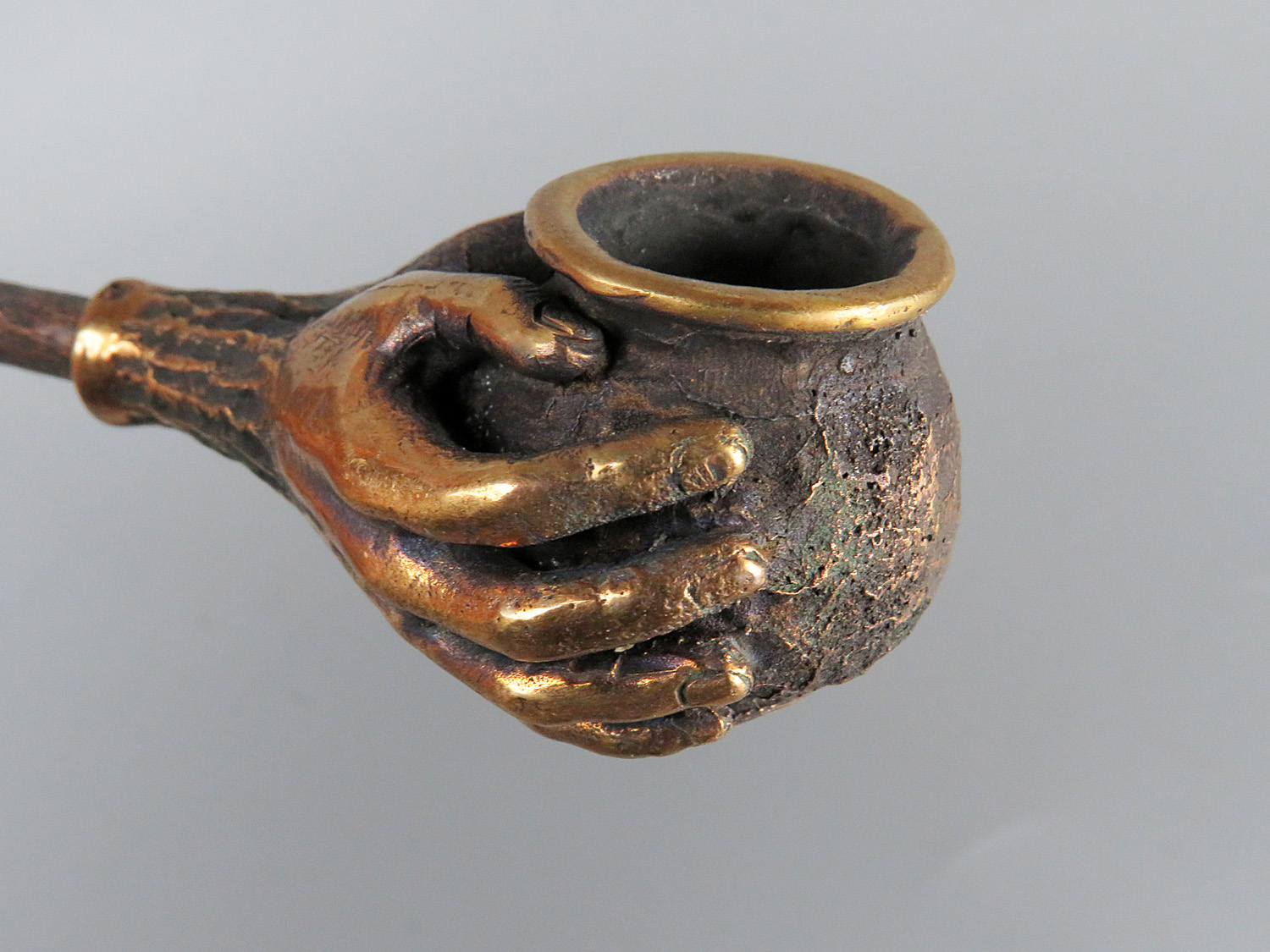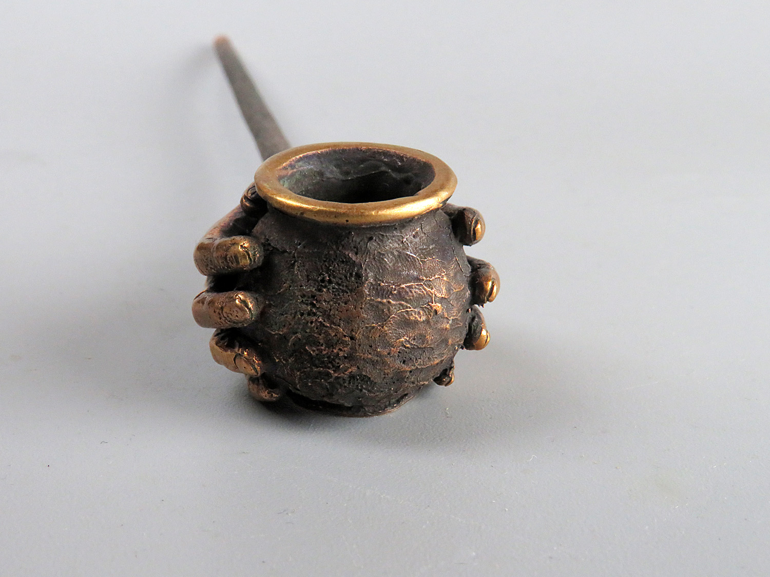 A smoking pipe in the form of a symbol of reconciliation and friendship - a pot in the hands.. The mouthpiece is made of copper, it is screwed on, can have a length (from 3 to 30 cm) and a shape at the request of the buyer. The pipe is working, not decorative, the model is tested by the master.