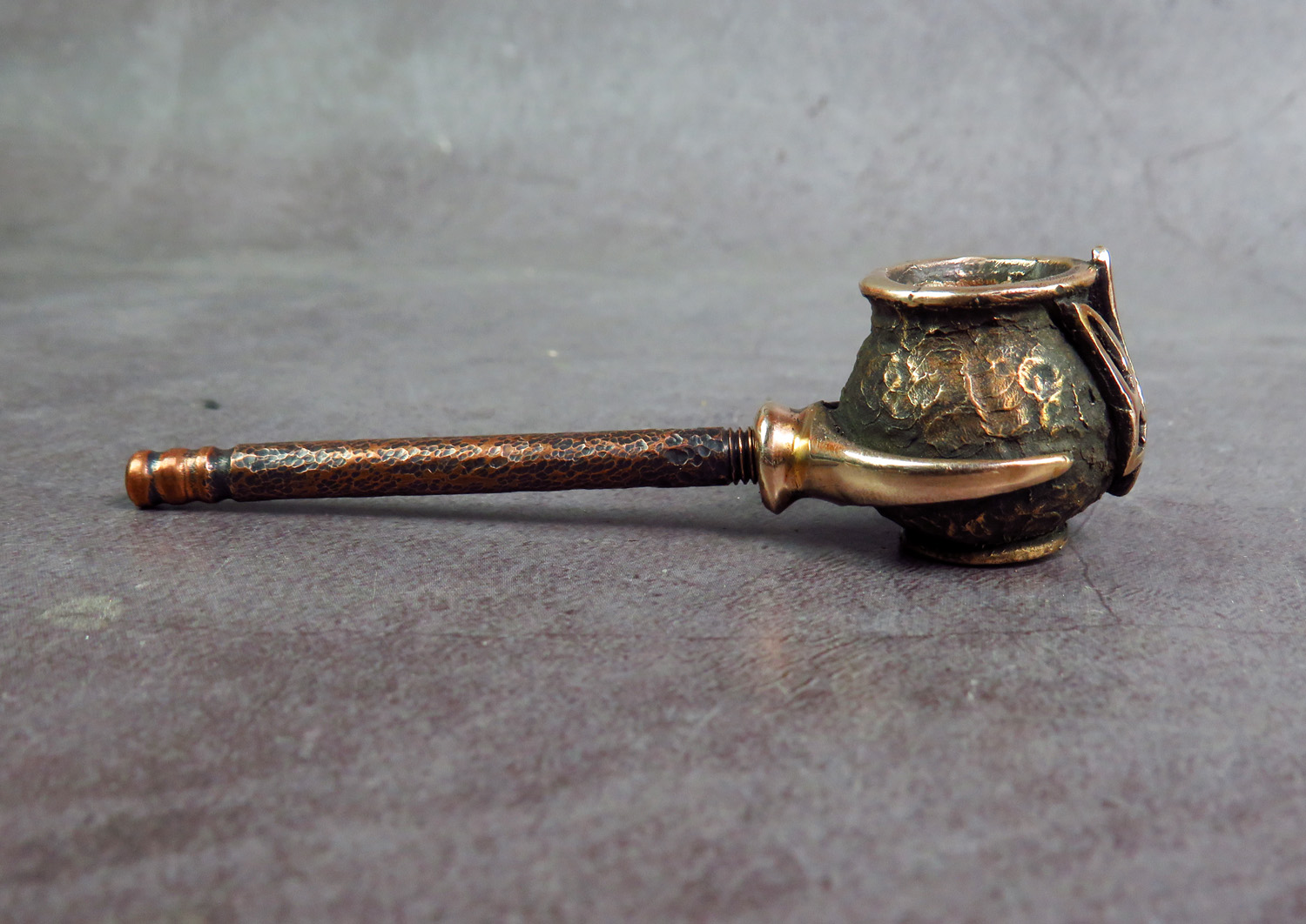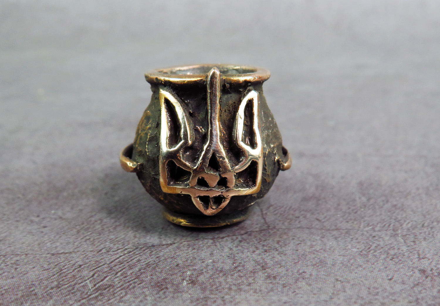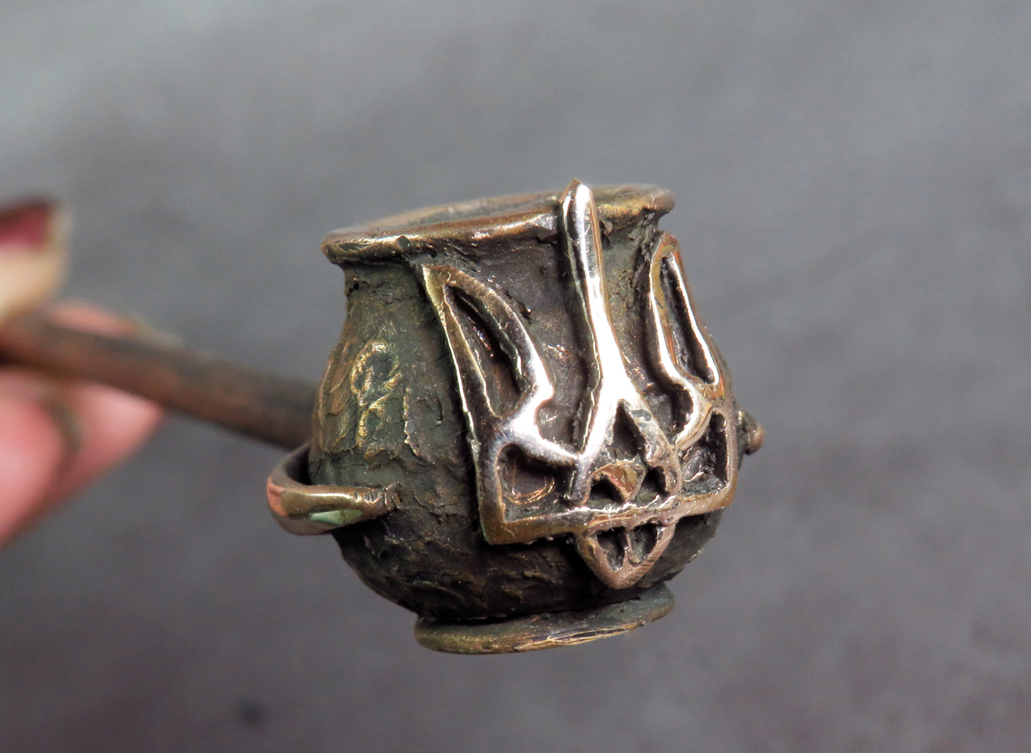 Bronze pipe-pot with a trident on its side. This is a simple and concise pipe for anyone who loves this wonderful country and wants to make a memorable gift to themselves or their Ukrainian friends. The mouthpiece is made of copper, it is screwed on, can have a length (from 3 to 30 cm) and a shape at the request of the buyer.