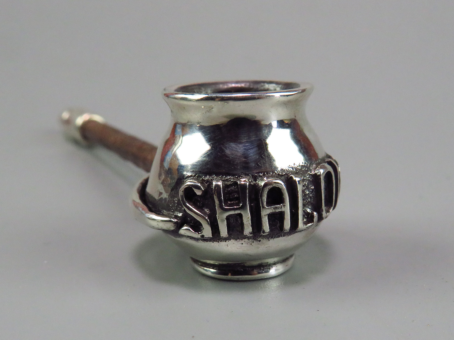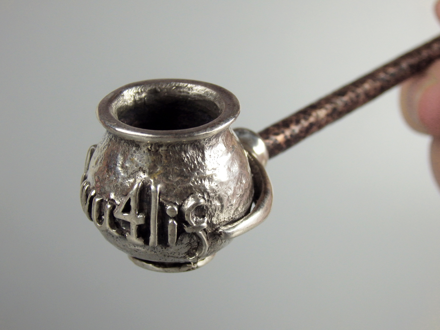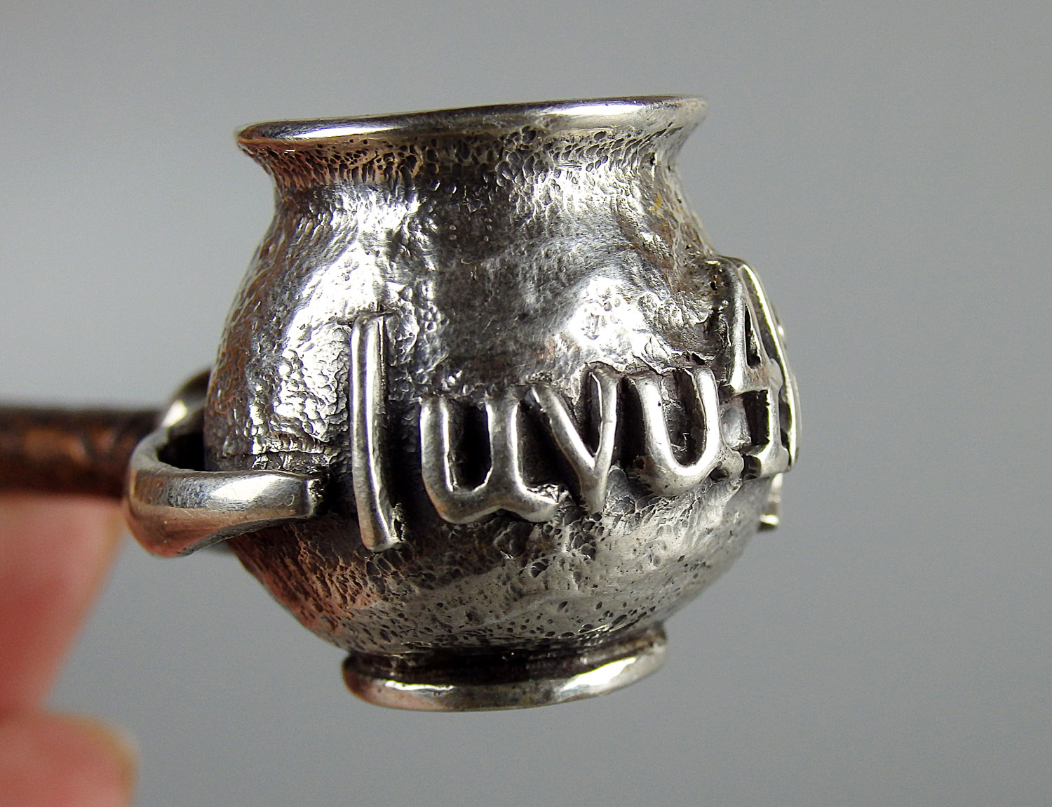 Personalized silver pipe with your text, date and initials. The mouthpiece is made of copper and silver, screwed on, can have a length (from 3 to 30 cm) and a shape at the request of the buyer. The pipe is working, not decorative, the model is tested by the master.