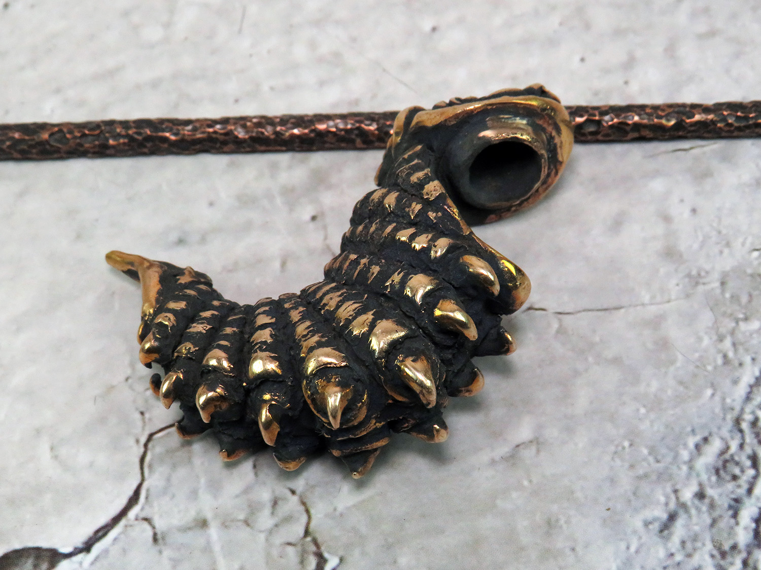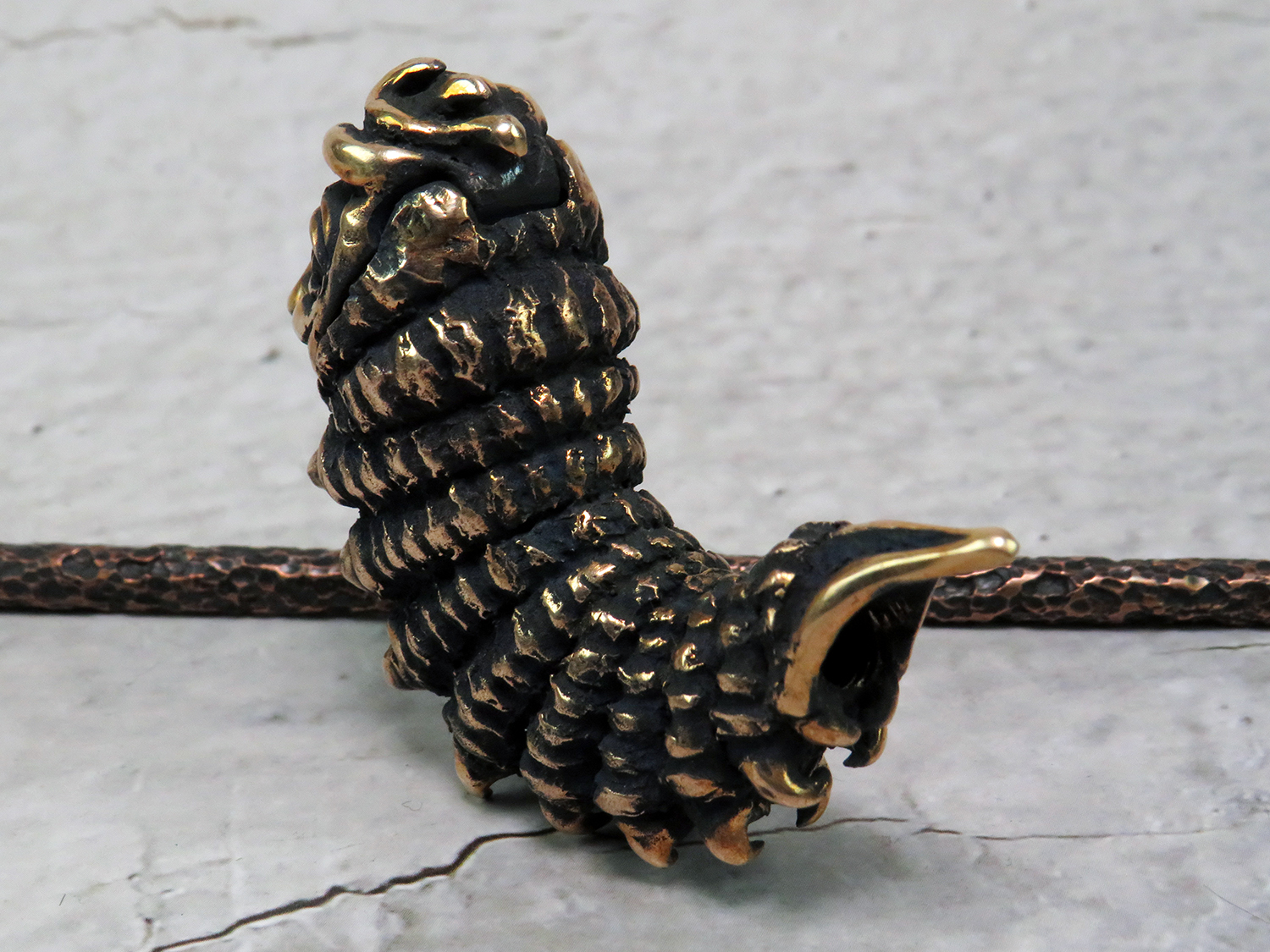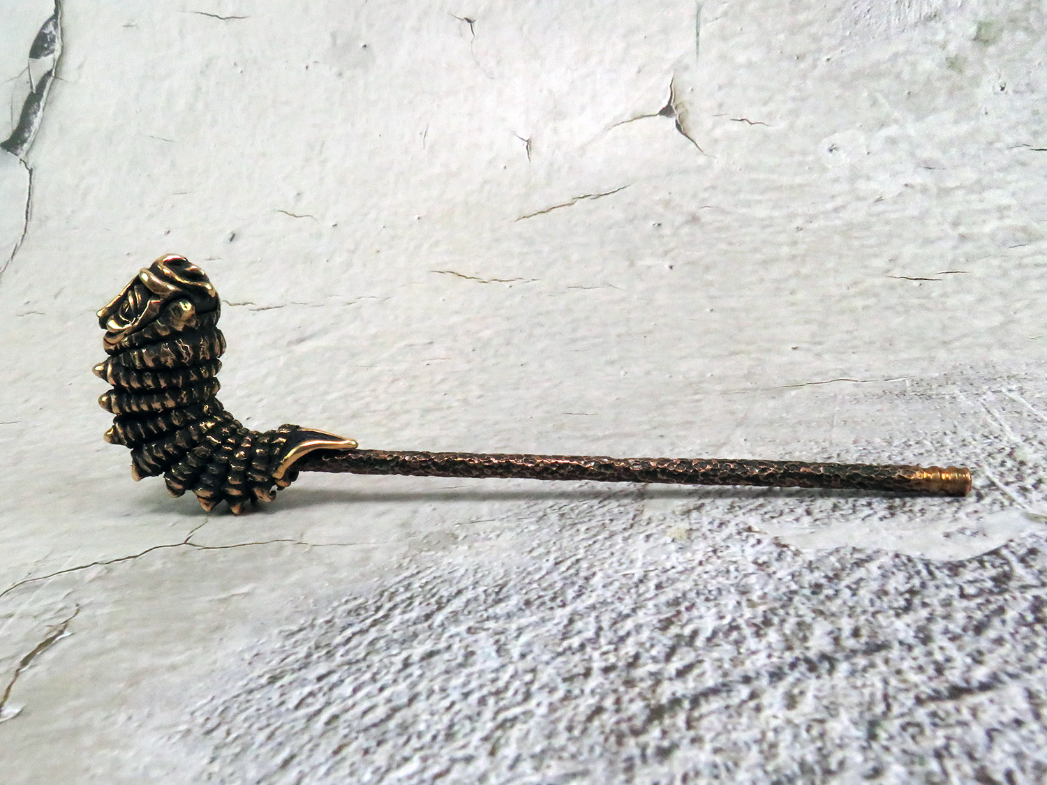An ornate bronze pipe in the shape of a caterpillar. This pipe is a tribute to the absurdists, the street-philosophers, the agnostics, and the solipsists — for those who dwell in the vibe of Lewis Carroll, find kinship with his cast of mad characters, and find themselves questioning the very fabric of reality.