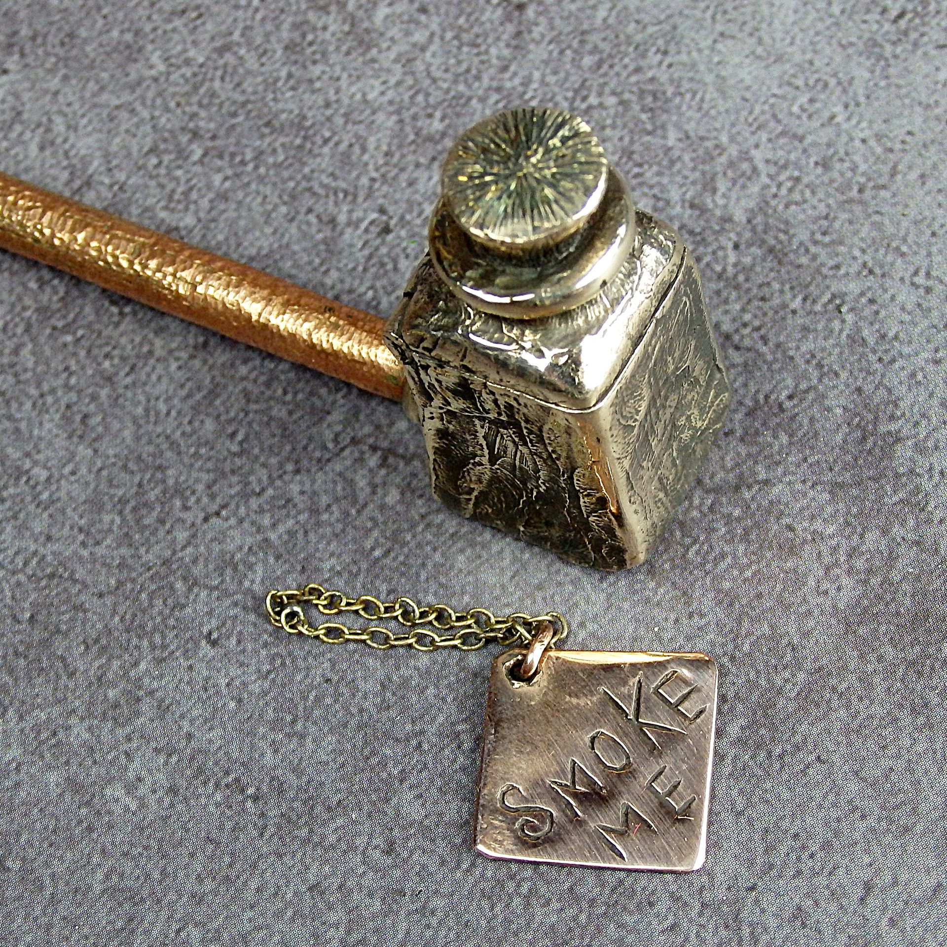 Creative smoking pipe with a variation on the theme of a bottle with an inscription "Drink Me" from the book by Lewis Carroll about Alice's Adventures in Wonderland.