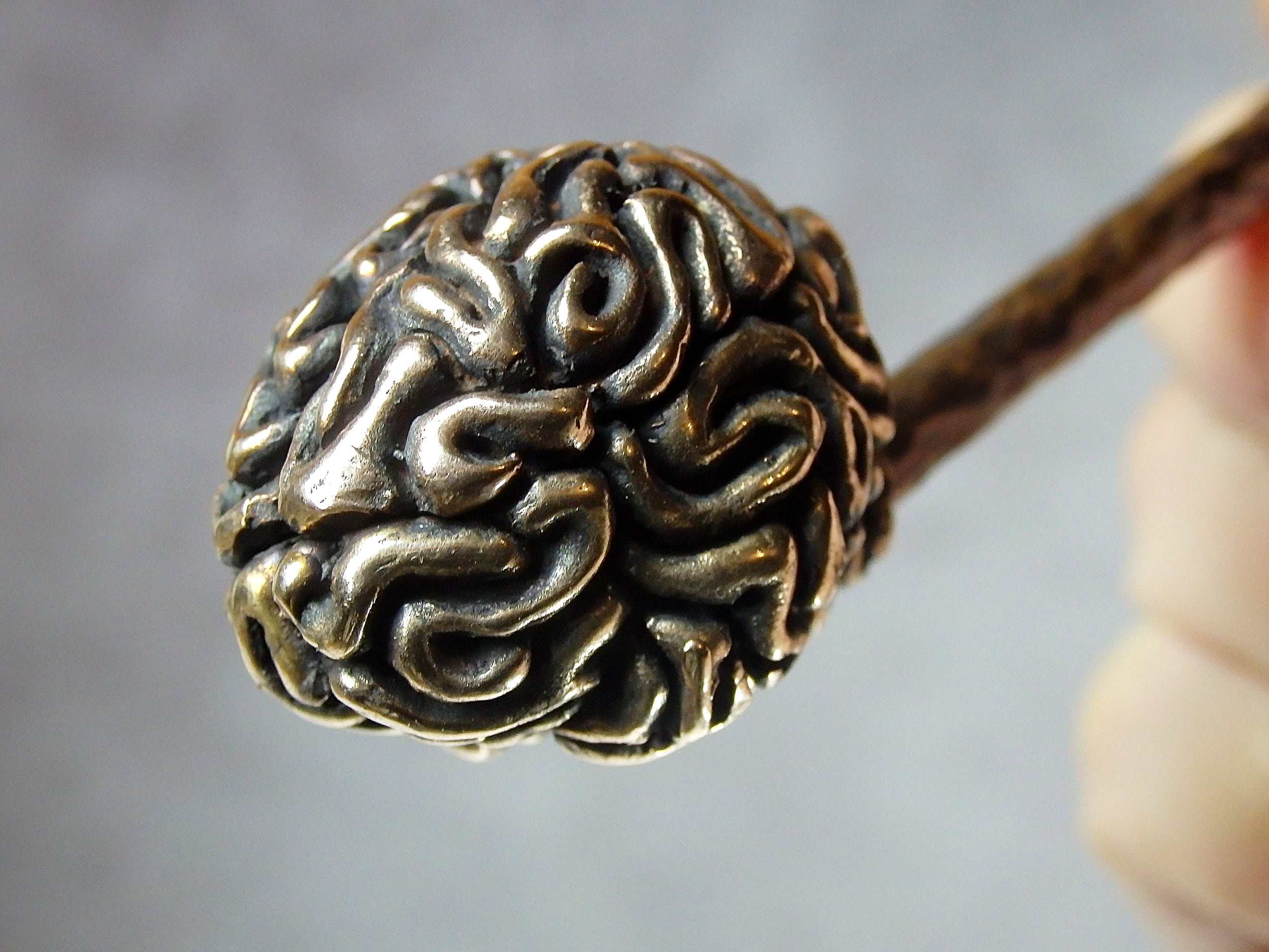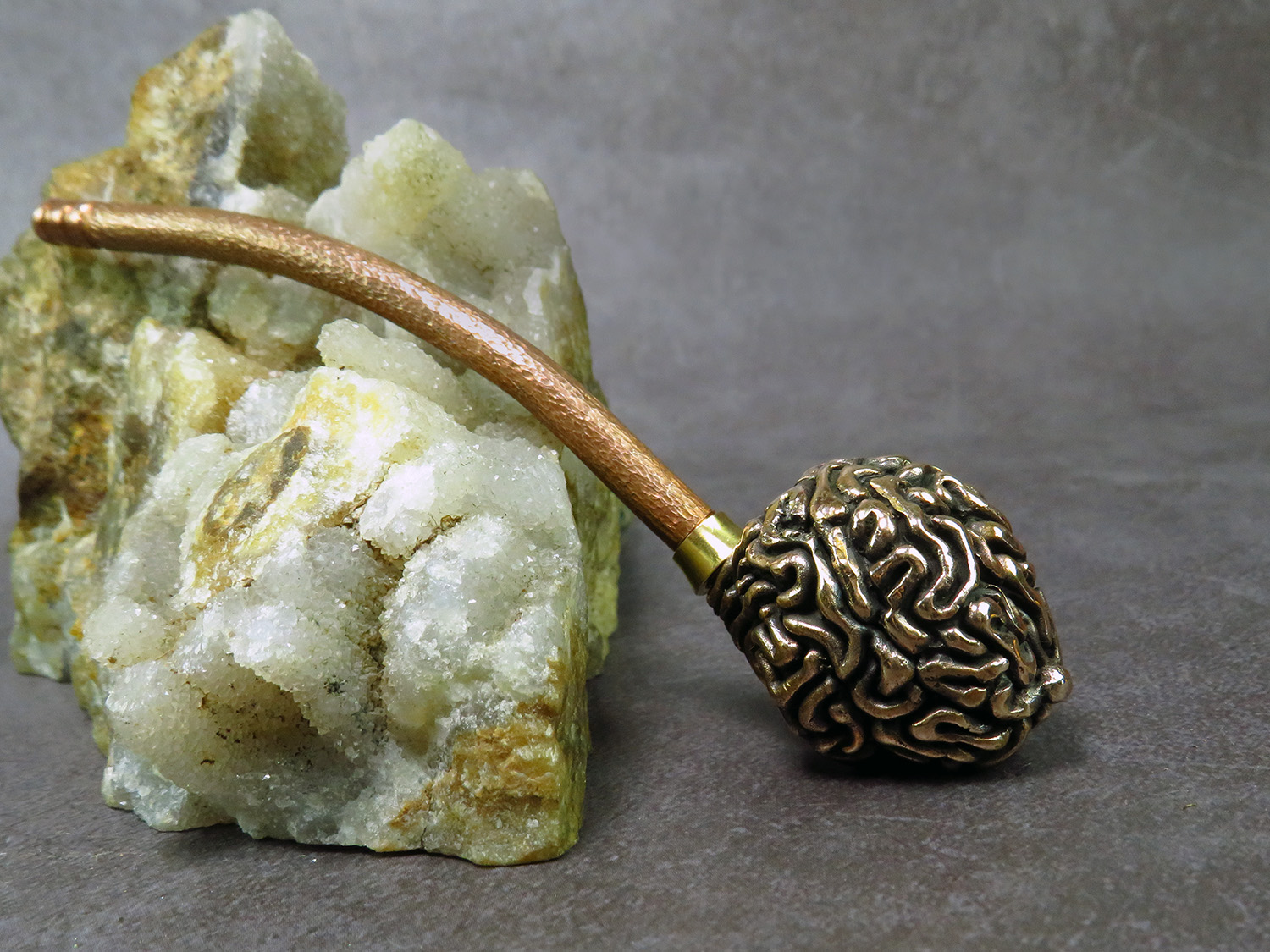 Bronze smoking pipe with a bowl in the form of a human brain. The brain has an opening lid and this is not only a smoking accessory, but also a wonderful symbolic souvenir with many meanings. It will be a cool gift for scientists, researchers, philosophers, those who are learning about the world and themselves, and is a perfect match for fans of horror, the bizarre, and zombie culture.