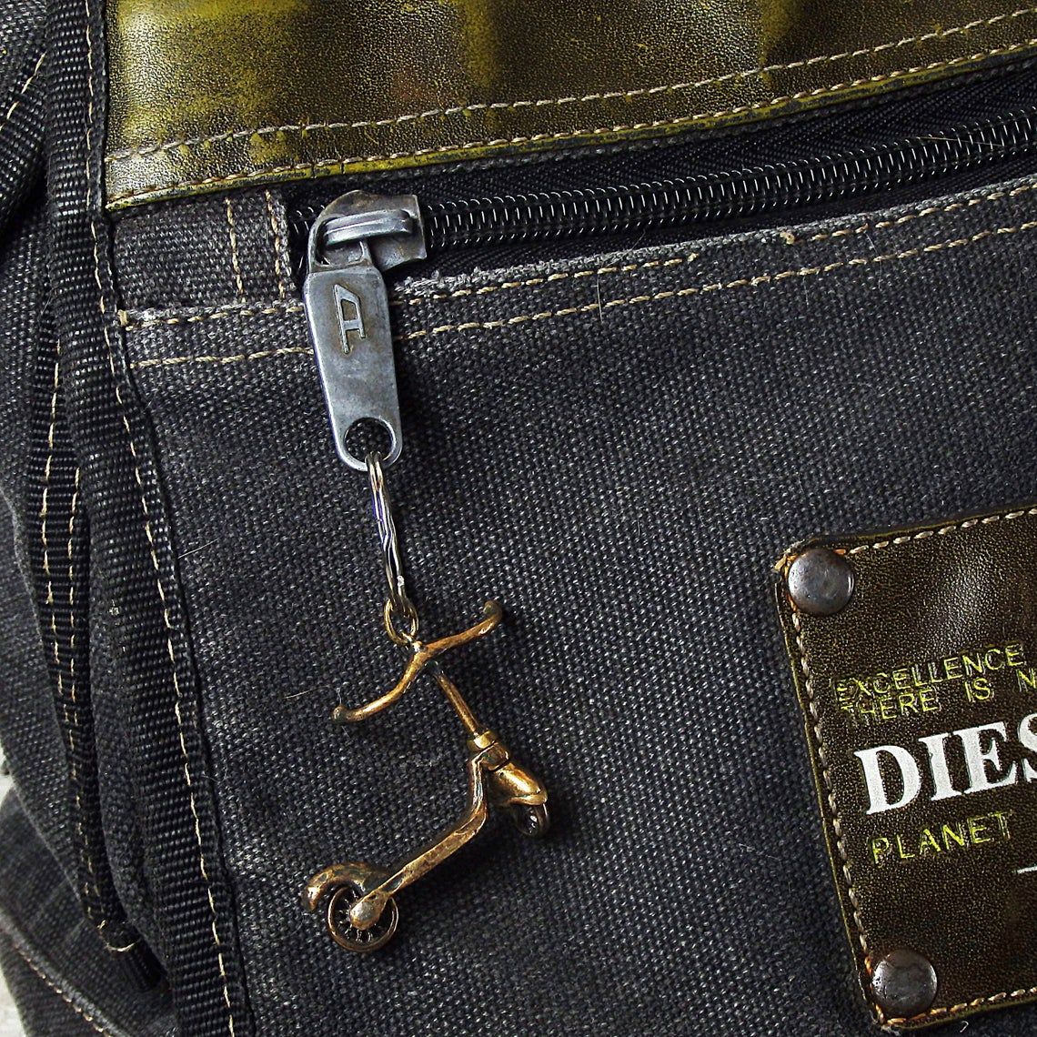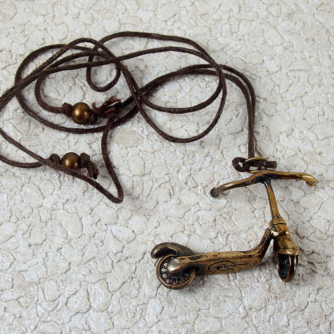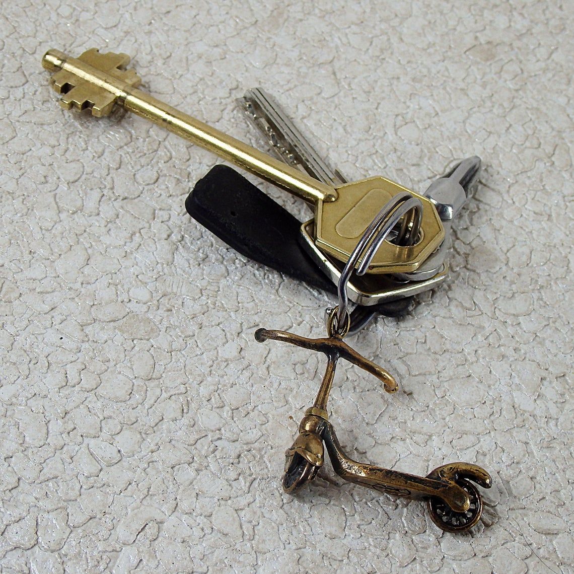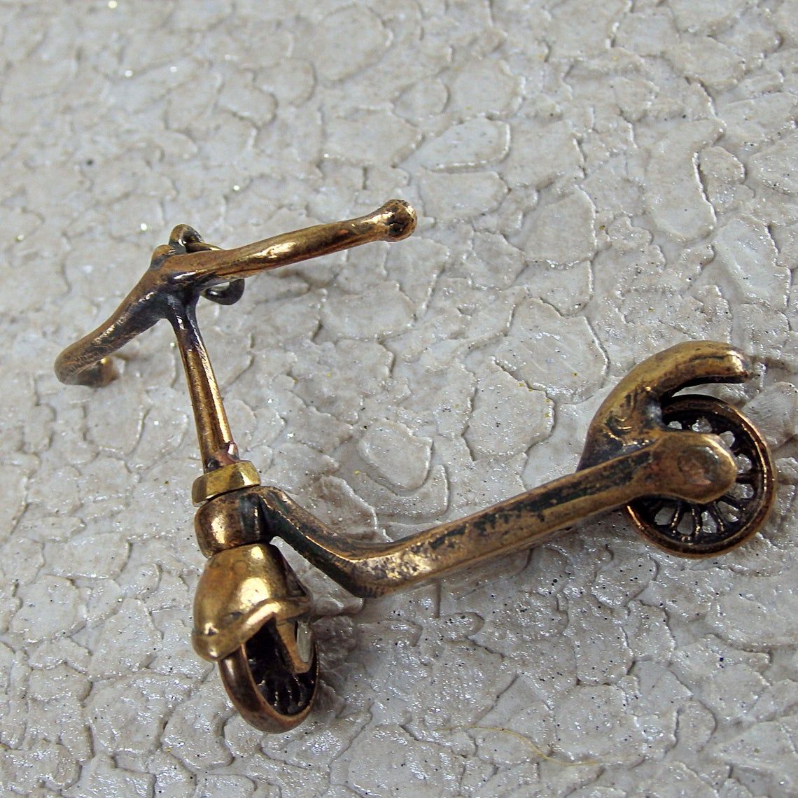 Bronze keychain "Scooter" will be a good little gift for a novice driver and supporter of a healthy lifestyle. This product can be used as a keychain or charm for bracelets and bags. The wheels spin and the steering wheel turns on the keychain, so this is a full-fledged miniature toy model.