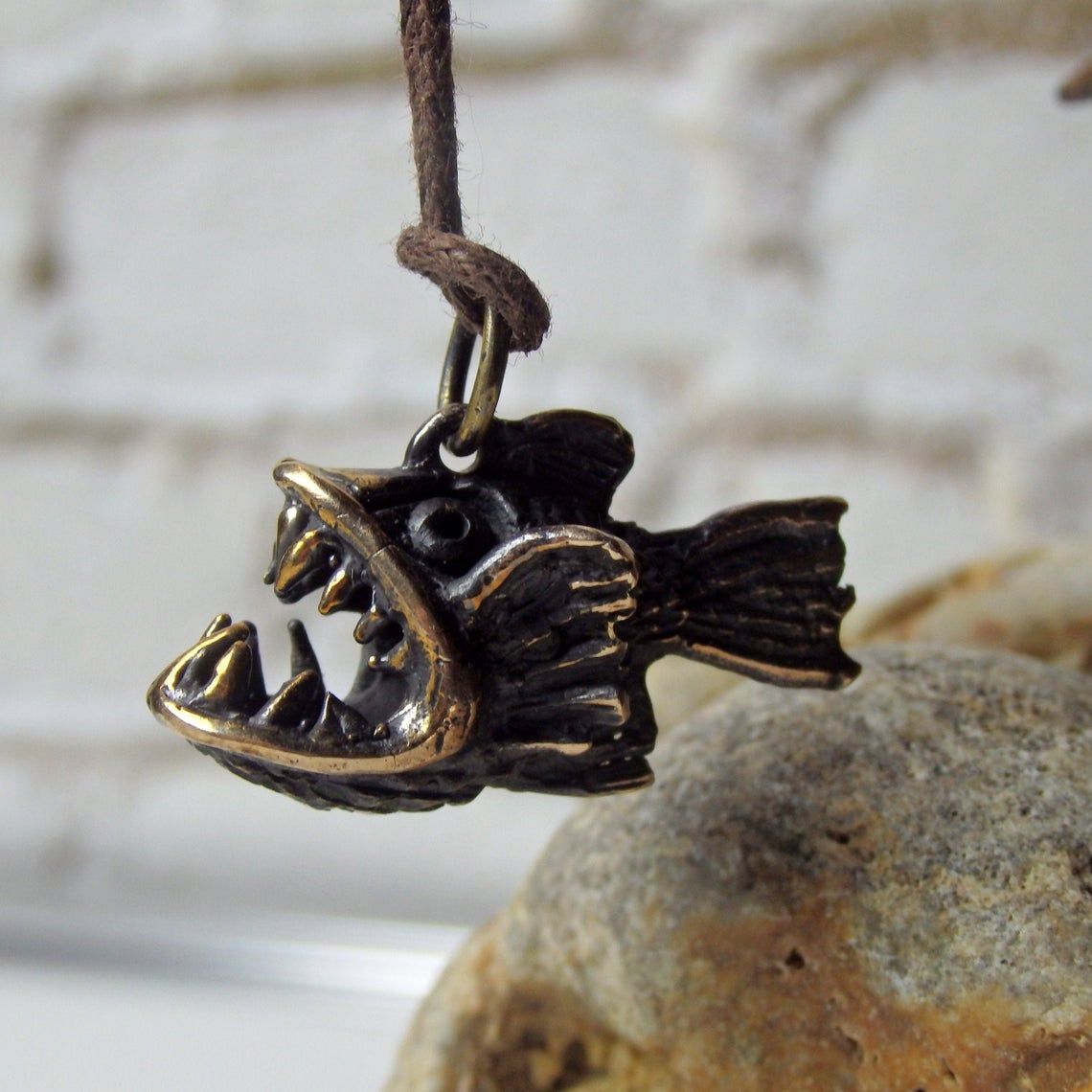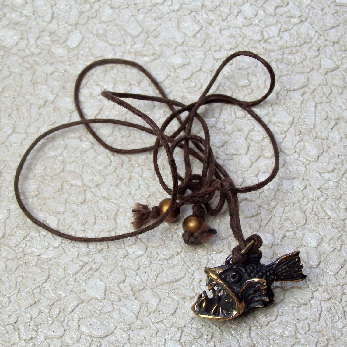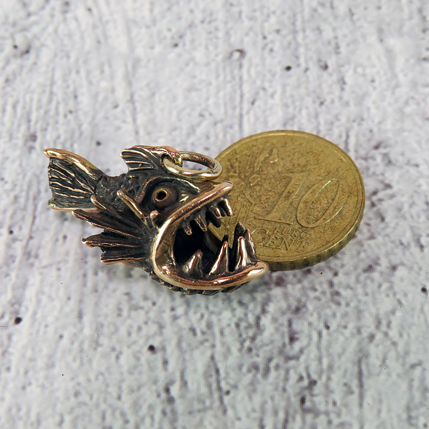 A funny bronze pendant in the form of a small angry fish with sharp teeth will be liked as a small gift for various people - anglers, aquarists, born under the zodiac sign of pisces and fans of Feng Shui teachings.