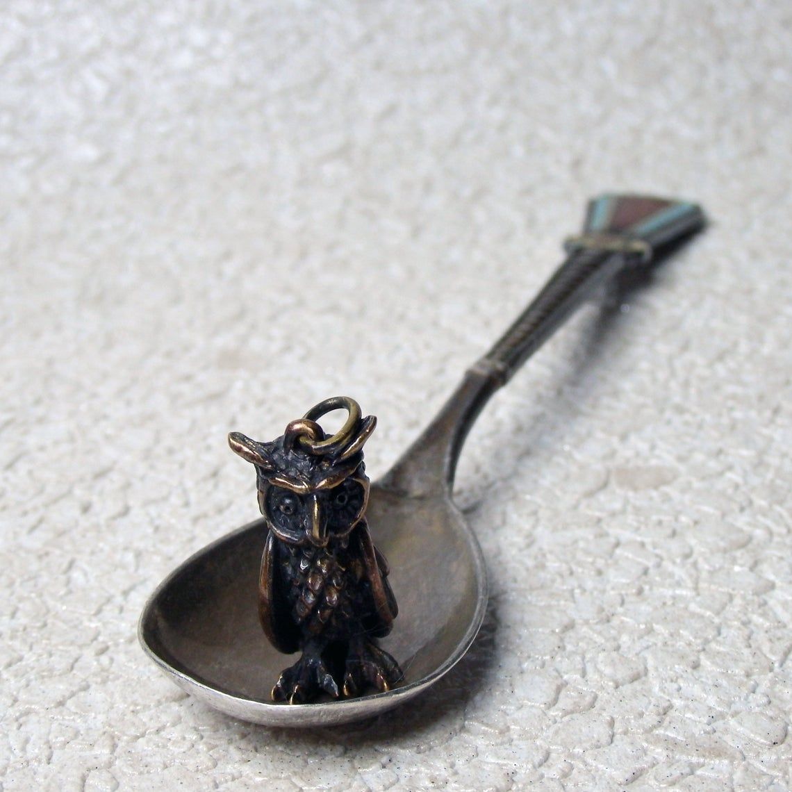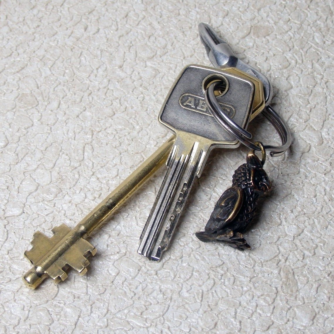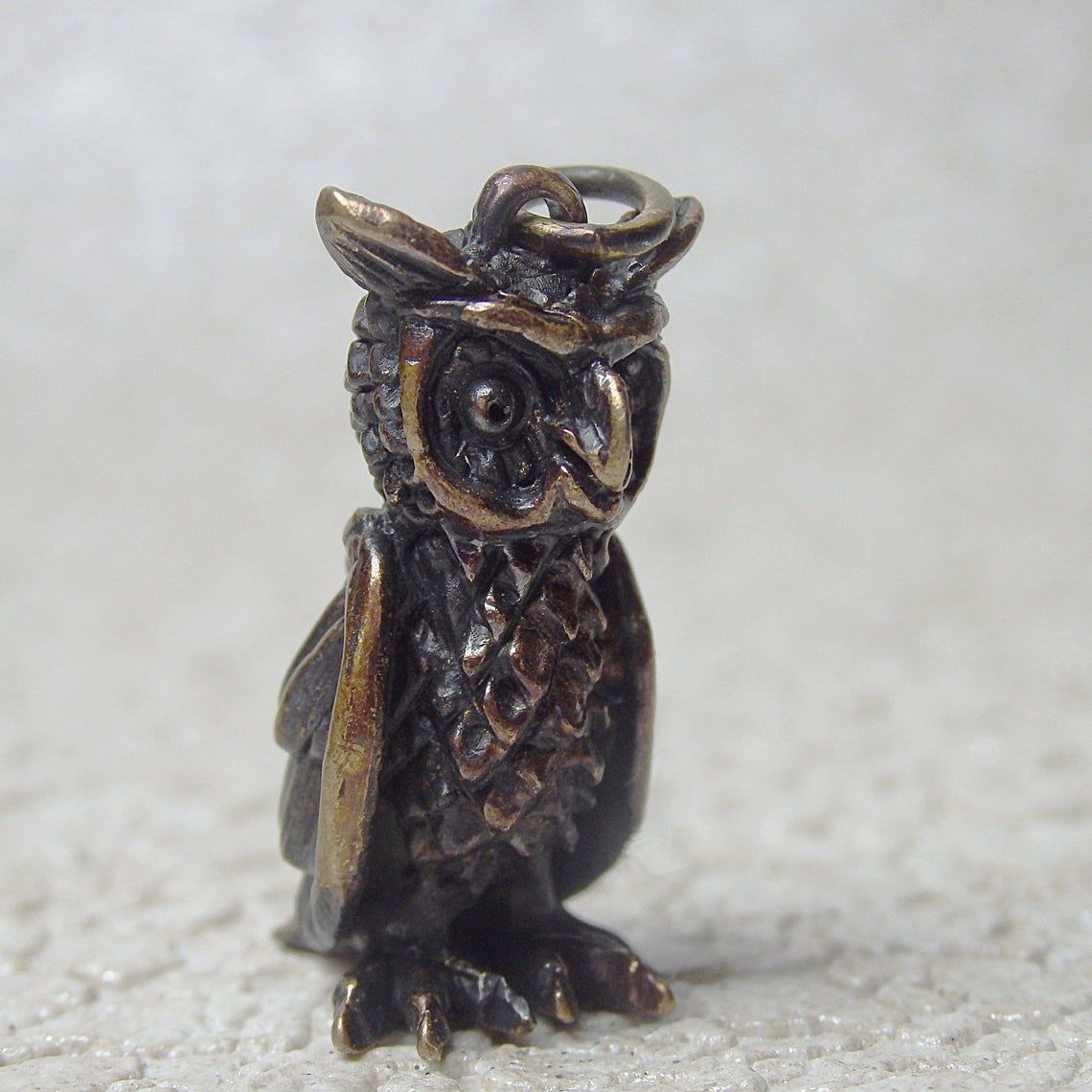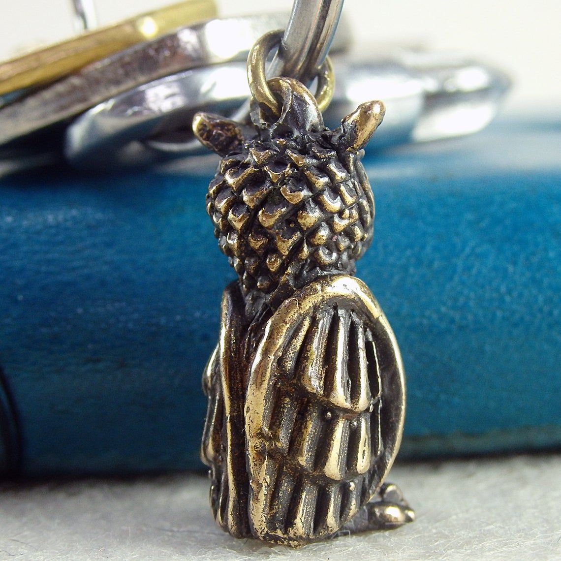 Miniature bronze owl keychain. It will be an excellent symbolic gift for lovers and conservationists, bird watchers and an evening persons. And well as for lovers of the philosophical doctrine of Feng Shui, since this bird is able to protect the family from bad people and keep prosperity for the house.
