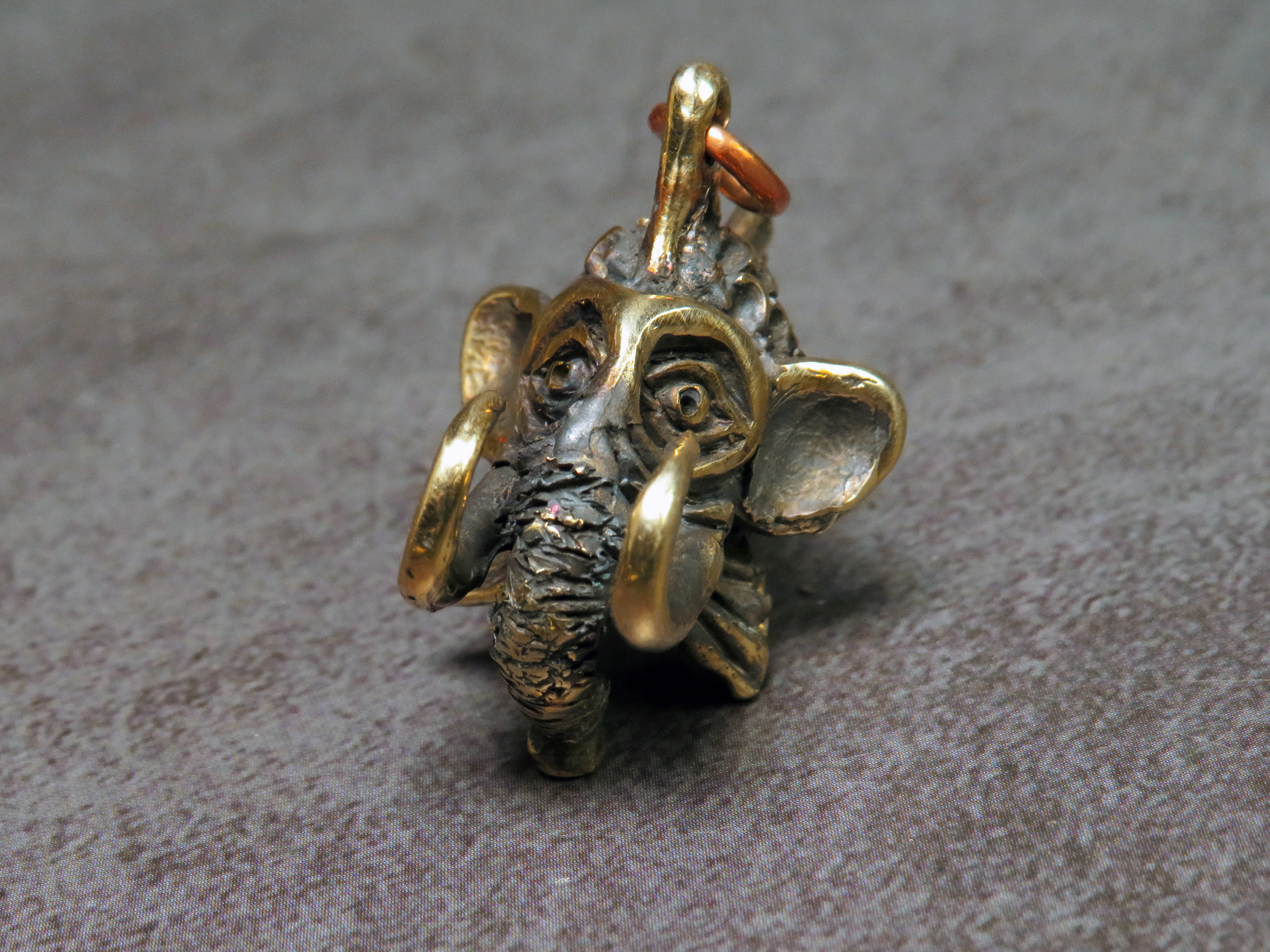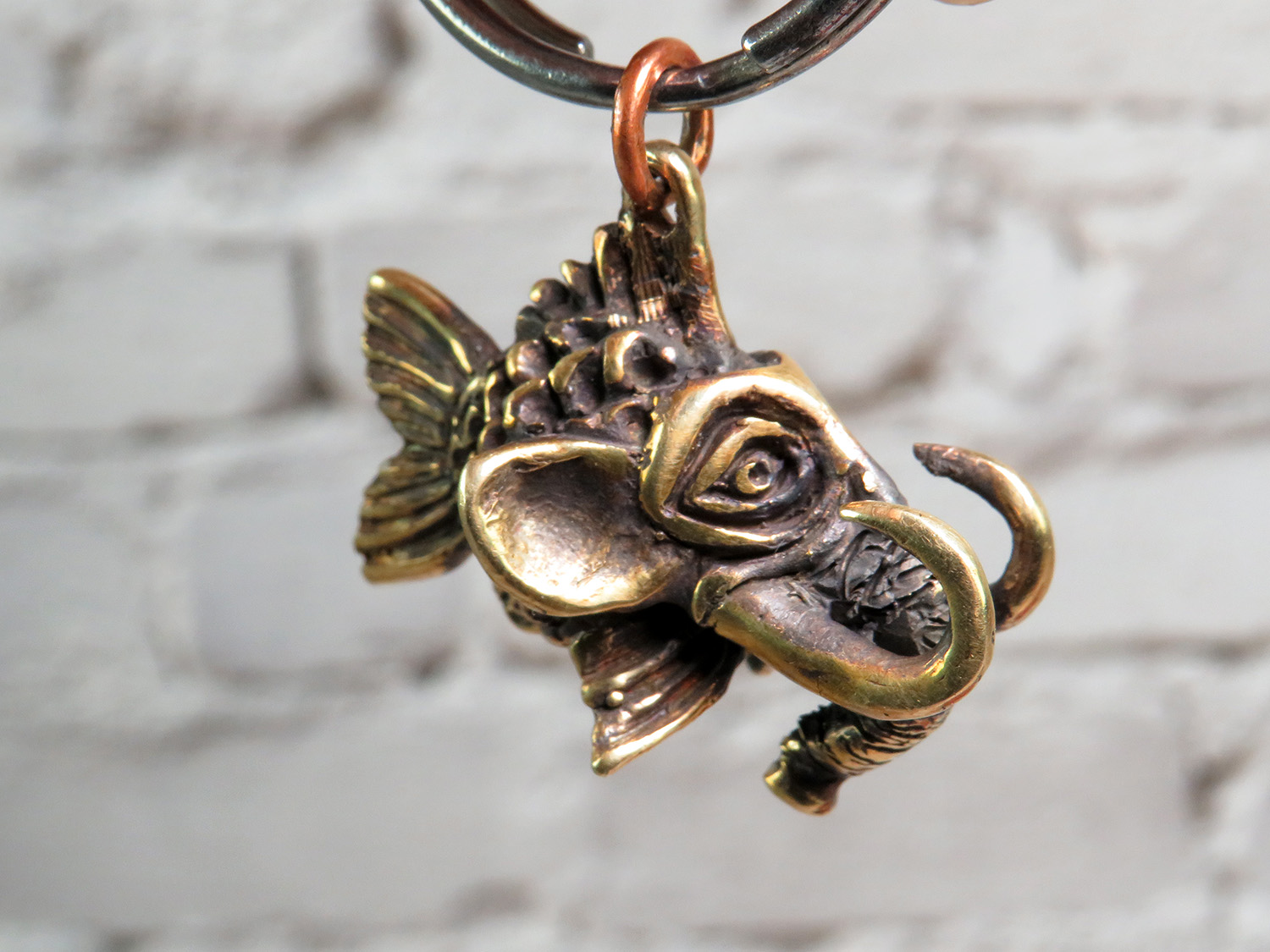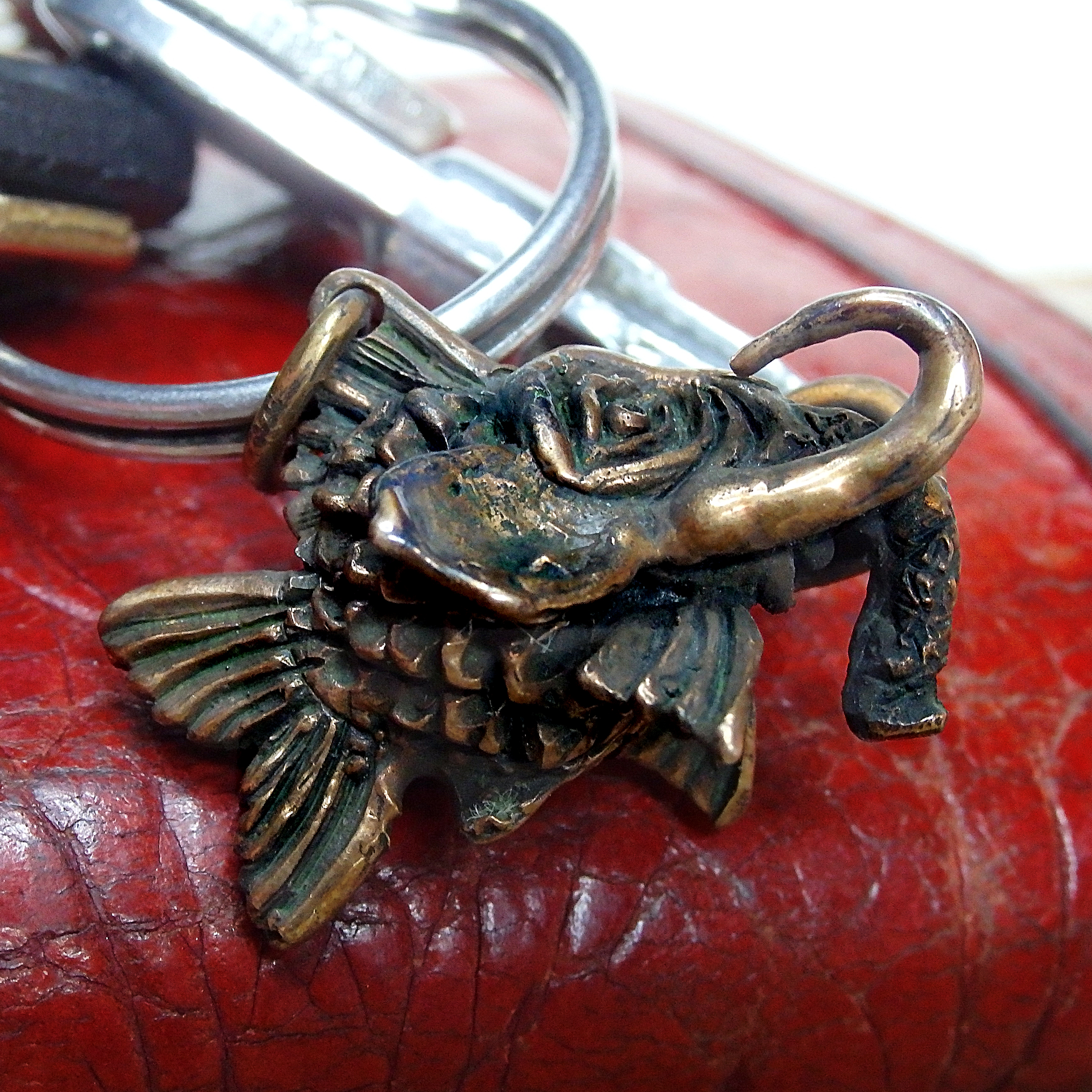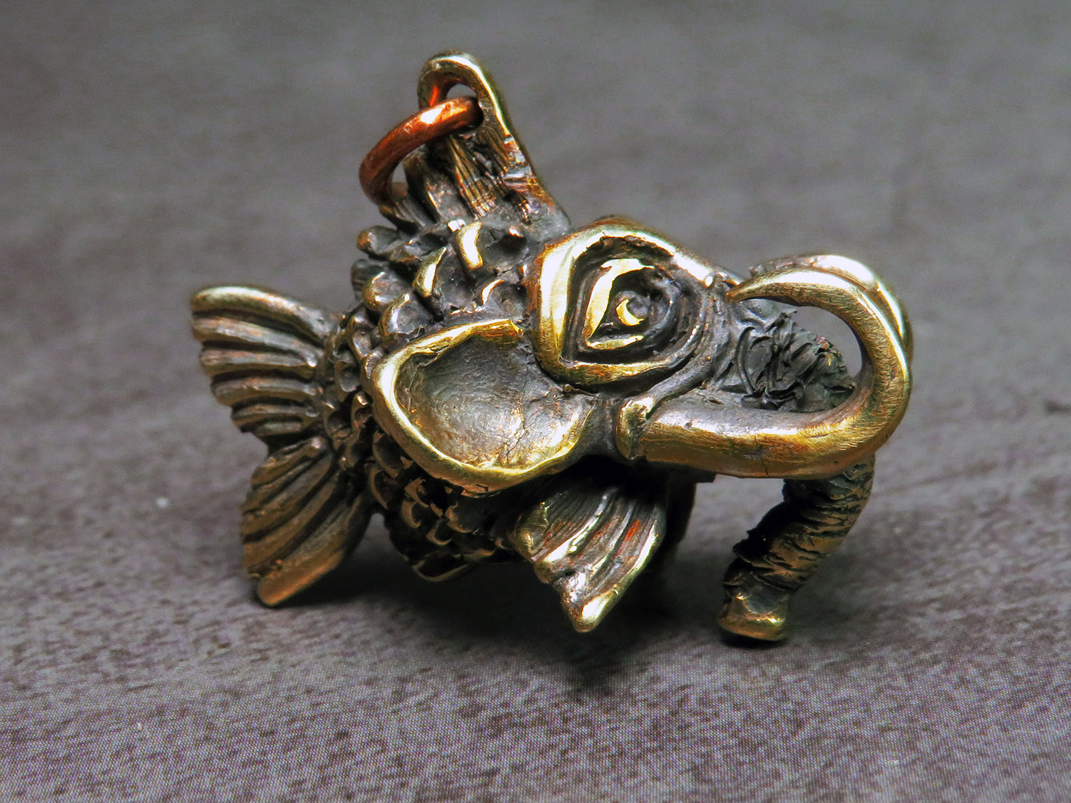 A funny bronze pendant in the form of a small fish with an elephant head. Or a small elephant with a fish body.