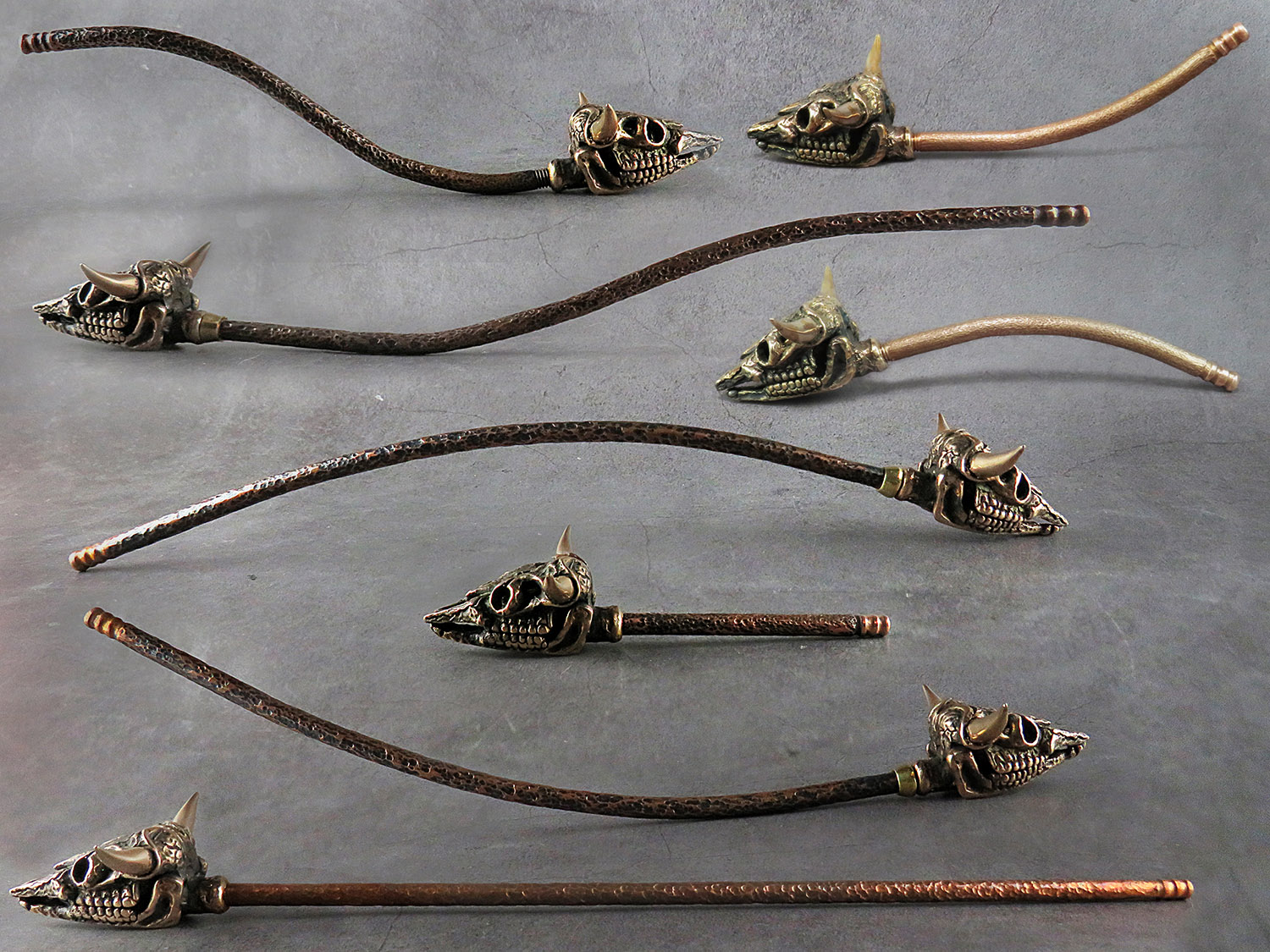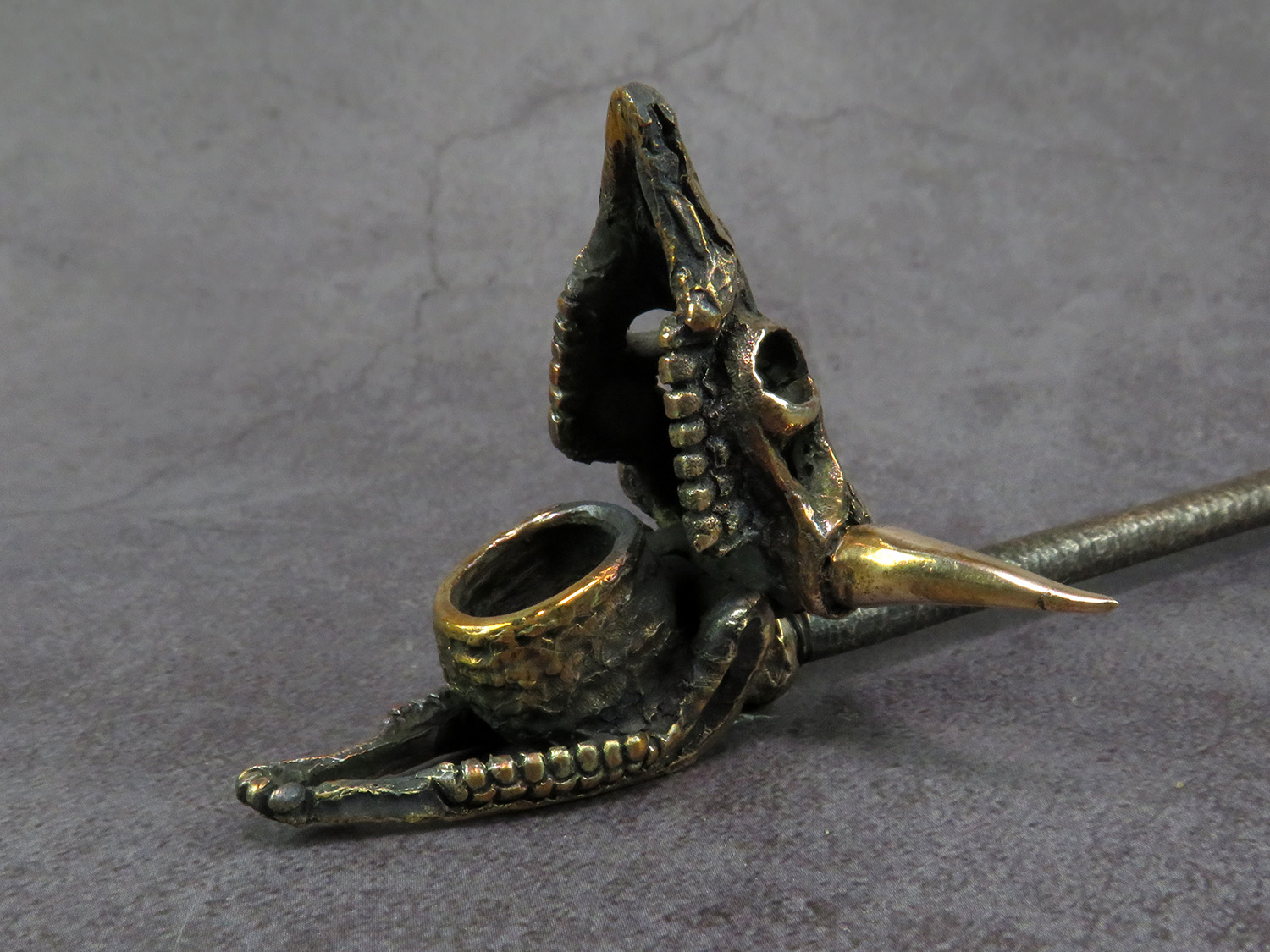 Bronze smoking pipe in the shape of a bull's skull, with a lid - the upper jaw. This is not only a smoking accessory, but also a wonderful souvenir. The mouthpiece is made of copper, it is screwed on, can have a length (from 3 to 30 cm) and a shape at the request of the buyer. The pipe is working, not decorative, the model is tested by the master.