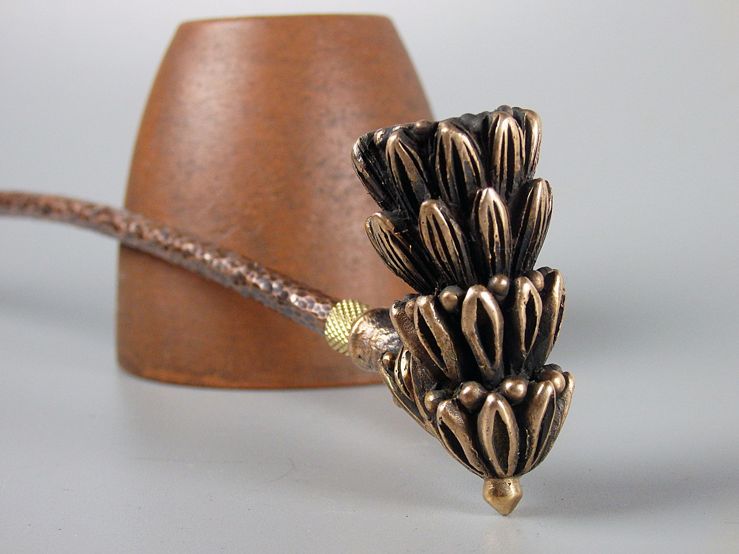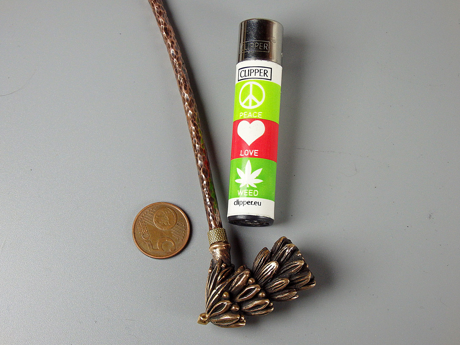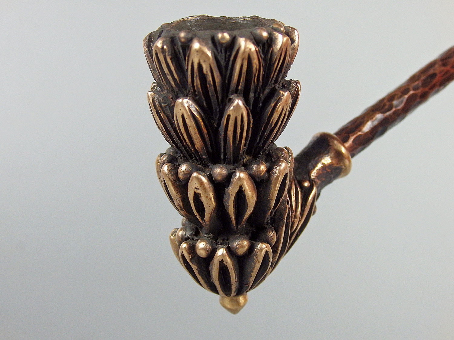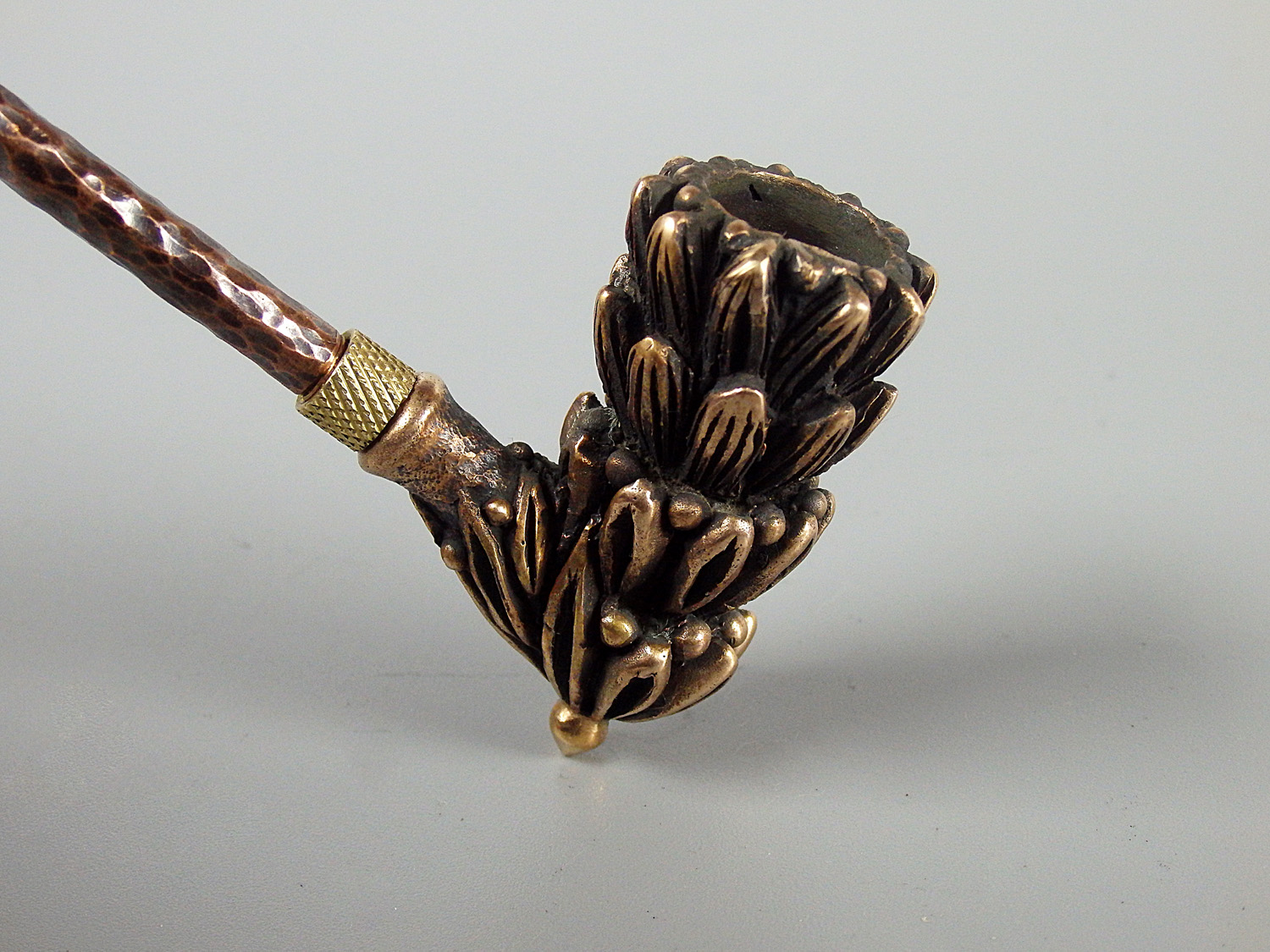 Designer bronze churchwarden pipe with a bowl resembling a bunch of tropical fruits or an exotic flower. The mouthpiece is made of copper, it is screwed on, can have a length (from 5 to 30 cm) and a shape at the request of the buyer. The pipe is working, not decorative, the model is tested by the master.