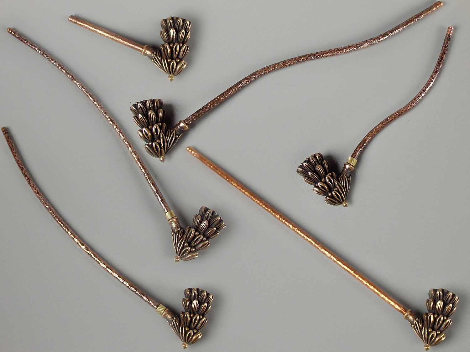 To make this item, a wax model was cut out by hand. Then, using the lost wax method, bronze parts were cast.