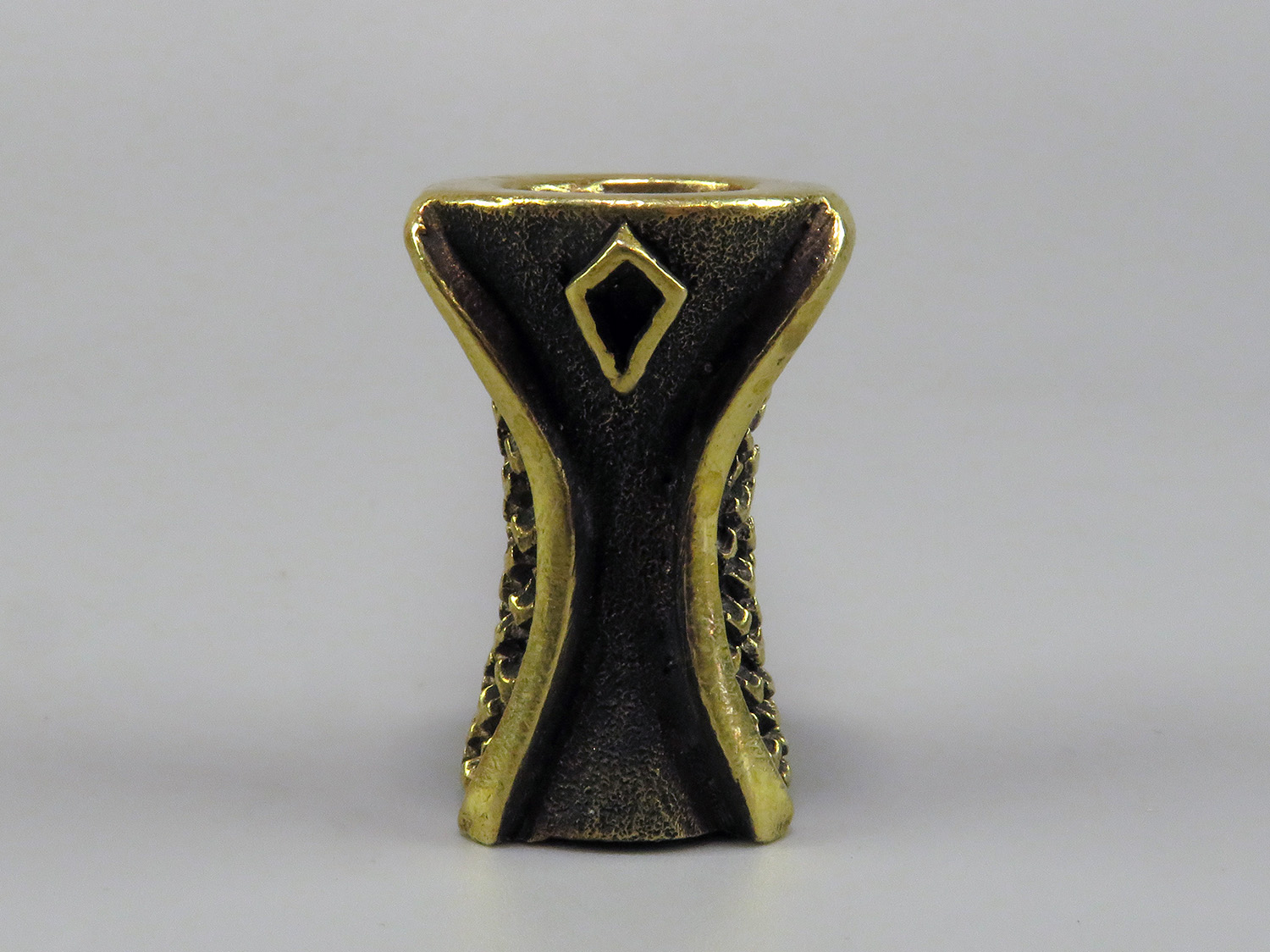 To make this item, a wax model was cut out by hand. Then, using the lost wax method, bronze parts were cast.