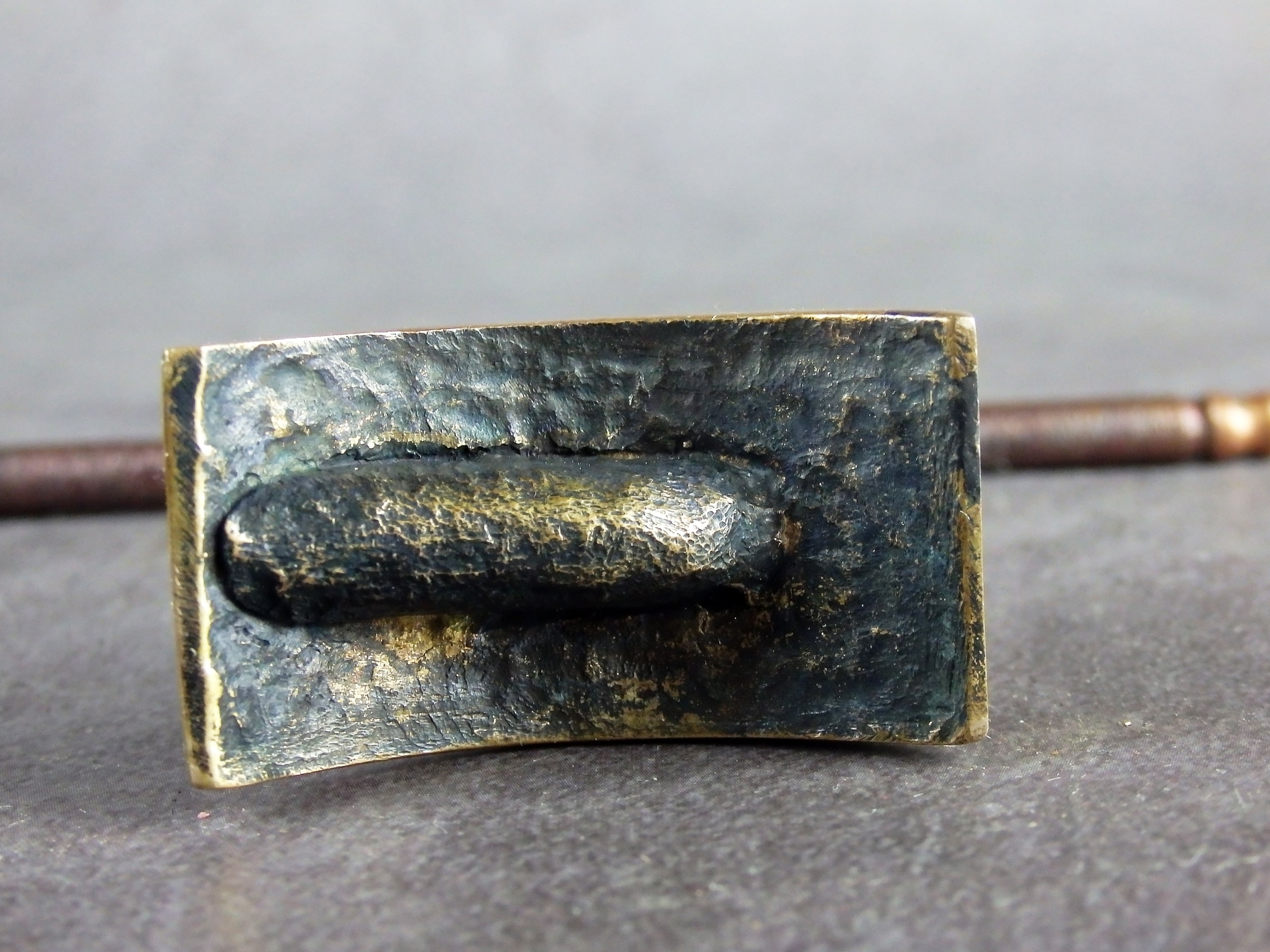 To make this item, a wax model was cut out by hand. Then, using the lost wax method, bronze parts were cast.