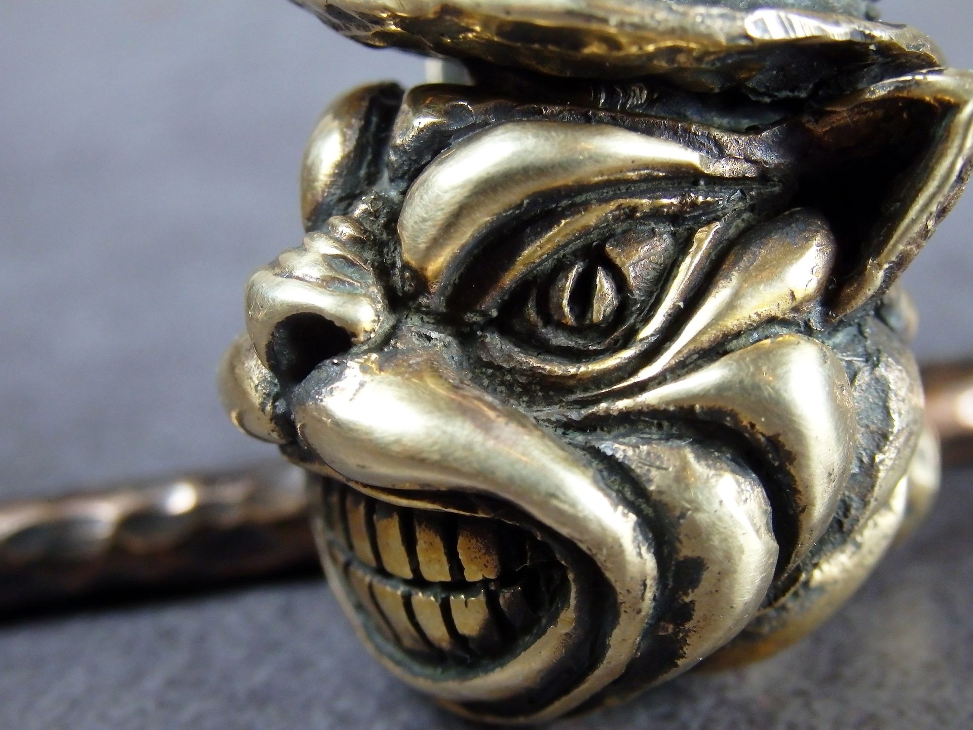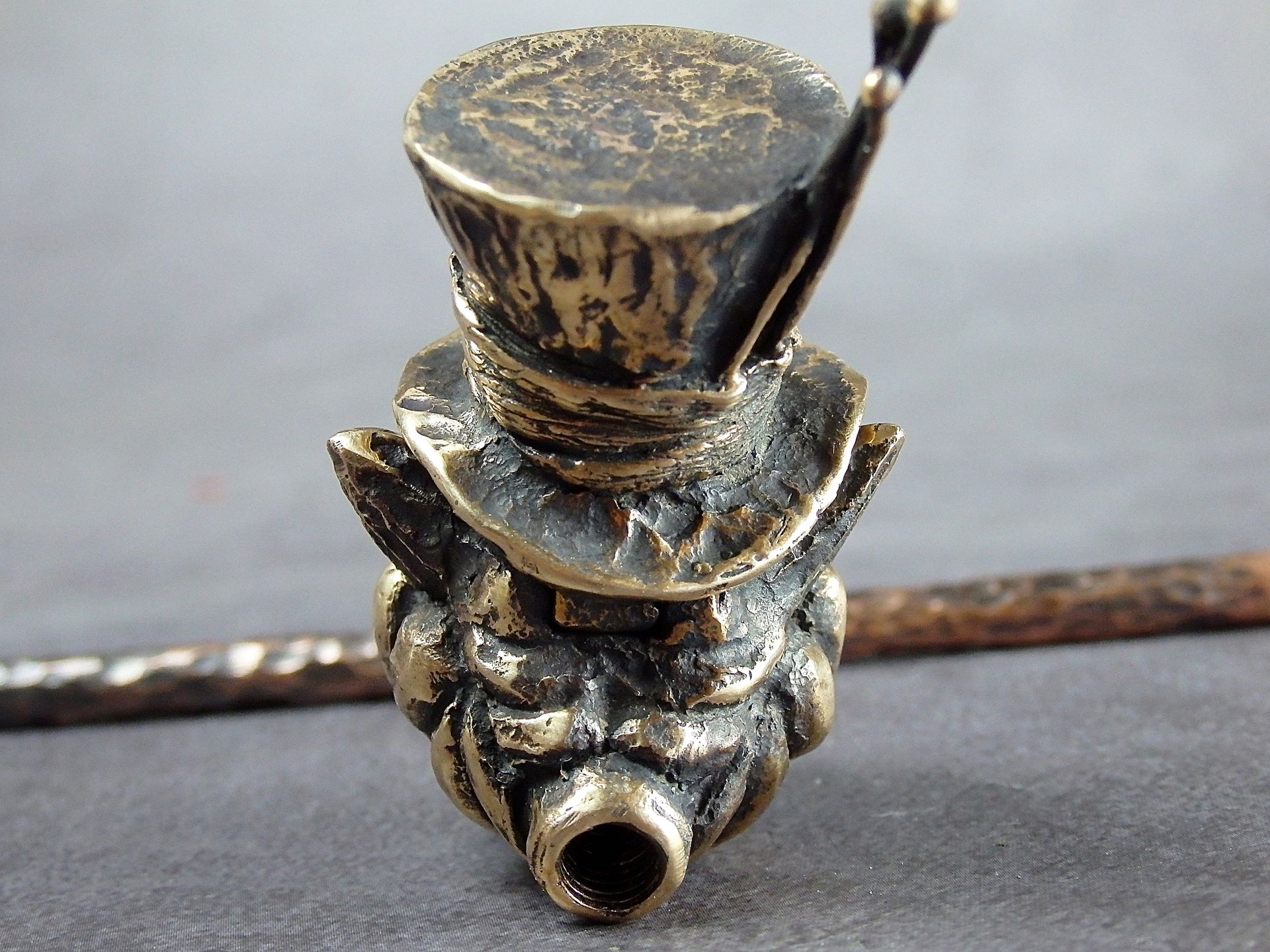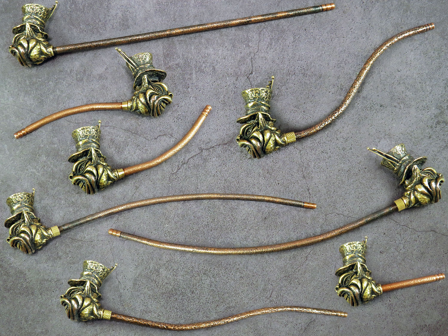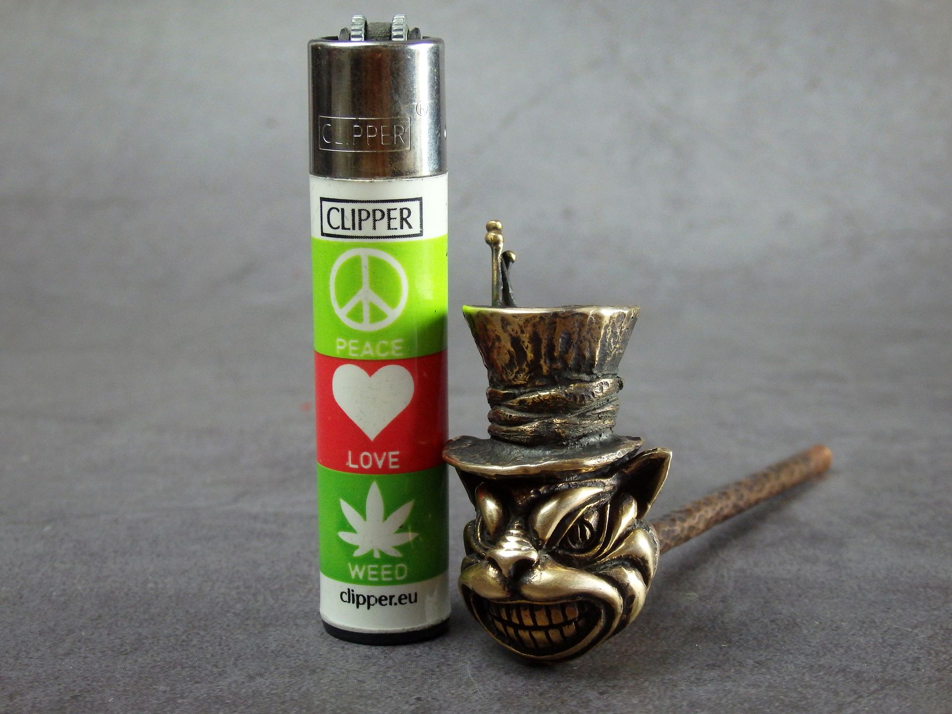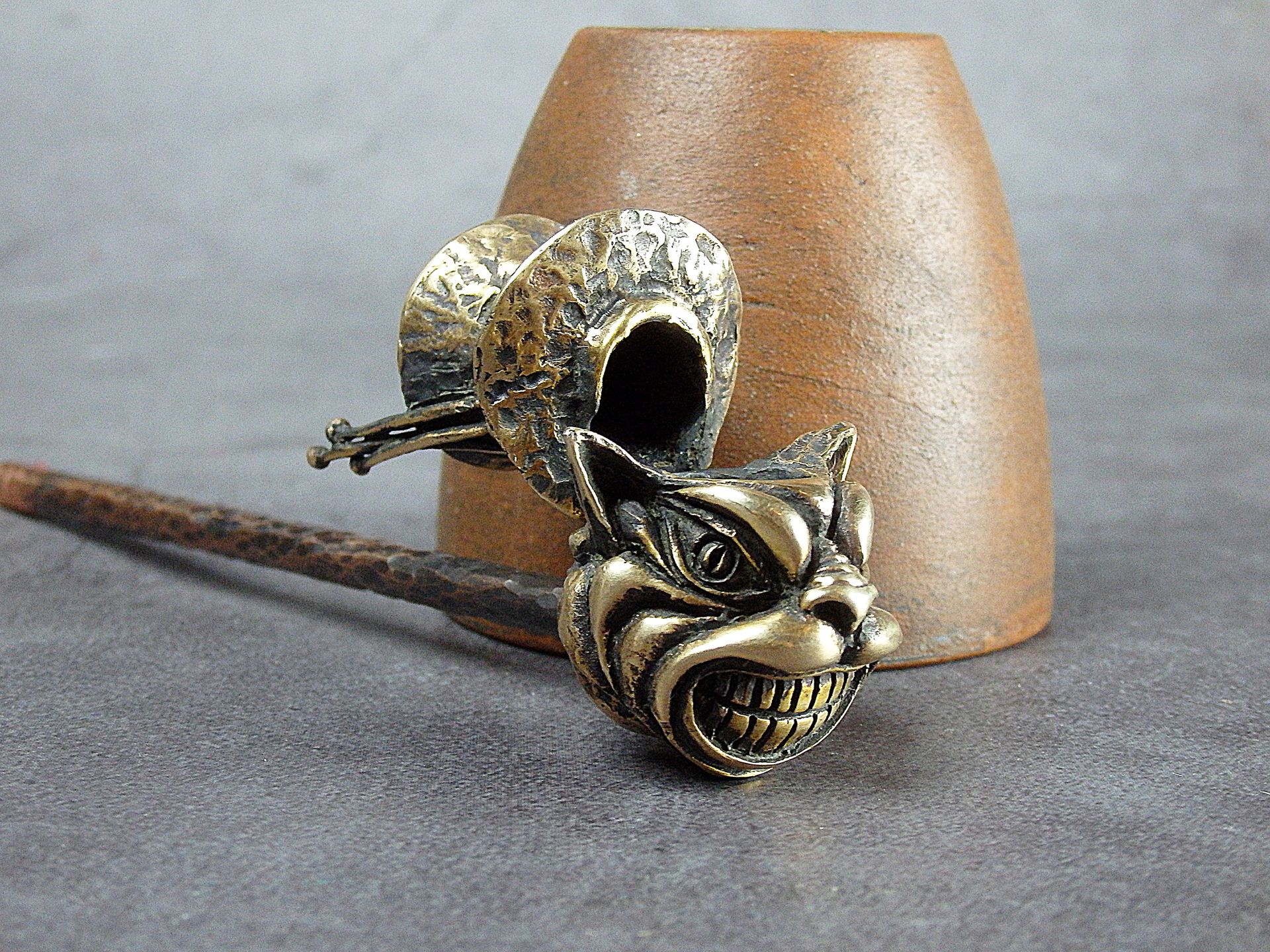 Large heavy bronze smoking pipe with a bowl in the shape of the head of a cheshire cat. The head has an opening lid and this is not only a smoking accessory, but also a wonderful souvenir. The mouthpiece is made of copper, it is screwed on, can have a length (from 3 to 30 cm) and a shape at the request of the buyer.