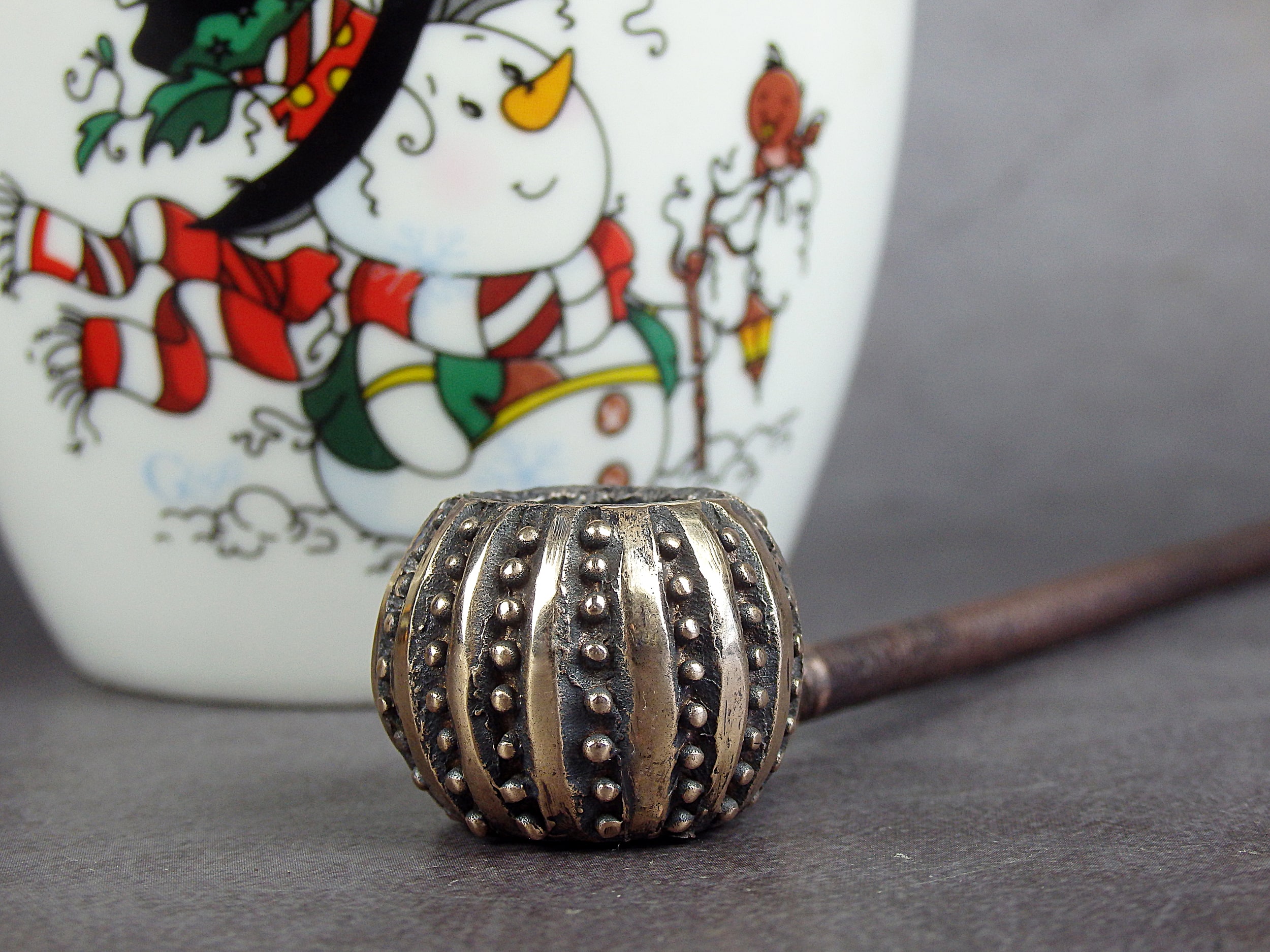 Bronze smoking pipe with a bowl in the shape of Christmas tree decoration. The mouthpiece is made of copper, it is screwed on, can have a length (from 3 to 30 cm) and a shape at the request of the buyer. The pipe is working, not decorative, the model is tested by the master.