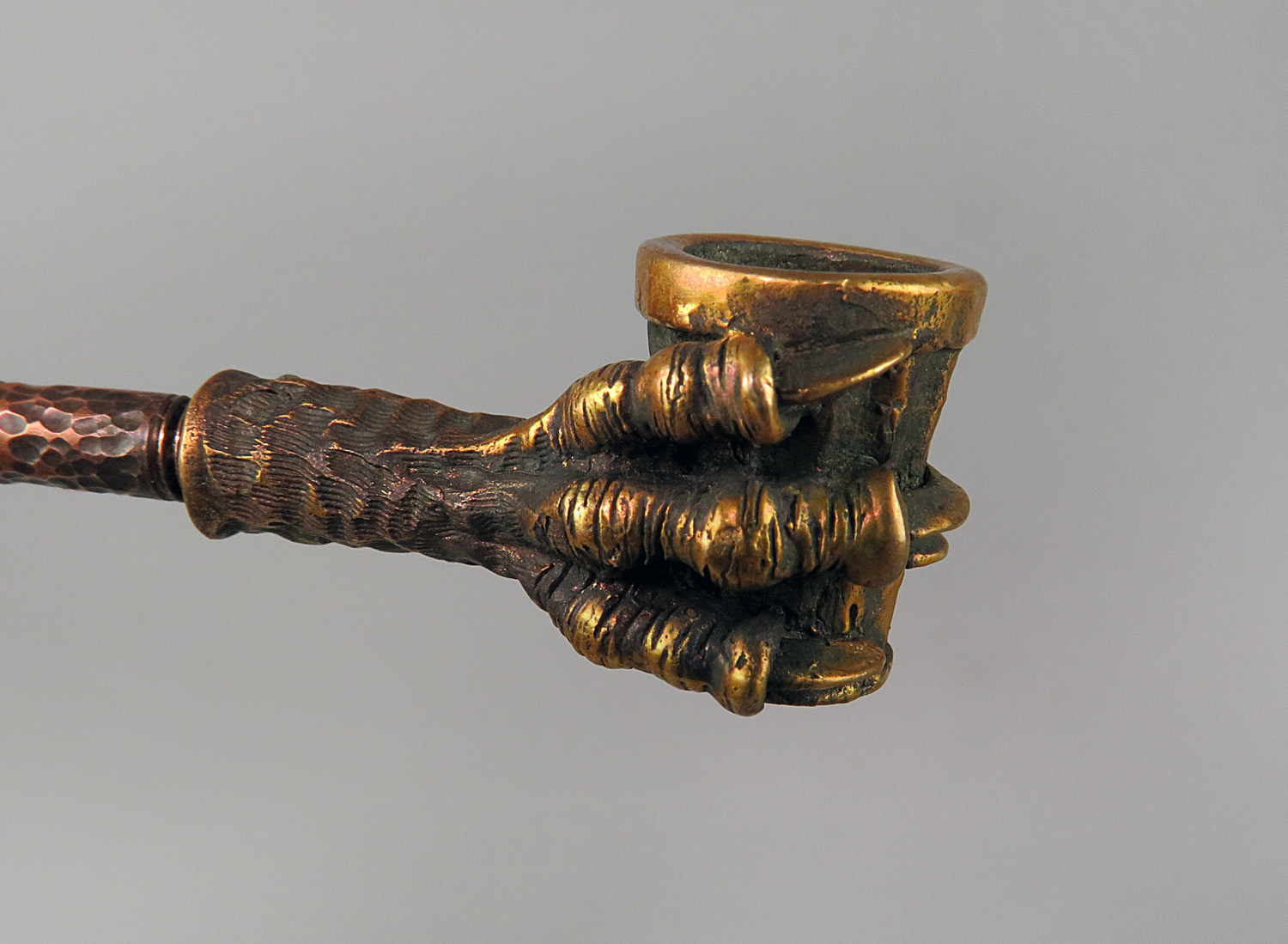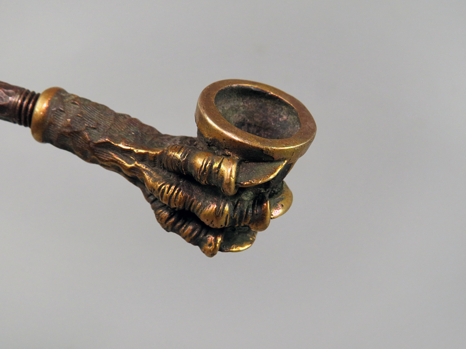 To make this item, a wax model was cut out by hand. Then, using the lost wax method, bronze parts were cast.