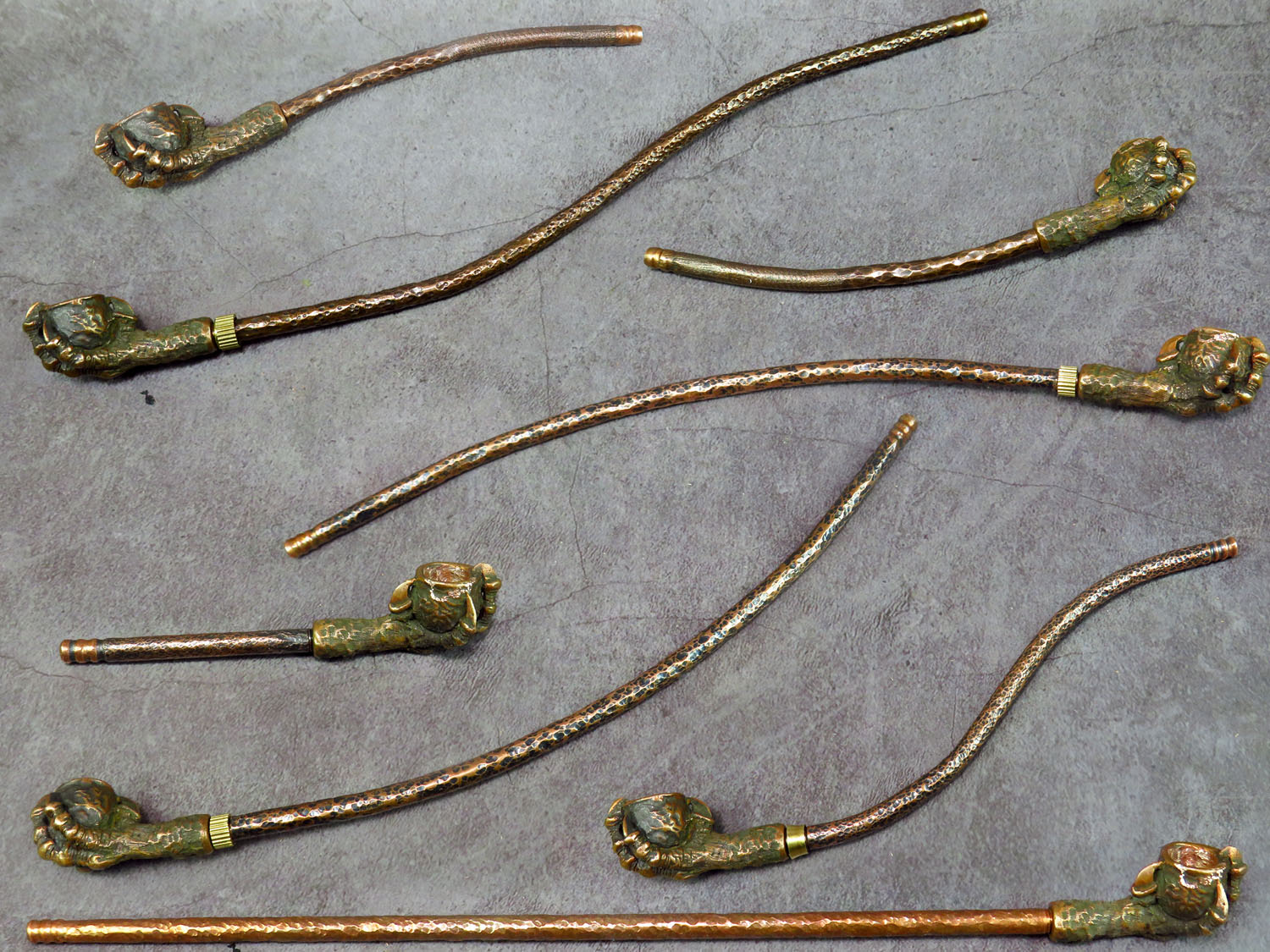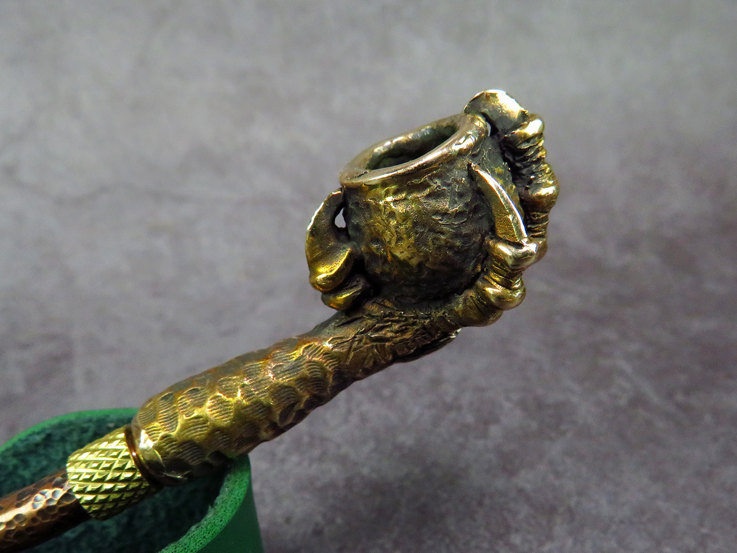 Small bronze smoking pipe with a bowl in the shape clawed paw that holds the pot. The mouthpiece is made of copper, it is screwed on, can have a length (from 3 to 30 cm) and a shape at the request of the buyer. The pipe is working, not decorative, the model is tested by the master.