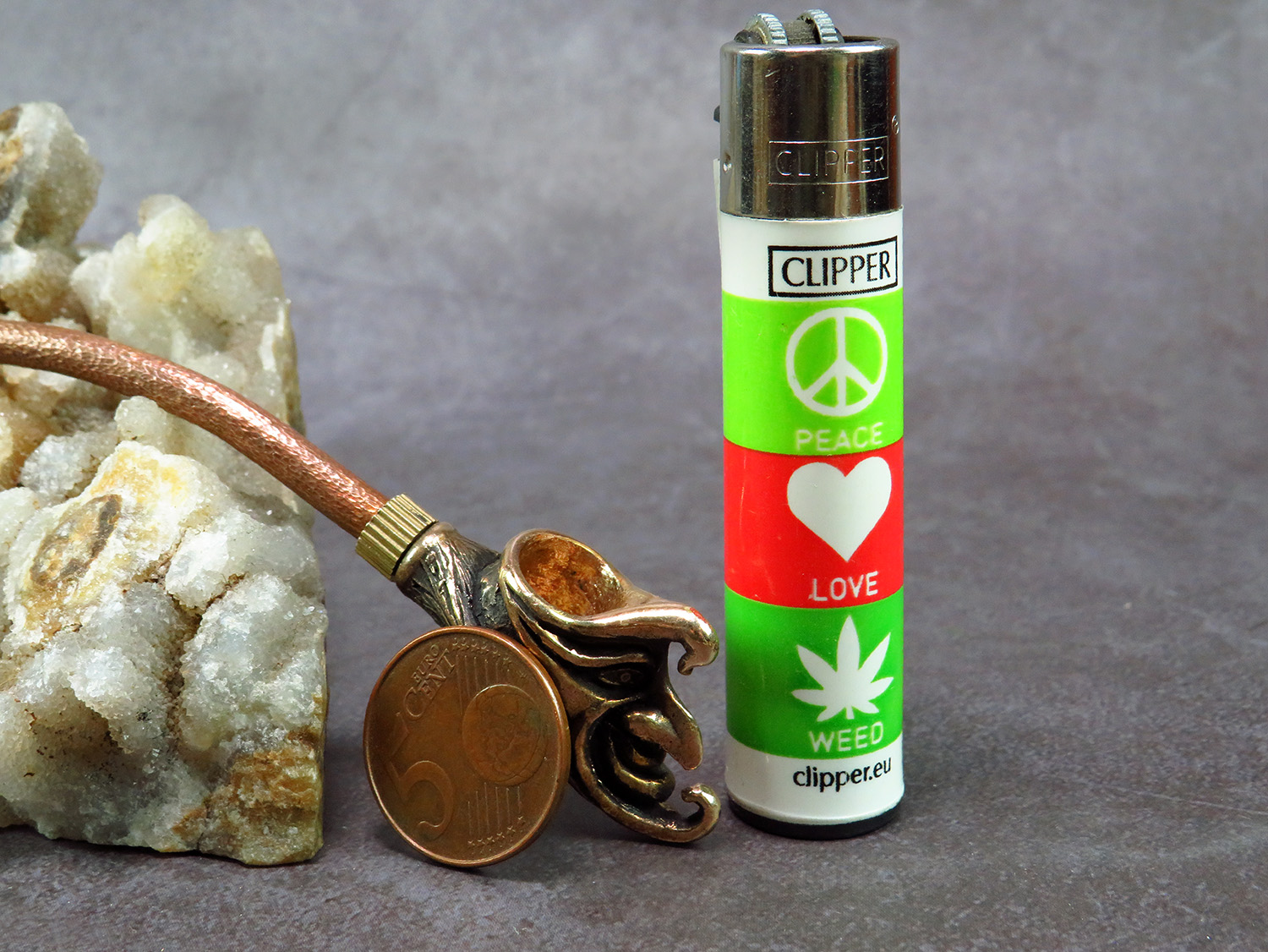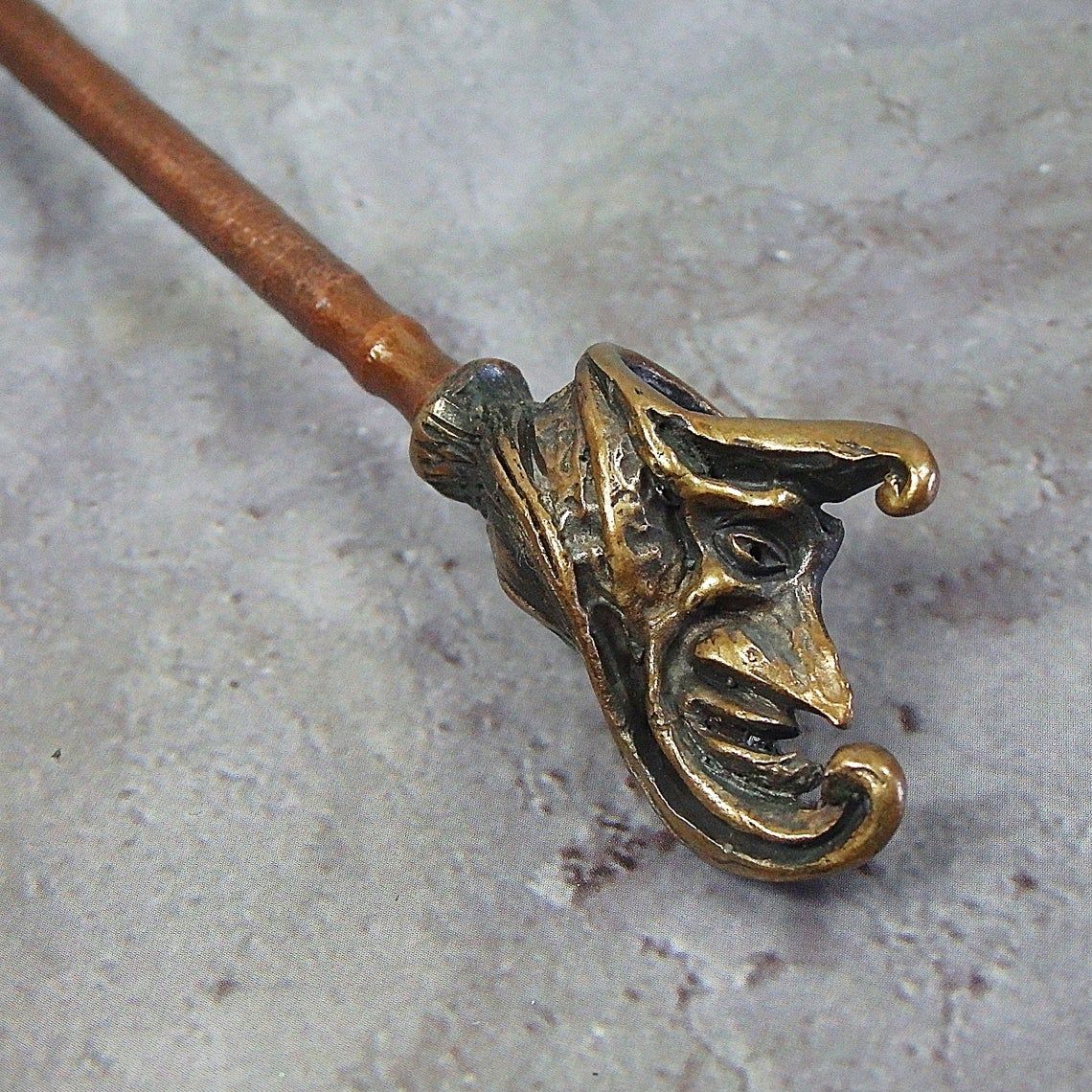 Bronze smoking pipe with a bowl in the shape of venetian clown month. The mouthpiece is made of copper, it is screwed on, can have a length (from 3 to 30 cm) and a shape at the request of the buyer. Note: When choosing a mouthpiece, please keep in mind that this pipe will stand on the surface only with a straight mouthpiece.