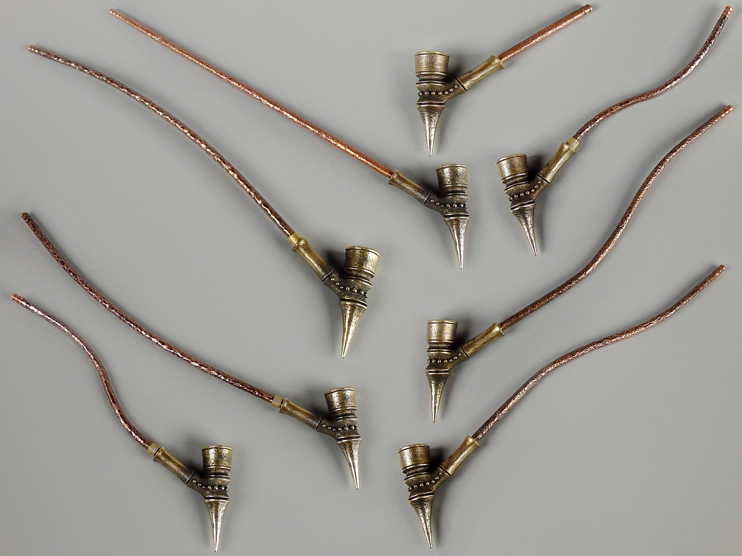 To make this item, a wax model was cut out by hand. Then, using the lost wax method, bronze parts were cast.