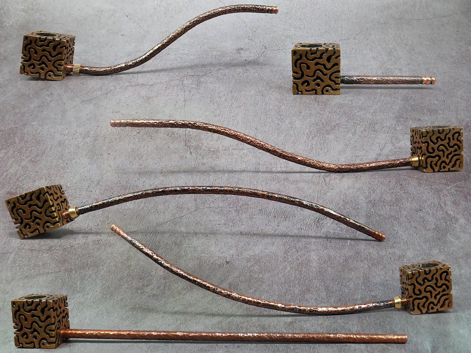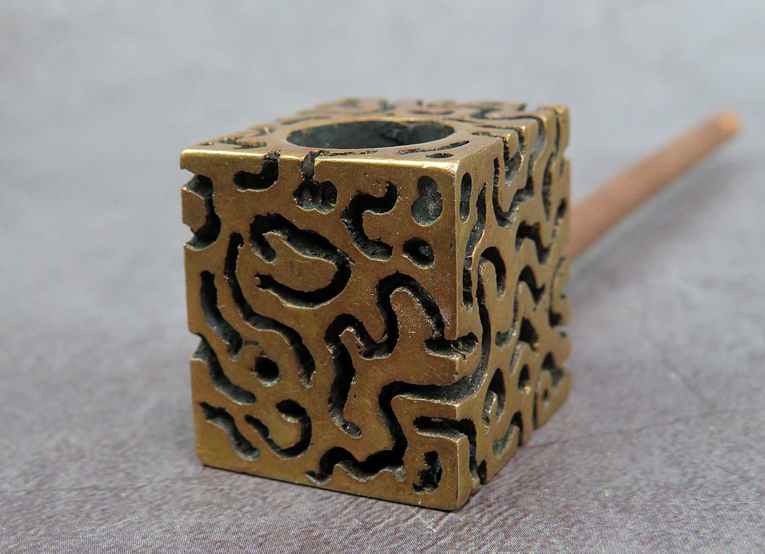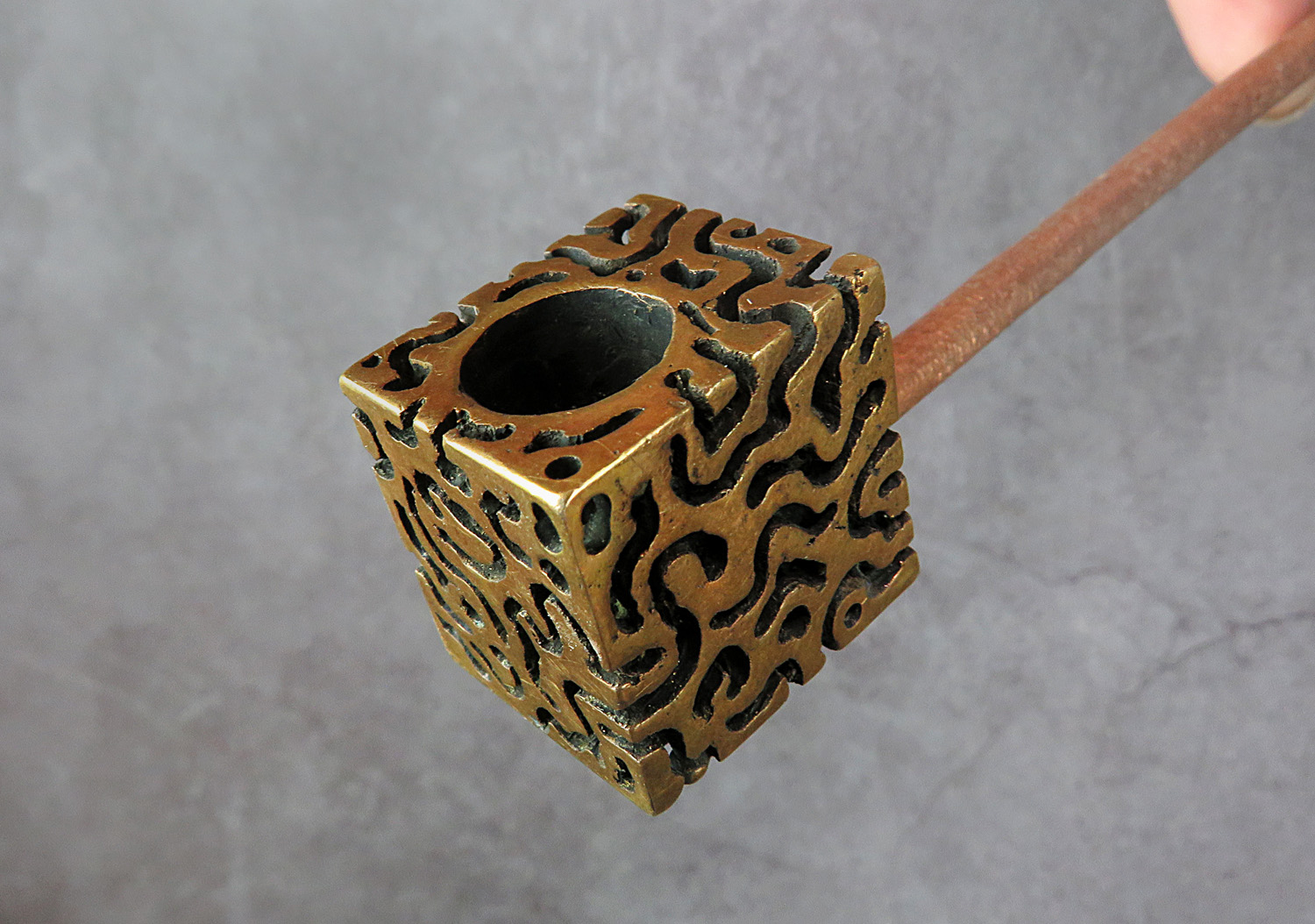An unusual square bronze pipe, as if gnawed by a bark beetle. The pipe is made in a single copy. It can be replicated as an idea, but the pattern will differ since the grooves cannot be reproduced in the same way and will be located differently.