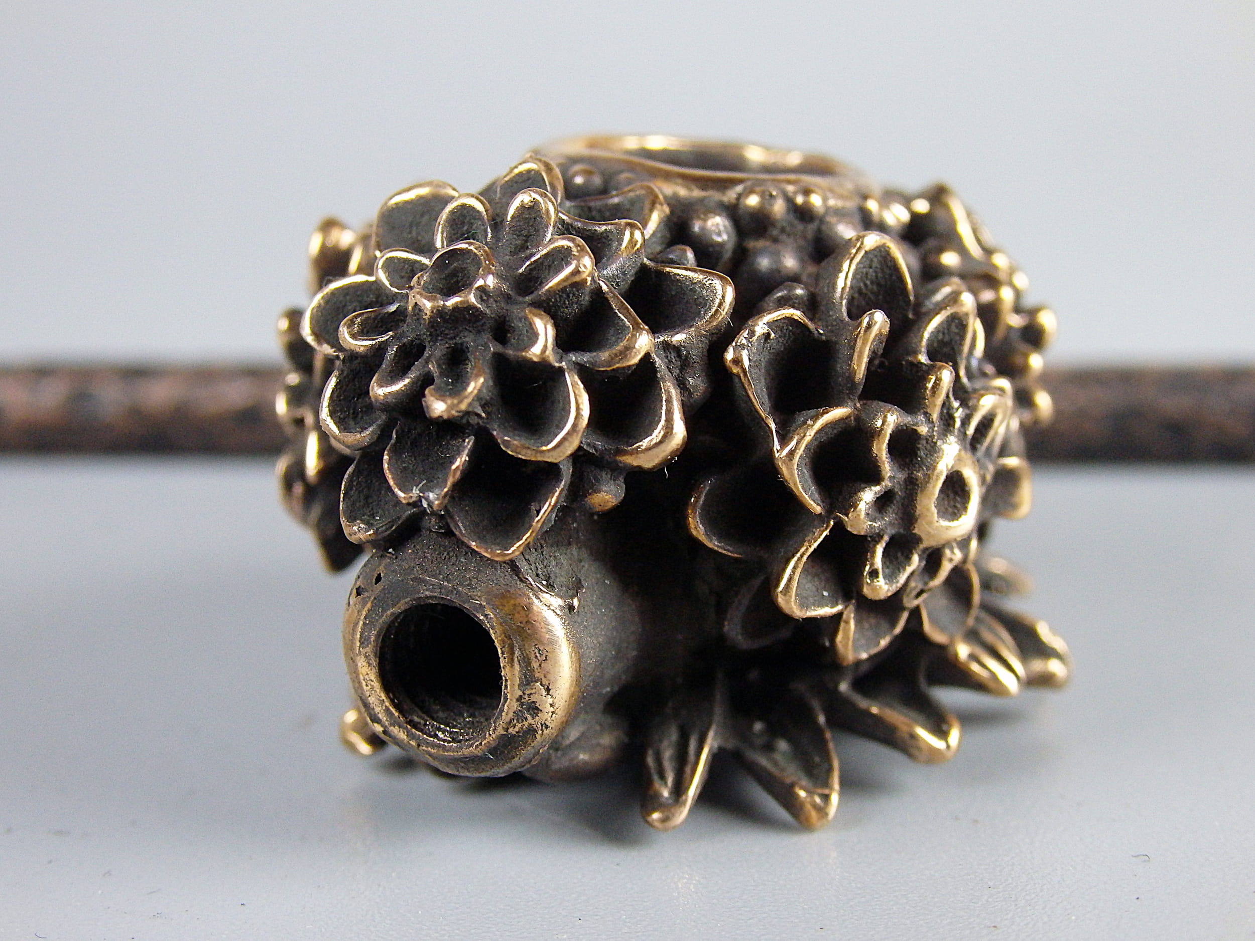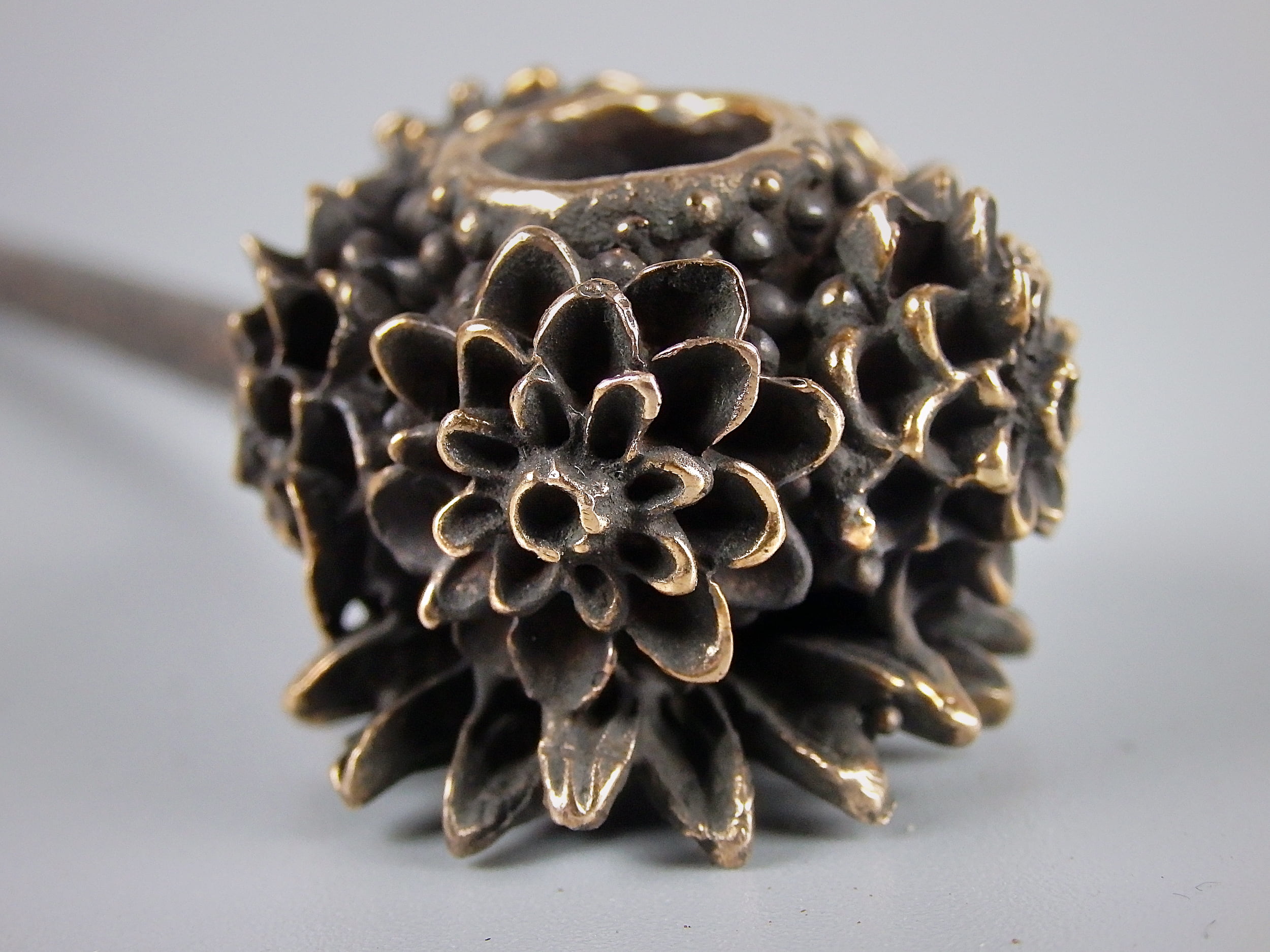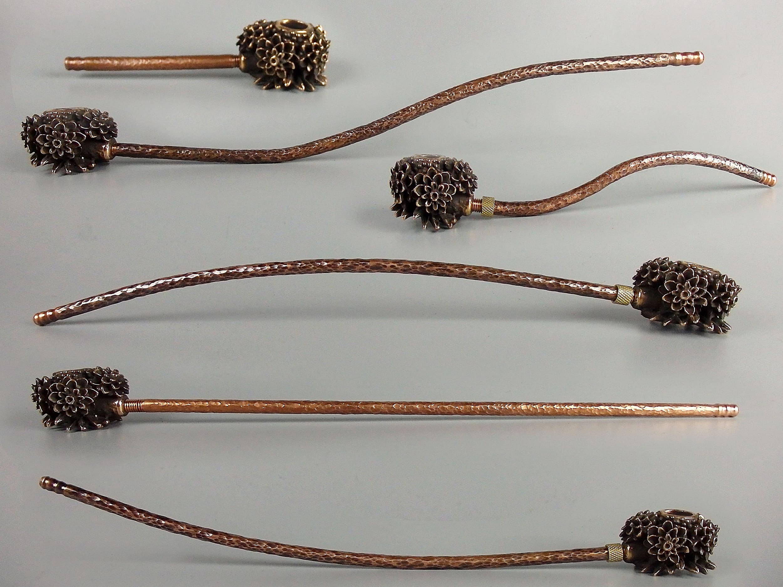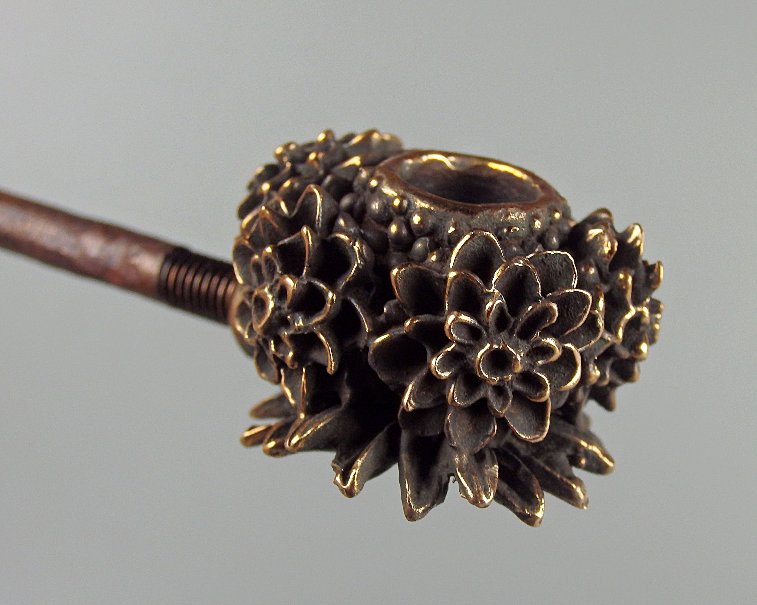 Bronze smoking pipe with a bowl in the shape of a dahlia bouquet and is perfect as a fun alternative to the classic floral gift. The mouthpiece is made of copper, it is screwed on, can have a length (from 3 to 30 cm) and a shape at the request of the buyer. The pipe is working, not decorative, the model is tested by the master.
