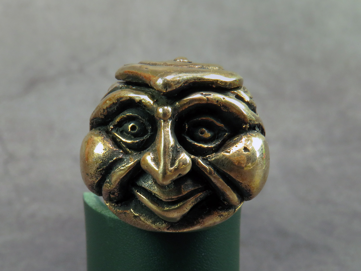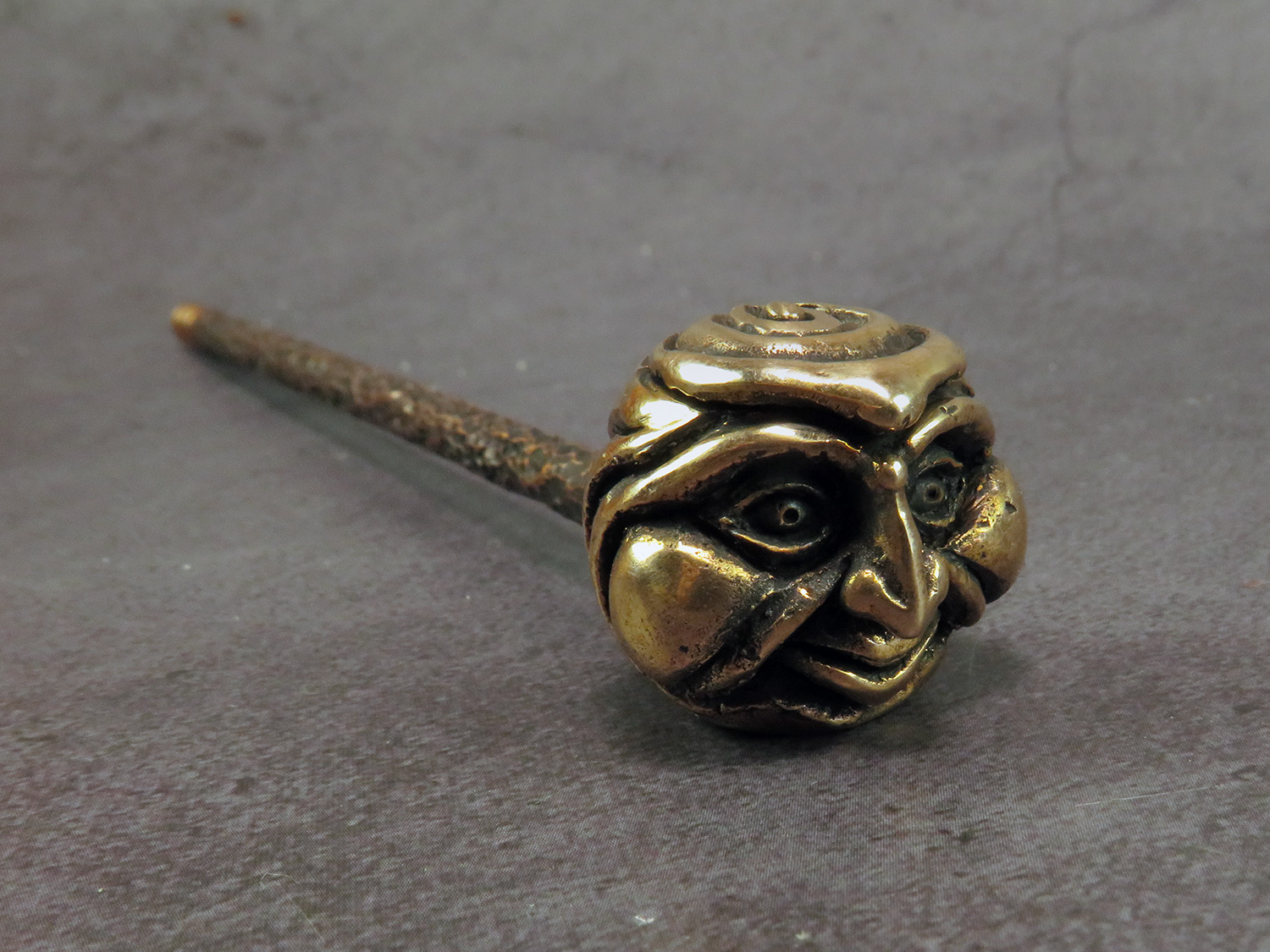 Handmade smoking pipe with a funny face in the spirit Daikokuten (大黒天) is a syncretic Japanese deity of fortune, wealth and household. But it could be whoever you think it is. The mouthpiece is made of copper, it is screwed on, can have a length (from 3 to 30 cm) and a shape at the request of the buyer. Note! When choosing a mouthpiece, keep in mind that this pipe can stand on a plane only with straight mouthpiece.