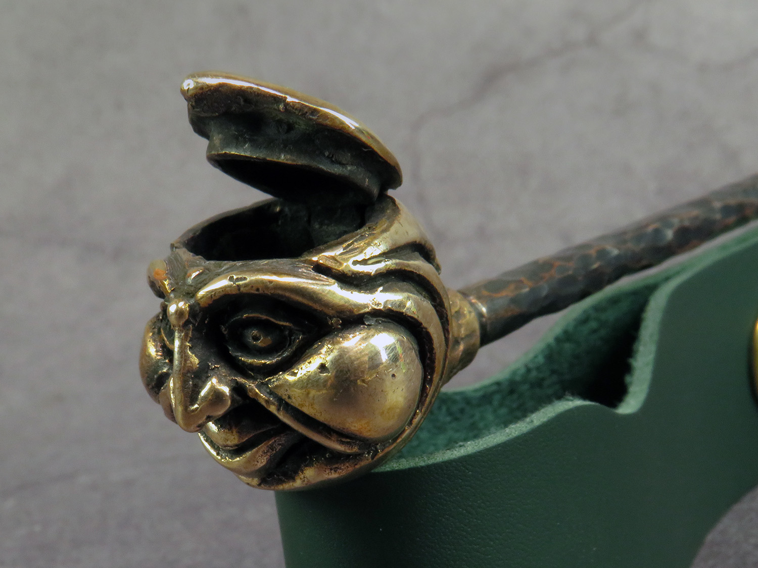 To make this item, a wax model was cut out by hand. Then, using the lost wax method, bronze parts were cast.