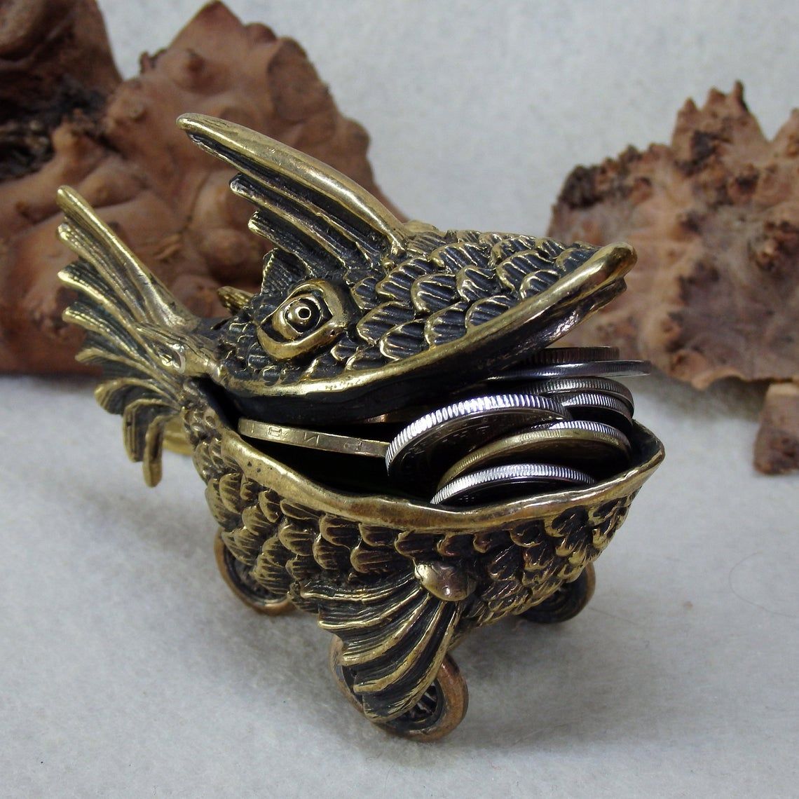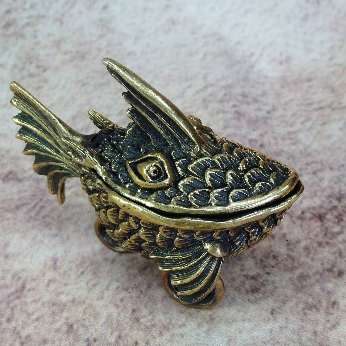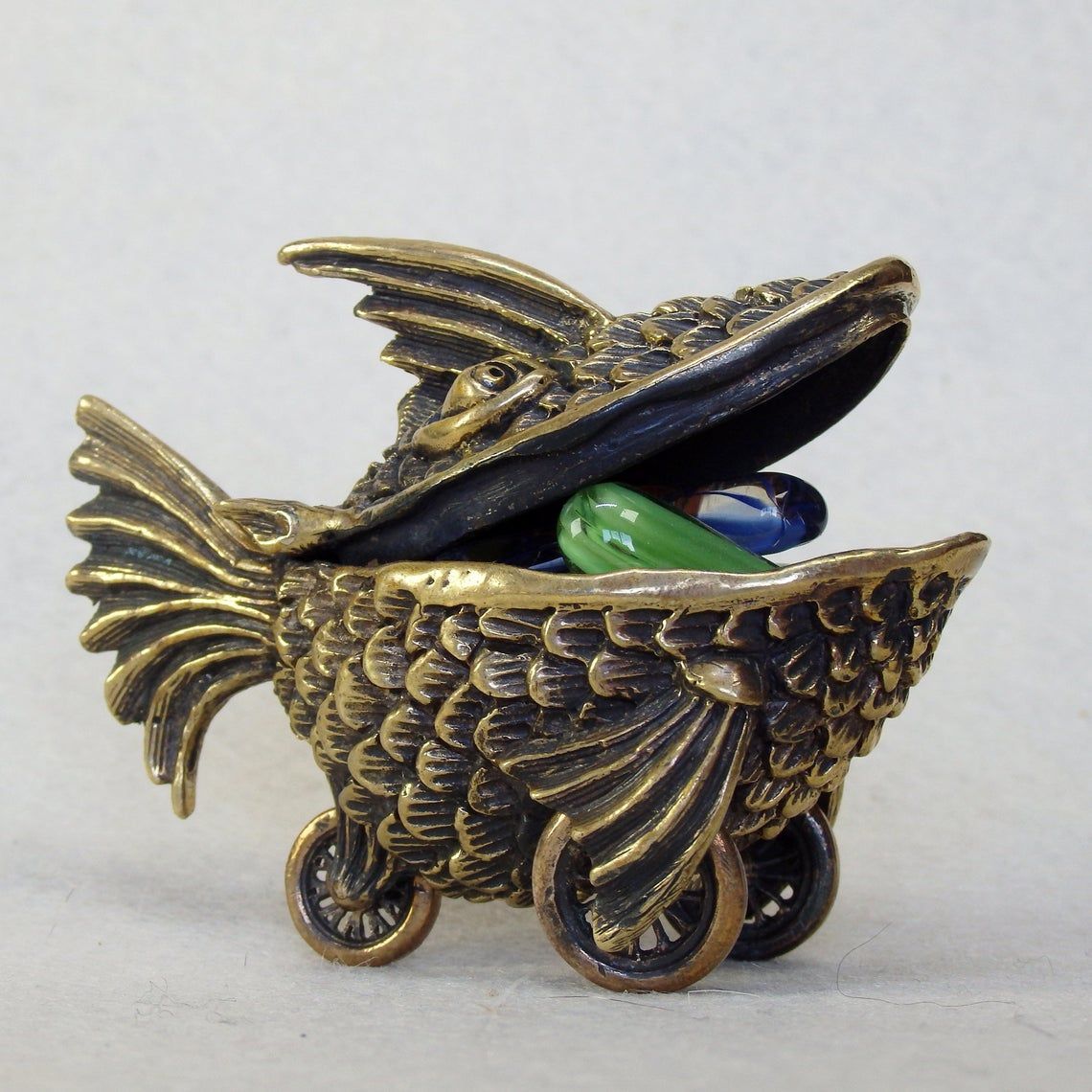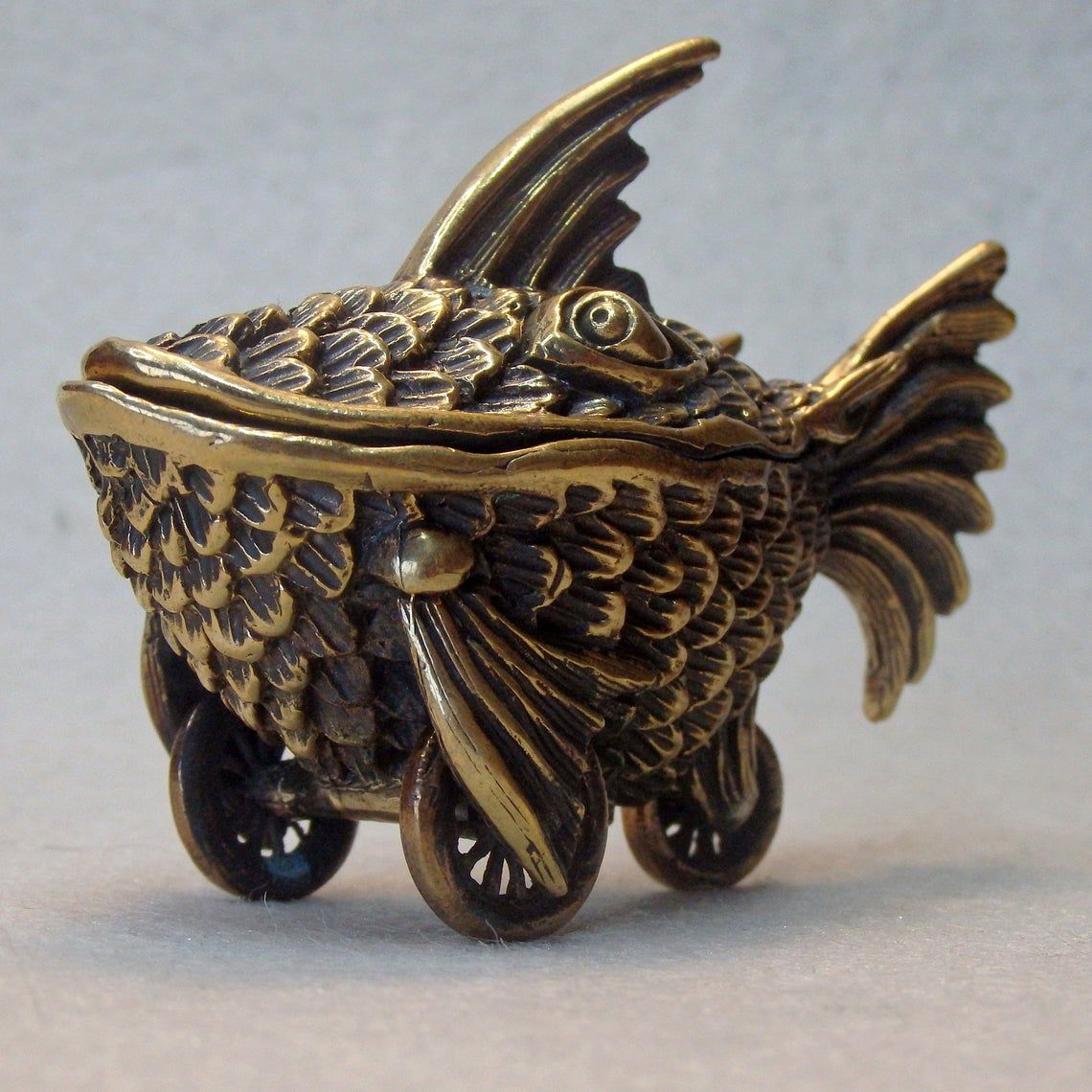 A small bronze surreal casket in the form of a fish on wheels. This unusual and unique thing can be used as a funny moneybox or storage for jewelry or small items. And tobacco lovers can use this as an ashtray.