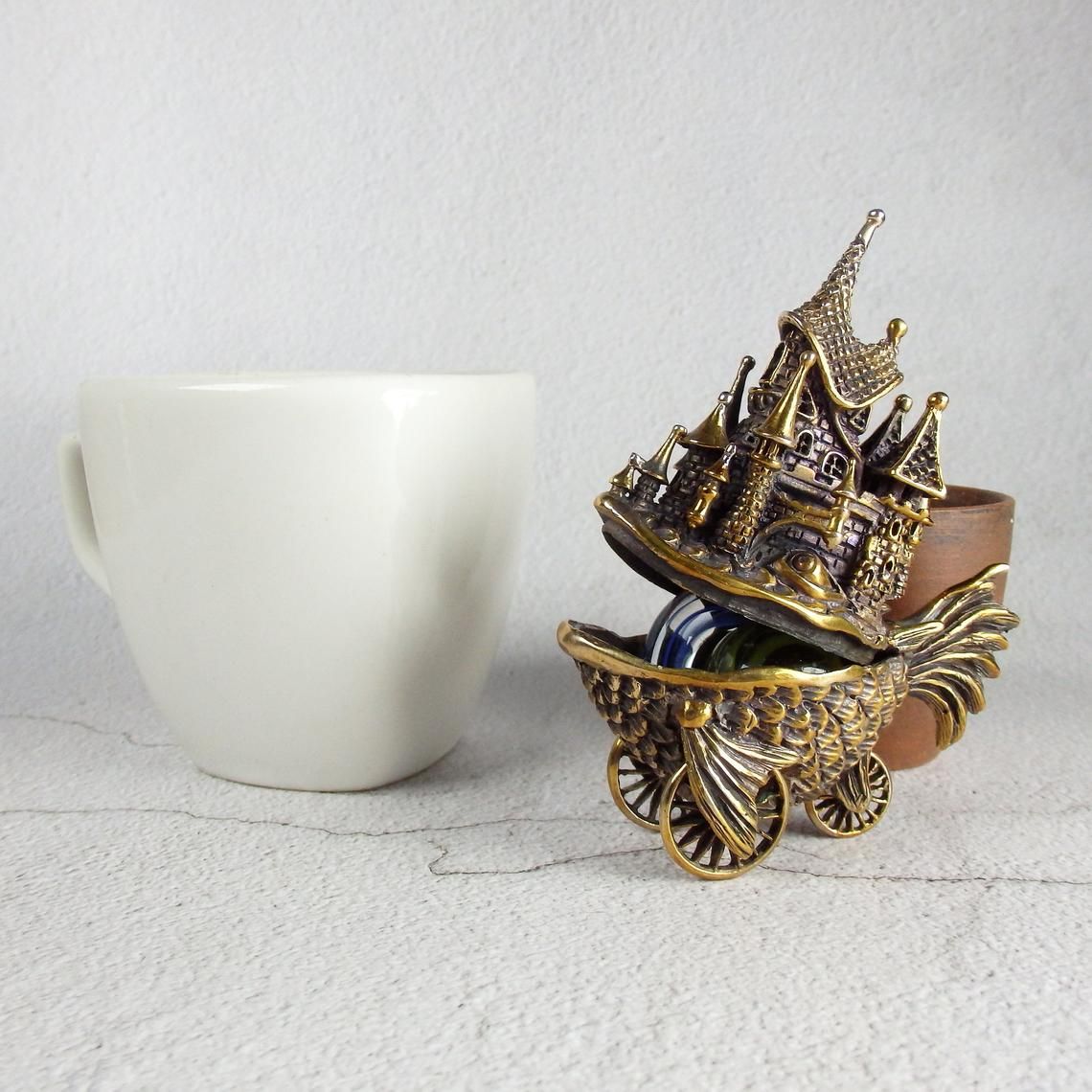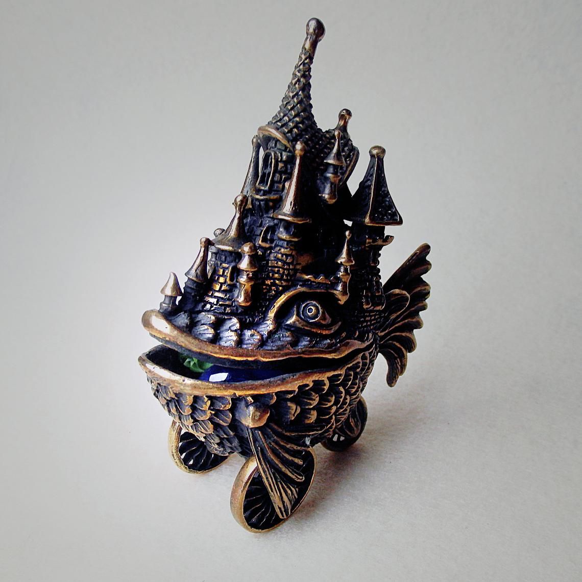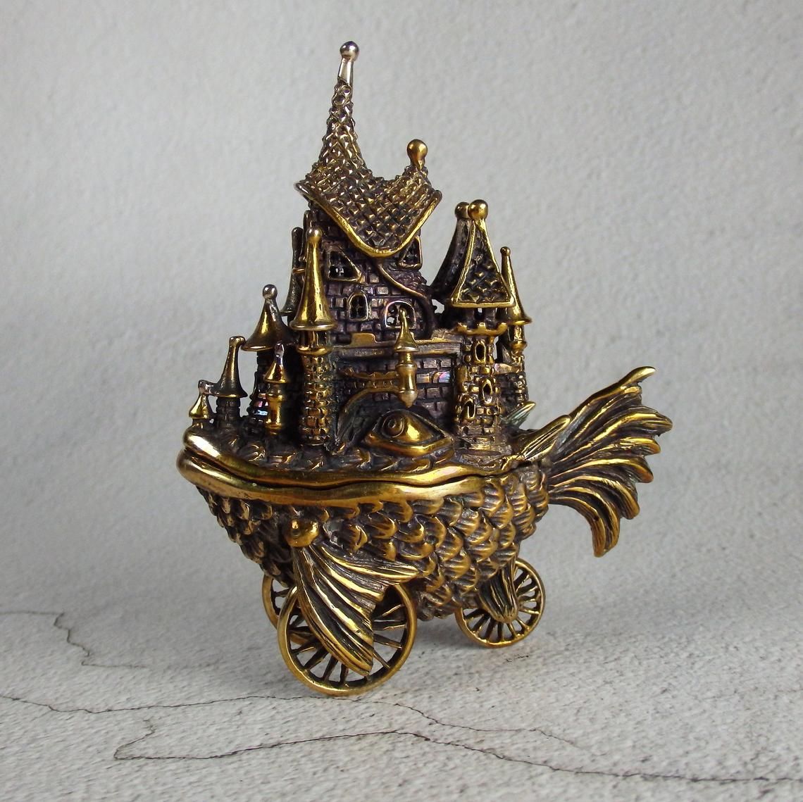 A small bronze surreal casket in the form of a wheeled fish with a castle. This unusual and unique thing can be used as a funny moneybox or storage for jewelry or small items. And tobacco lovers can use this as an ashtray.