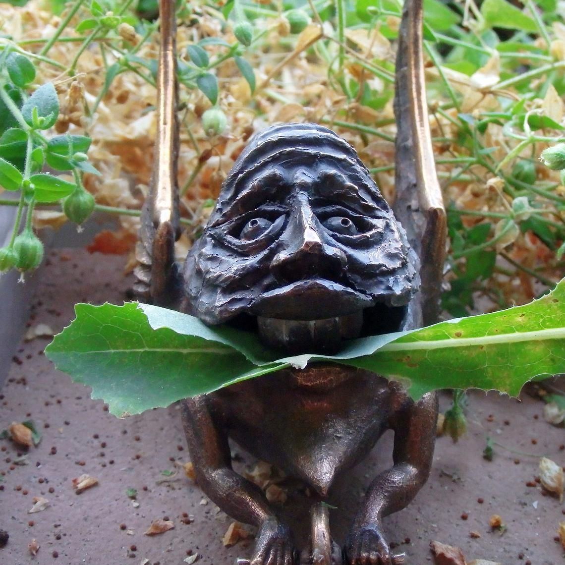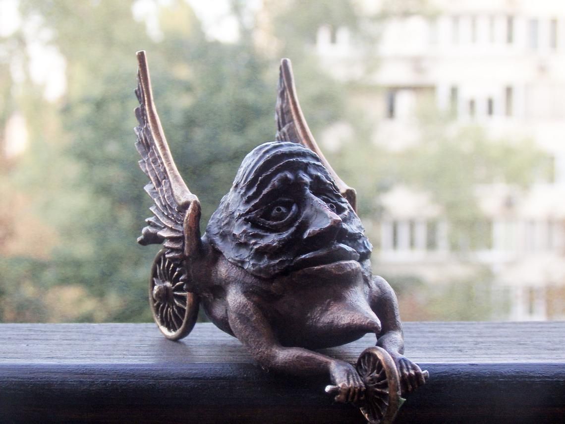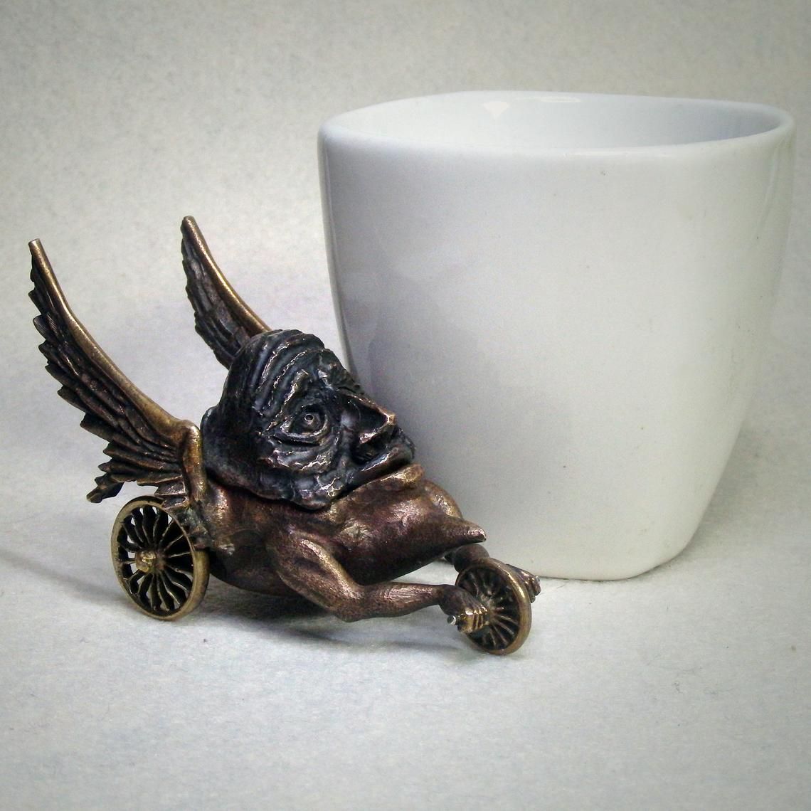 Surreal bronze casket in the form of a flying ass on wheels. Hands this creature holds on to the wheels, and the upper part of the head serves as a lid.