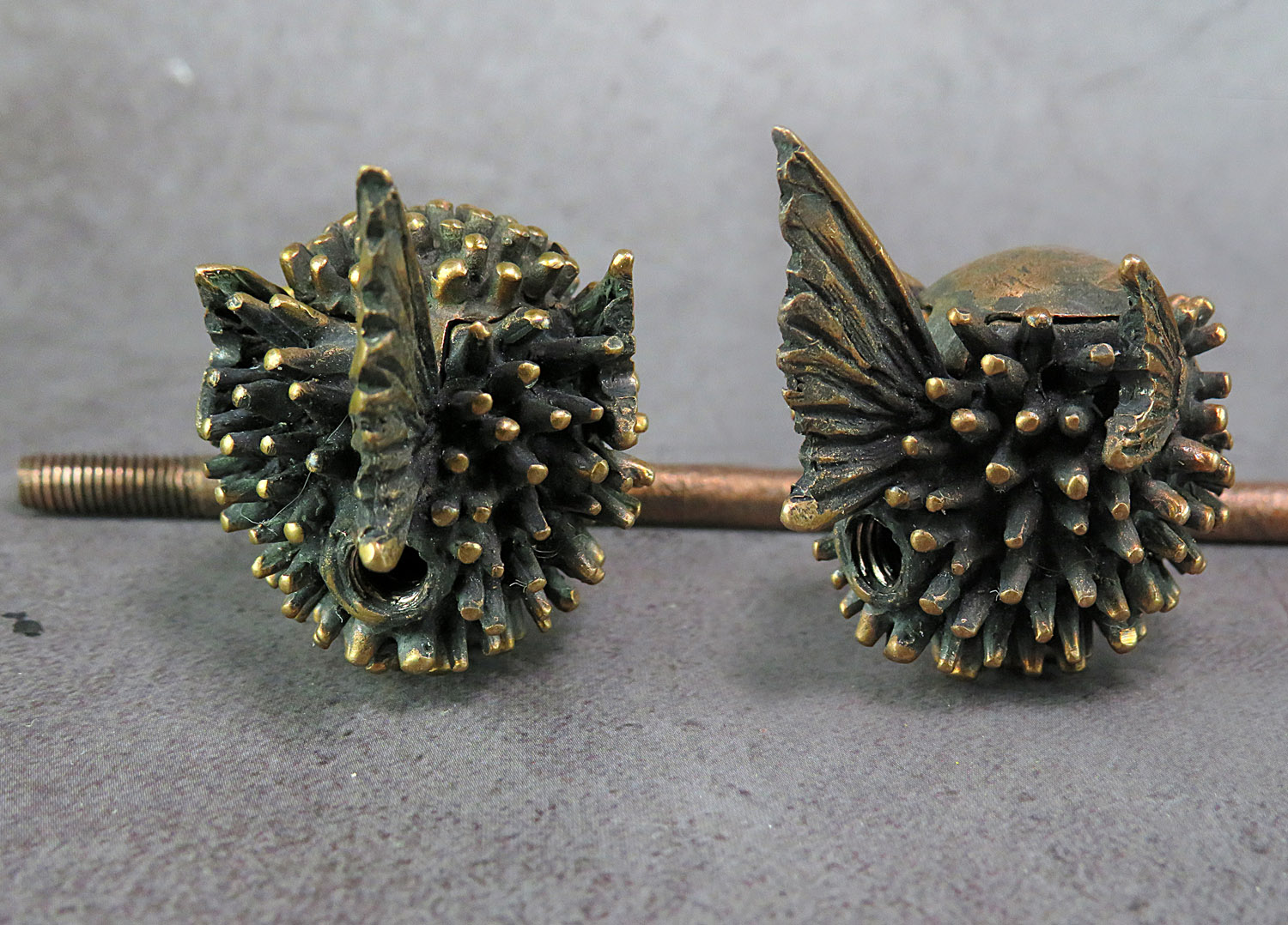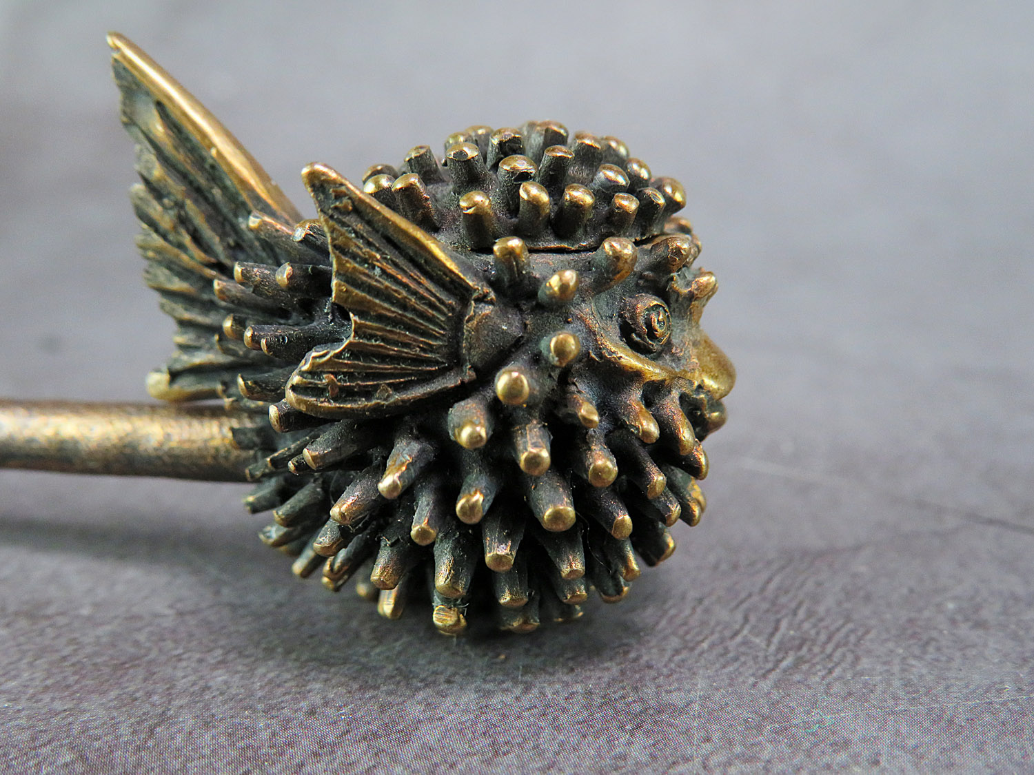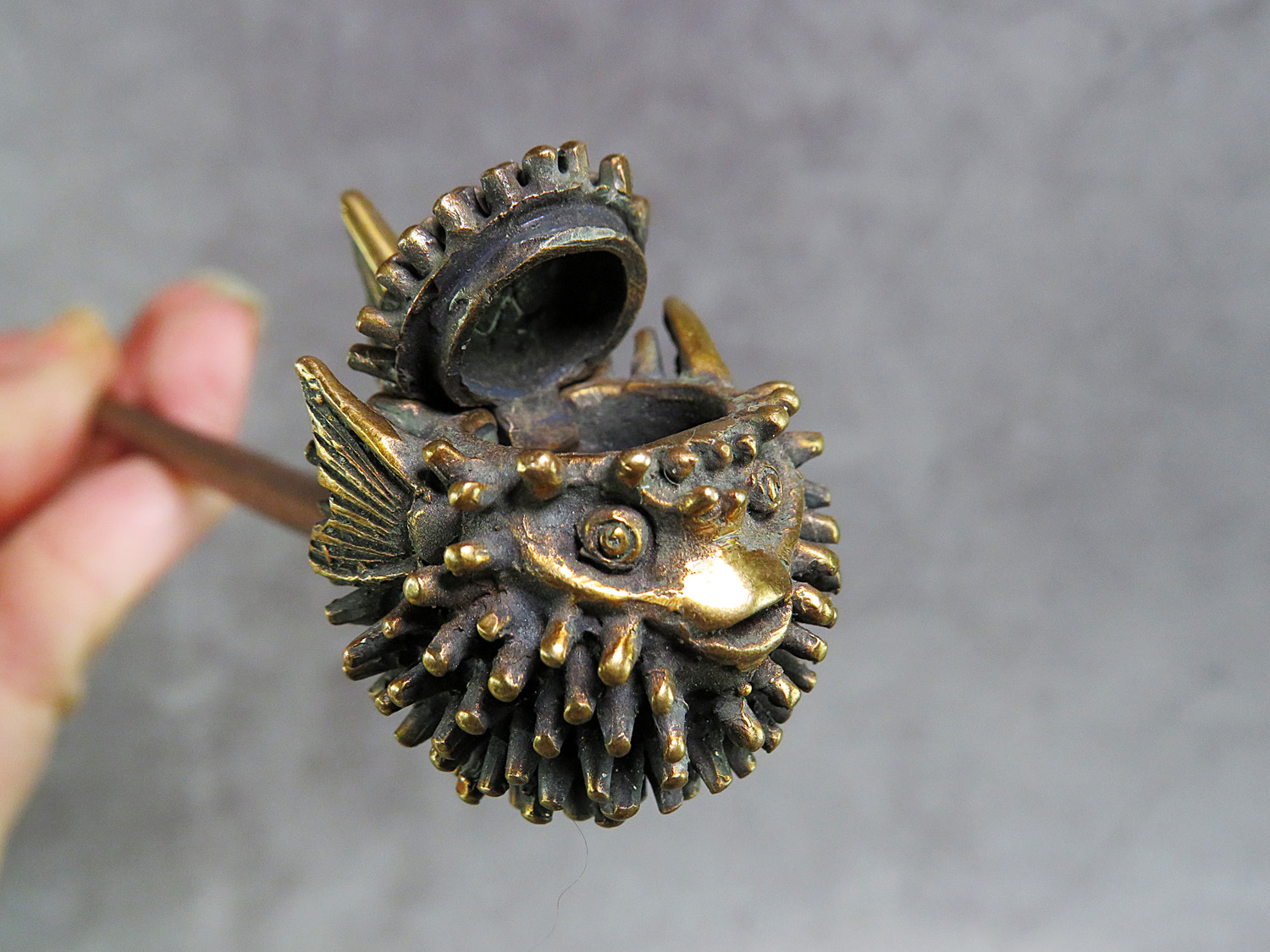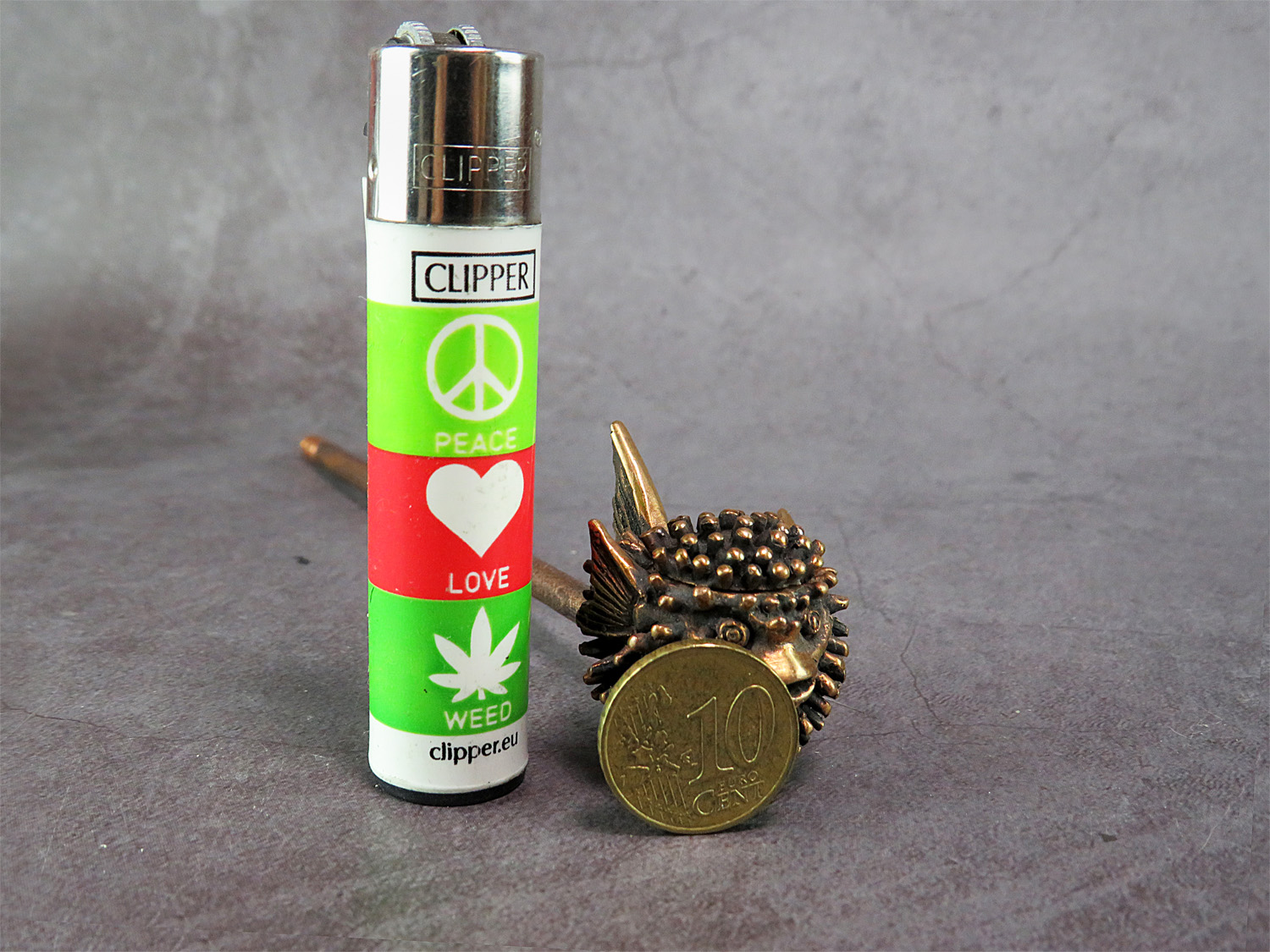 Bronze smoking pipe in the form of a funny fish - a sea urchin. The pipe is available in two versions - with the usual prickly crown and with a shaved head. The mouthpiece is made of copper, it is screwed on, can have a length (from 3 to 30 cm) and a shape at the request of the buyer. Please note that due to the nature of the design, a mouthpiece with a locking nut cannot be attached to this model. Therefore, it is better to use it with a straight mouthpiece that does not require precise angular adjustment.
