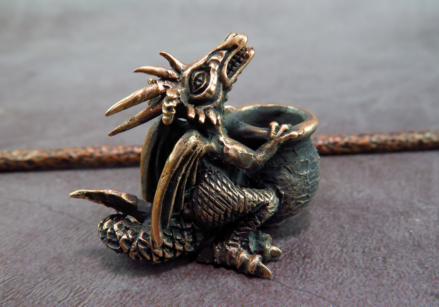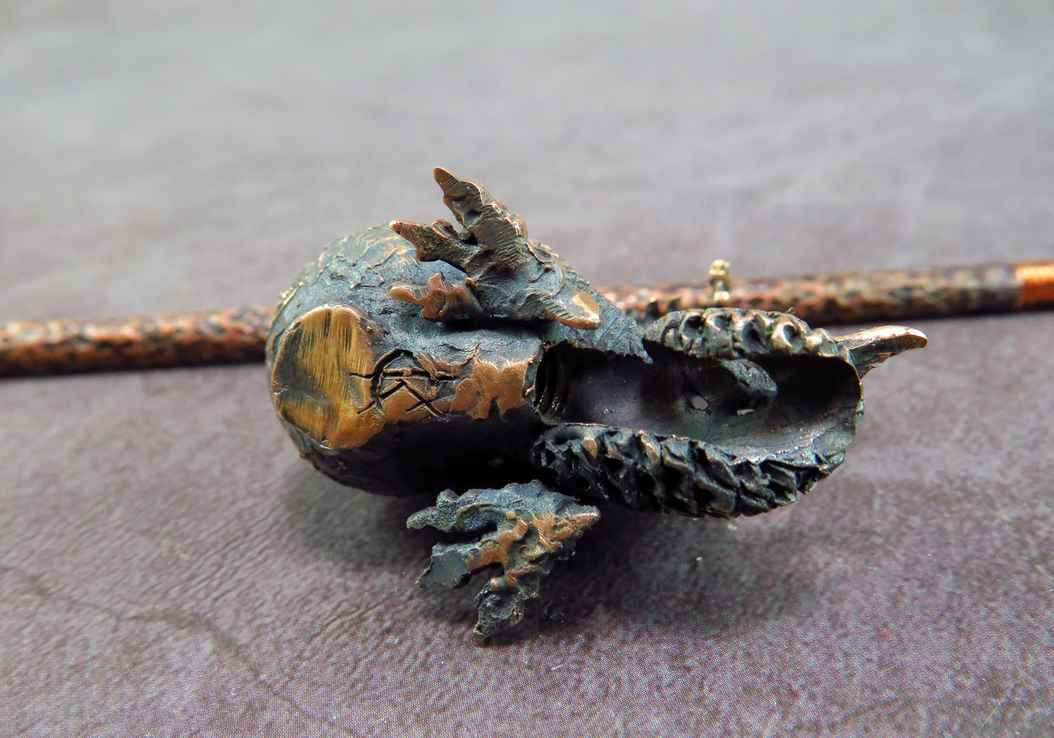 To make this item, a wax model was cut out by hand. Then, using the lost wax method, bronze parts were cast.