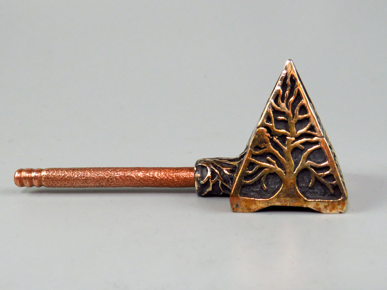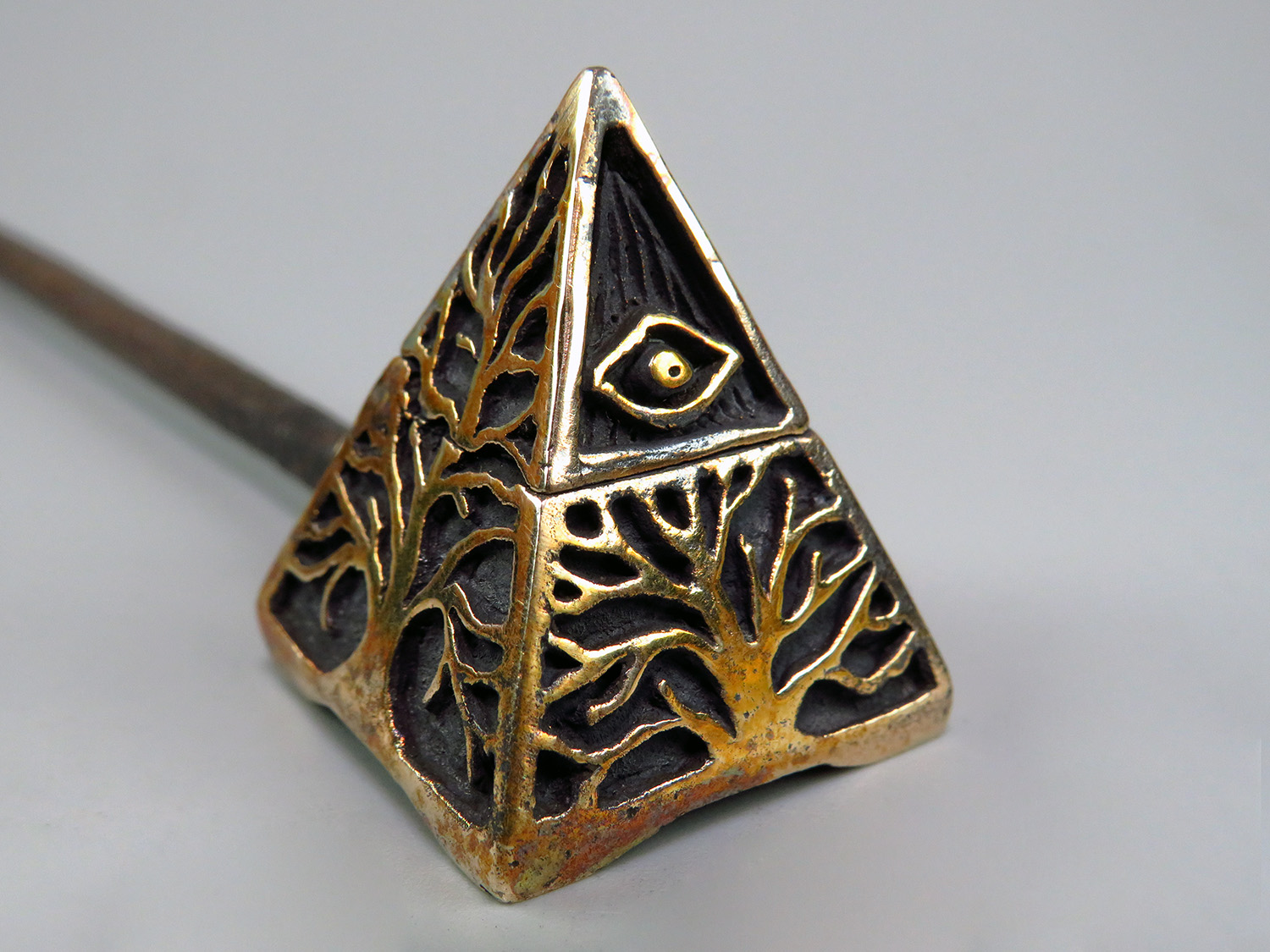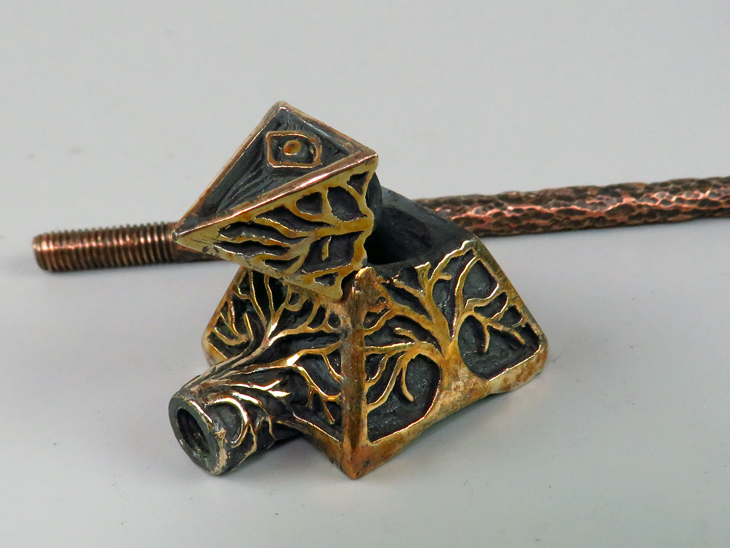 An esoteric bronze pipe inspired by ancient mysteries — featuring the All-Seeing Eye, the sacred Pyramid, and a Tree of Life growing from its base. This one-of-a-kind piece is more than a pipe: it's an artifact for those who see meaning in symbols, power in silence, and beauty in the strange.