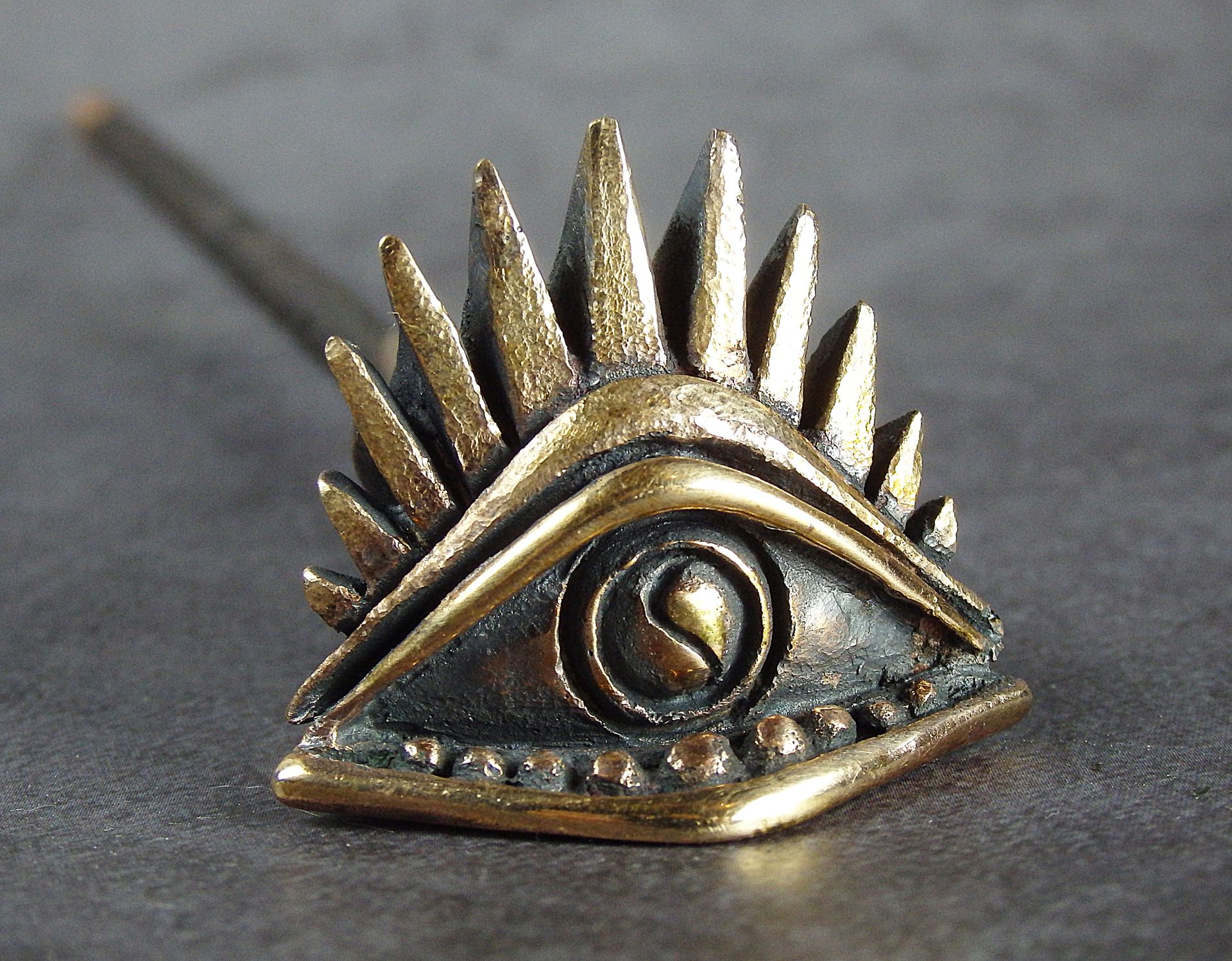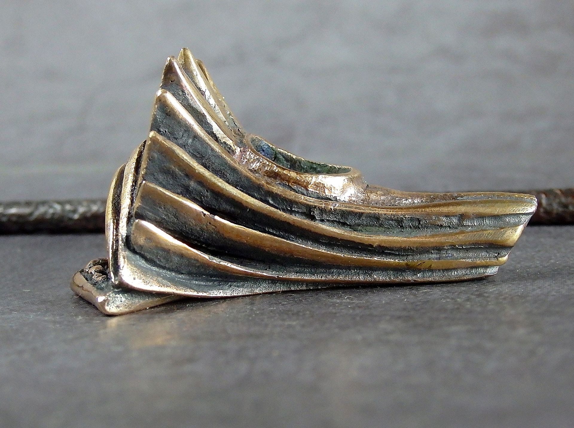 To make this item, a wax model was cut out by hand. Then, using the lost wax method, bronze parts were cast.