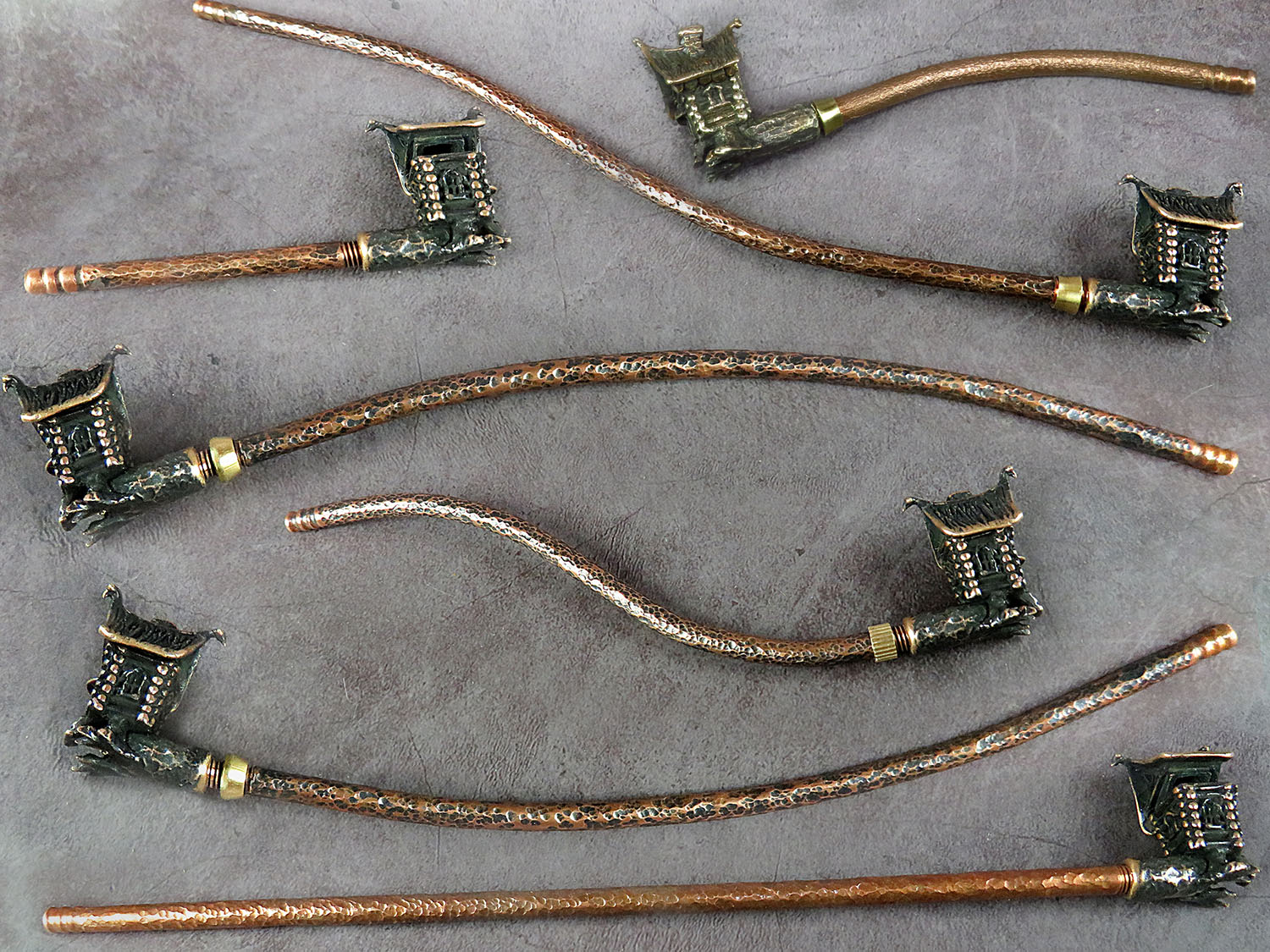 The mouthpiece is made of copper, it is screwed on, can have a length (from 3 to 30 cm) and a shape at the request of the buyer. The pipe is working, not decorative, the model is tested by the master.